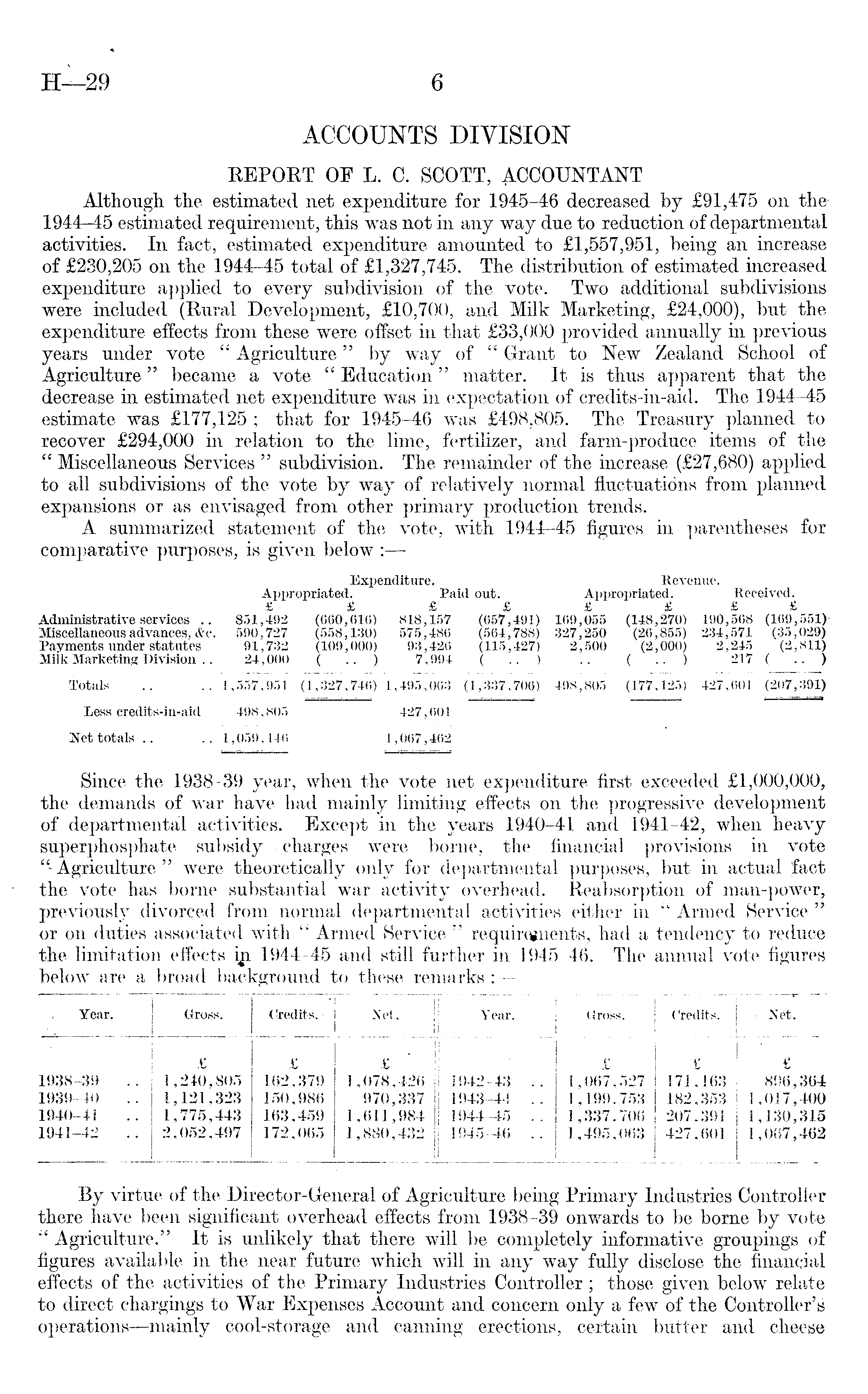 ACCOUNTS DIVISION REPORT OF L. C. SCOTT, ACCOUNTANT Although the estimated net expenditure for 1945-46 decreased by £91,475 on the--1944-45 estimated requirement, this was not in any way due to reduction of departmental activities. In fact, estimated expenditure amounted to £1,557,951, being an increase of £230,205 on the 1944-45 total of £1,327,745. The distribution of estimated increased expenditure applied to every subdivision of the vote. Two additional subdivisions were included (Rural Development, £10,700, and Milk Marketing, £24,000), but the expenditure effects from these were offset in that £33,000 provided annually in previous years under vote " Agriculture" by way of " Grant to New Zealand School of Agriculture" became a vote " Education" matter. It is thus apparent that the decrease in estimated net expenditure was in expectation of credits-in-aid. The 1944-45 estimate was £177,125 ; that for 1945-46 was £498,805. The Treasury planned to recover £294,000 in relation to the lime, fertilizer, and farm-produce items of the " Miscellaneous Services " subdivision. The remainder of the increase (£27,680) applied to all subdivisions of the vote by way of relatively normal fluctuations from planned expansions or as envisaged from other primary production trends. A summarized statement of the vote, with 1944-45 figures in parentheses for comparative purposes, is given below : Expenditure. Revenue. Appropriated. Paid out. Appropriated. Received. £ £ £ £ £ £££ Administrative services .. 851,492 (680,616) 818,157 (657,491) 169,055 (148,270) 190,568 (169,551)Miscellaneous advances, &c. 590,727 (558,130) 575,486 (564,788) 327,250 (26,855) 234,571 (35,029) Payments under statutes 91,732 (109,000) 93,426 (115,427) 2,500 (2,000) 2,245 (2,811) Milk Marketing Division .. 24,000 ( .. ) 7,994 ( .. ) .. ( .. ) 217 ( .. )• Totals .. .. 1,557,951 (1,327,746) 1,495,003 (1,337,706) 498,805 (177,125) 427,601 (207,391) Less credits-in-aid 498,805 427,601 Net totals .. .. 1,059,146 1,067,462 Since the 1938-39 year, when the vote net expenditure first exceeded £1,000,000, the demands of war have had mainly limiting effects on the progressive development of departmental activities. Except in the years 1940-41 and 1941-42, when heavy superphosphate subsidy charges were borne, the financial provisions in vote "-Agriculture" were theoretically only for departmental purposes, but in actual fact the vote has borne substantial war activity overhead. Reabsorption of man-power, previously divorced from normal departmental activities either in " Armed Service " or on duties associated with " Armed Service " requirements, had a tendency to reduce the limitation effects iji 1944-45 and still further in 1945-46. The annual vote figures below are a broad background to these remarks :