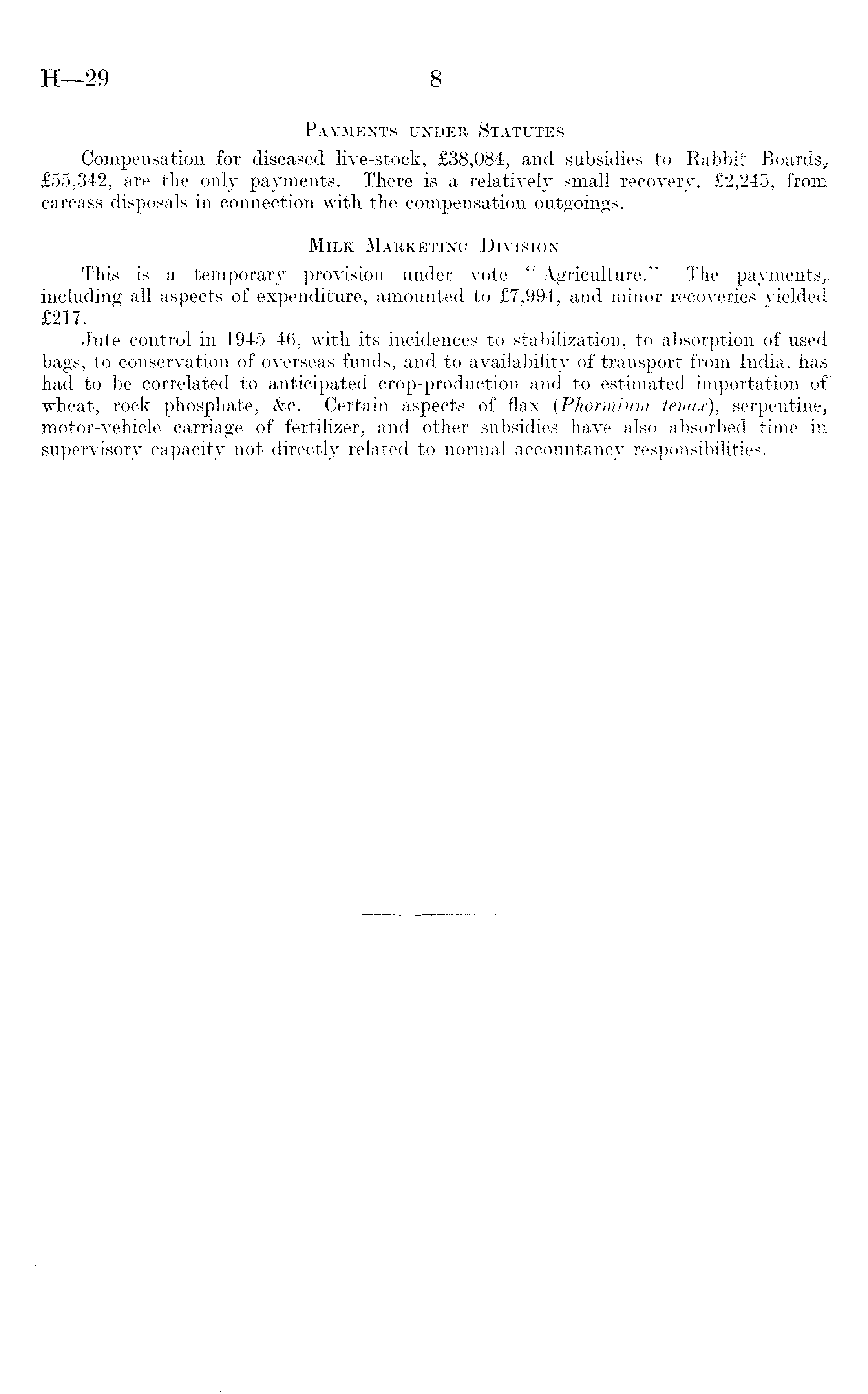 Payments under Statutes Compensation for diseased live-stock, £38,084, and subsidies to Rabbit £55,342, are the only payments. There is a relatively small recovery, £2,245, from carcass disposals in connection with the compensation outgoings. Milk Marketing Division This is a temporary provision under vote " Agriculture." The payments,, including all aspects of expenditure, amounted to £7,994, and minor recoveries yielded £217. Jute control in 1945-46, with its incidences to stabilization, to absorption of used bags, to conservation of overseas funds, and to availability of transport from India, has had to be correlated to anticipated crop-production and to estimated importation of wheat, rock phosphate, &c. Certain aspects of flax (Phormium tenax), serpentine,, motor-vehicle carriage of fertilizer, and other subsidies have also absorbed time in supervisory capacity not directly related to normal accountancy responsibilities.