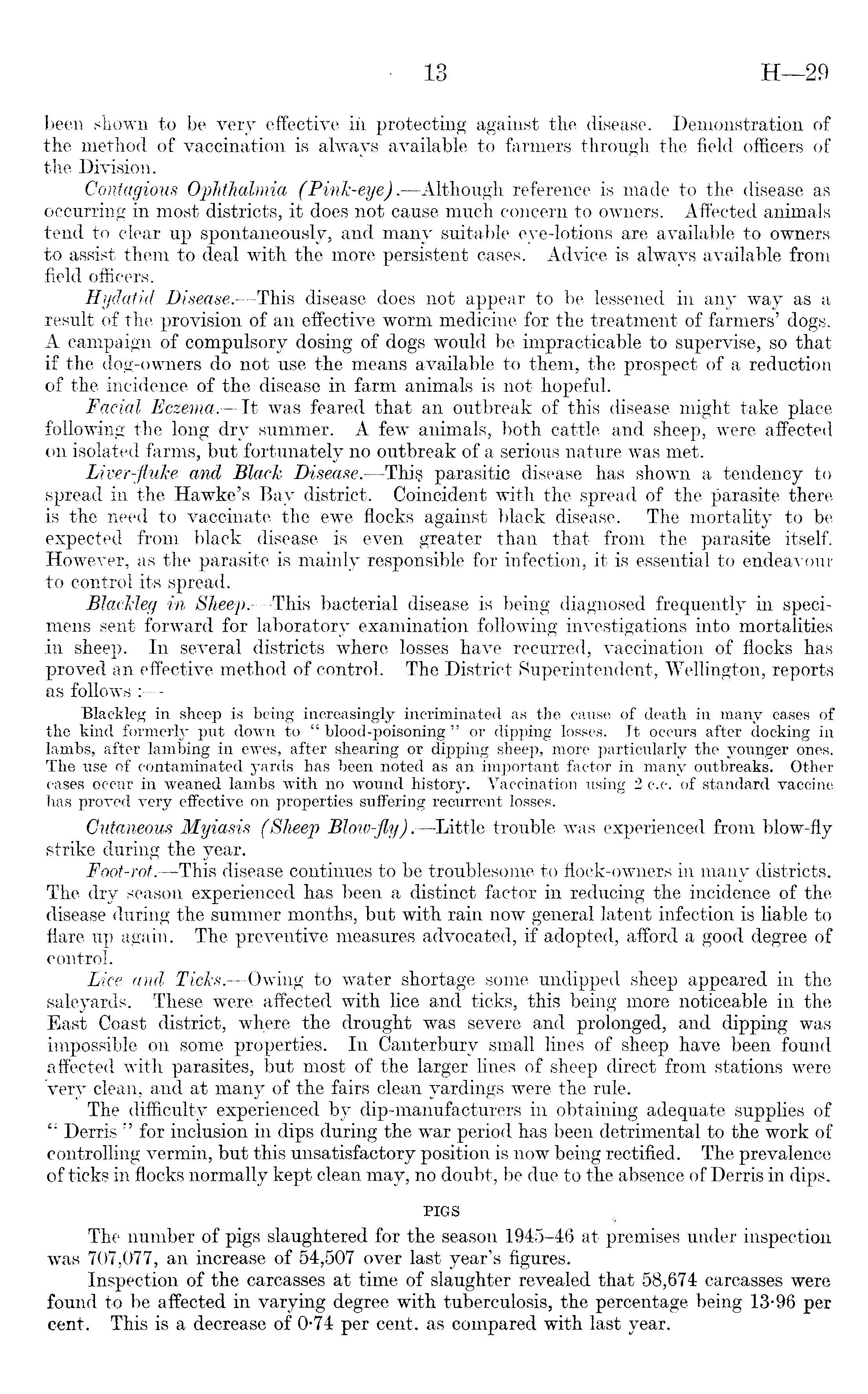been shown to be very effective in protecting against tlie disease. Demonstration of the method of vaccination is always available to farmers through the field officers of the Division. Contagious Ophthalmia (Pink-eye).—Although reference is made to the disease as occurring in most districts, it does not cause much concern to owners. Affected animals tend to clear up spontaneously, and many suitable eye-lotions are available to owners to assist them to deal with the more persistent cases. Advice is always available from field officers. Hydatid Disease.—This disease does not appear to be lessened in any way as a result of the provision of an effective worm medicine for the treatment of farmers' dogs. A campaign of compulsory dosing of dogs would be impracticable to supervise, so that if the dog-owners do not use the means available to them, the prospect of a reduction of the incidence of the disease in farm animals is not hopeful. Facial Eczema. —It was feared that an outbreak of this disease might take place following the long dry summer. A few animals, both cattle and sheep, were affected on isolated farms, but fortunately no outbreak of a serious nature was met. Liver-fluke and Black Disease. —Thi§ parasitic disease has shown a tendency to spread in the Hawke's Bay district. Coincident with the spread of the parasite there is the need to vaccinate the ewe flocks against black disease. The mortality to be expected from black disease is even greater than that from the parasite itself. However, as the parasite is mainly responsible for infection, it is essential to endeavour to control its spread. Blackleg in Sheep.—-This bacterial disease is being diagnosed frequently in specimens sent forward for laboratory examination following investigations into mortalities in sheep. In several districts where losses have recurred, vaccination of flocks has proved an effective method of control. The District Superintendent, Wellington, reports as follows : —- Blackleg in sheep is being increasingly incriminated as the cause of death in many cases of the kind formerly put down to " blood-poisoning " or dipping losses. It occurs after docking in lambs, after lambing in ewes, after shearing or dipping sheep, more particularly the younger ones. The use of contaminated yards has been noted as an important factor in many outbreaks. Other cases occur in weaned lambs with no wound history. Vaccination using 2 c.c. of standard vaccine has proved very effective on properties suffering recurrent losses. Cutaneous Myiasis (Sheep Blow-fly). —Little trouble was experienced from blow-fly strike during the year. Foot-rot.—This disease continues to be troublesome to flock-owners in many districts. The dry season experienced has been a distinct factor in reducing the incidence of the disease during the summer months, but with rain now general latent infection is liable to flare up again. The preventive measures advocated, if adopted, afford a good degree of control. Lice and Ticks. —Owing to water shortage some undipped sheep appeared in the saleyards. These were affected with lice and ticks, this being more noticeable in the East Coast district, where the drought was severe and prolonged, and dipping was impossible on some properties. In Canterbury small lines of sheep have been found affected with parasites, but most of the larger lines of sheep direct from stations were Very clean, and at many of the fairs clean yardings were the rule. The difficulty experienced by dip-manufacturers in obtaining adequate supplies of " Derris " for inclusion in dips during the war period has been detrimental to the work of controlling vermin, but this unsatisfactory position is now being rectified. The prevalence of ticks in flocks normally kept clean may, no doubt, be due to the absence of Derris in dips. PIGS The number of pigs slaughtered for the season 1945-46 at premises under inspection was 707,077, an increase of 54,507 over last year's figures. Inspection of the carcasses at time of slaughter revealed that 58,674 carcasses were found to be affected in varying degree with tuberculosis, the percentage being 13-96 per cent. This is a decrease of 0-74 per cent, as compared with last year.