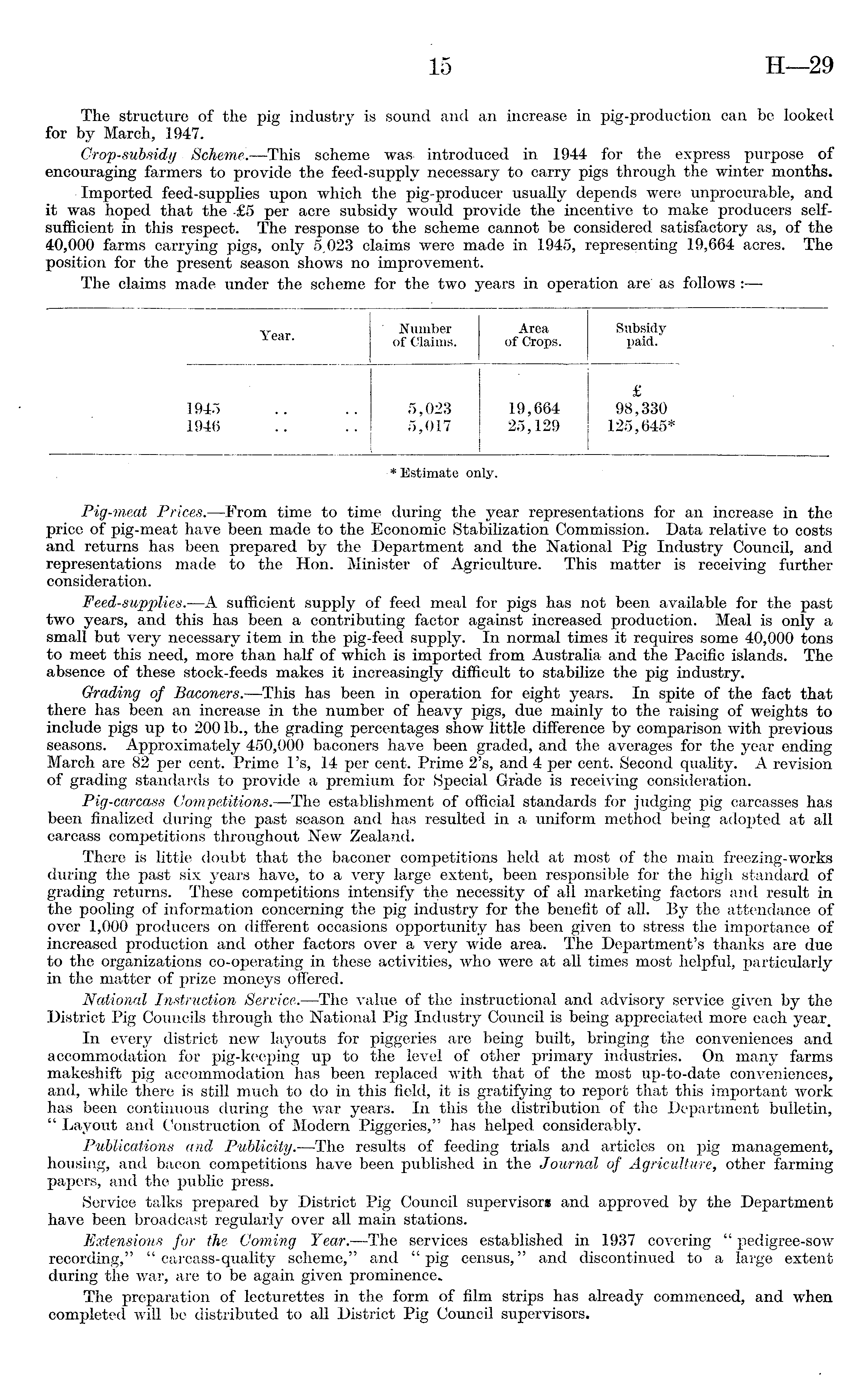 The structure of the pig industry is sound and an increase in pig-production can be looked for by March, 1947. Crop-Subsidy Scheme. —This scheme was. introduced in 1944 for the express purpose of encouraging farmers to provide the feed-supply necessary to carry pigs through the winter months. Imported feed-supplies upon which the pig-producer usually depends were unprocurable, and it was hoped that the £5 per acre subsidy would provide the incentive to make producers selfsufficient in this respect. The response to the scheme cannot be considered satisfactory as, of the 40,000 farms carrying pigs, only 5,023 claims were made in 1945, representing 19,664 acres. The position for the present season shows no improvement. The claims made under the scheme for the two years in operation are as follows :