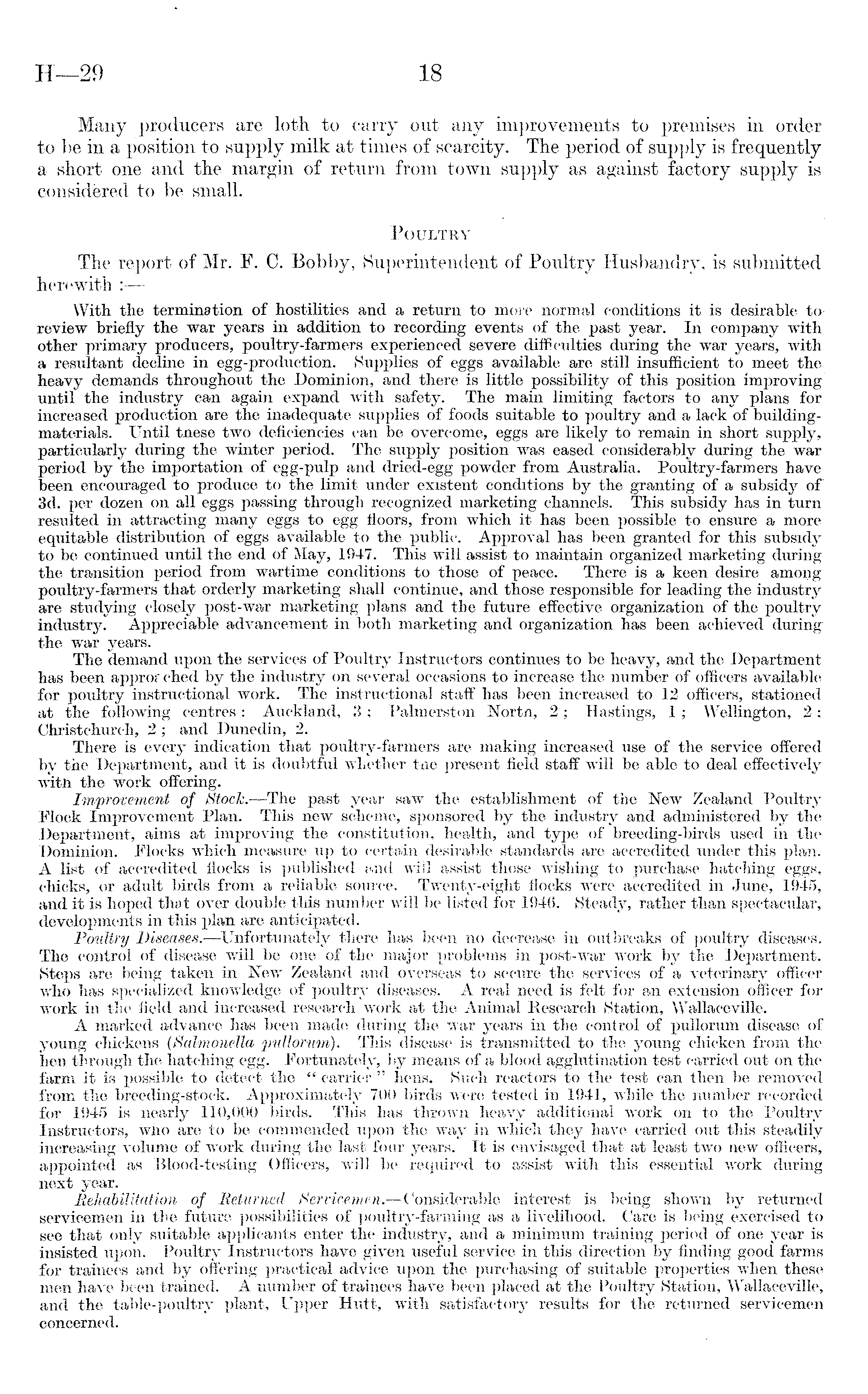 Many producers are loth to carry out any improvements to premises in orderto be in a position to supply milk at times of scarcity. The period of supply is frequently a short one and the margin of return from town supply as against factory supply is considered to be small. Poultry The report of Mr. F. C. Bobby, Superintendent of Poultry Husbandry, is submitted herewith : With the termination of hostilities and a return to more normal conditions it is desirable toreview briefly the war years in addition to recording events of the past year. In company with other primary producers, poultry-farmers experienced severe difficulties during the war years, with a resultant decline in egg-production. Supplies of eggs available are still insufficient to meet the heavy demands throughout the Dominion, and there is little possibility of this position improving until the industry can again expand with safety. The main limiting factors to any plans for increased production are the inadequate supplies of foods suitable to poultry and a lack of buildingmaterials. Until tnese two deficiencies can be overcome, eggs are likely to remain in short supply, particularly during the winter period. The supply position was eased considerably during the war period by the importation of egg-pulp and dried-egg powder from Australia. Poultry-farmers have been encouraged to produce to the limit under existent conditions by the granting of a subsidy of 3d. per dozen on all eggs passing through recognized marketing channels. This subsidy has in turn resulted in attracting many eggs to egg floors, from which it has been possible to ensure a more equitable distribution of eggs available to the public. Approval has been granted for this subsidy to be continued until the end of May, 1947. This will assist to maintain organized marketing during the transition period from wartime conditions to those of peace. There is a keen desire among poultry-farmers that orderly marketing shall continue, and those responsible for leading the industry are studying closely post-war marketing plans and the future effective organization of the poultry industry. Appreciable advancement in both marketing and organization has been achieved during the war years. The demand upon the services of Poultry Instructors continues to be heavy, and the Department has been appro? ched by the industry on several occasions to increase the number of officers available for poultry instructional work. The instructional staff has been increased to 12 officers, stationed at the following centres: Auckland, 3 ; Palmerston Nortn, 2; Hastings, 1 ; Wellington, 2; Christchurch, 2 ; and Dunedin, 2. There is every indication that poultry-farmers are making increased use of the service offered by the Department, and it is doubtful whether trie present field staff will be able to deal effectively witli the work offering. Improvement of Stock. —The past year saw the establishment of the New Zealand Poultry Flock Improvement Plan. This new scheme, sponsored by the industry and administered by the Department, aims at improving the constitution, health, and type of breeding-birds used in the Dominion. Flocks which measure up to certain desirable standards are accredited under this plan. A list of accredited flocks is published and will assist those wishing to purchase hatching eggs, chicks, or adult birds from a reliable source. Twenty-eight flocks were accredited in June, 1945, and it is hoped that over double this number will be listed for 1946. Steady, rather than spectacular, developments in this plan are anticipated. Poultry Diseases. —Unfortunately there has been no decrease in outbreaks of poultry diseases. The control of disease will be one of the major problems in post-war work by the Department. Steps are being taken in New Zealand and overseas to secure the services of a veterinary officer who has specialized knowledge of poultry diseases. A real need is felt for an extension officer for work in the field and increased research work at the Animal Research Station, Wallaceville. A marked advance has been made during the war years in the control of pullorum disease of young chickens (Salmonella pullorum). This disease is transmitted to the young chicken from the hen through the hatching egg. Fortunately, by means of a blood agglutination test carried out on the farm it is possible to detect the " carrier " hens. Such reactors to the test can then be removed from the breeding-stock. Approximately 700 birds were tested in 1941, while the number recorded for 1945 is nearly 110,000 birds. This has thrown heavy additional work on to the Poultry Instructors, who are to be commended upon, the way in which they have carried out this steadily increasing volume of work during the last four years. It is envisaged that at least two new officers, appointed as Blood-testing Officers, will be required to assist with this essential work during next year. Rehabilitation of Returned Servicemen. —Considerable interest is being shown by returned servicemen in the future possibilities of poultry-farming as a livelihood. Care is being exercised to see that only suitable applicants enter the industry, and a minimum training period of one year is insisted upon. Poultry Instructors have given useful service in this direction by finding good farms for trainees and by offering practical advice upon the purchasing of suitable properties when these men have, been trained. A number of trainees have been placed at the Poultry Station, Wallaceville, and the table-poultry plant, Upper Hutt, with satisfactory results for the returned servicemen concerned.