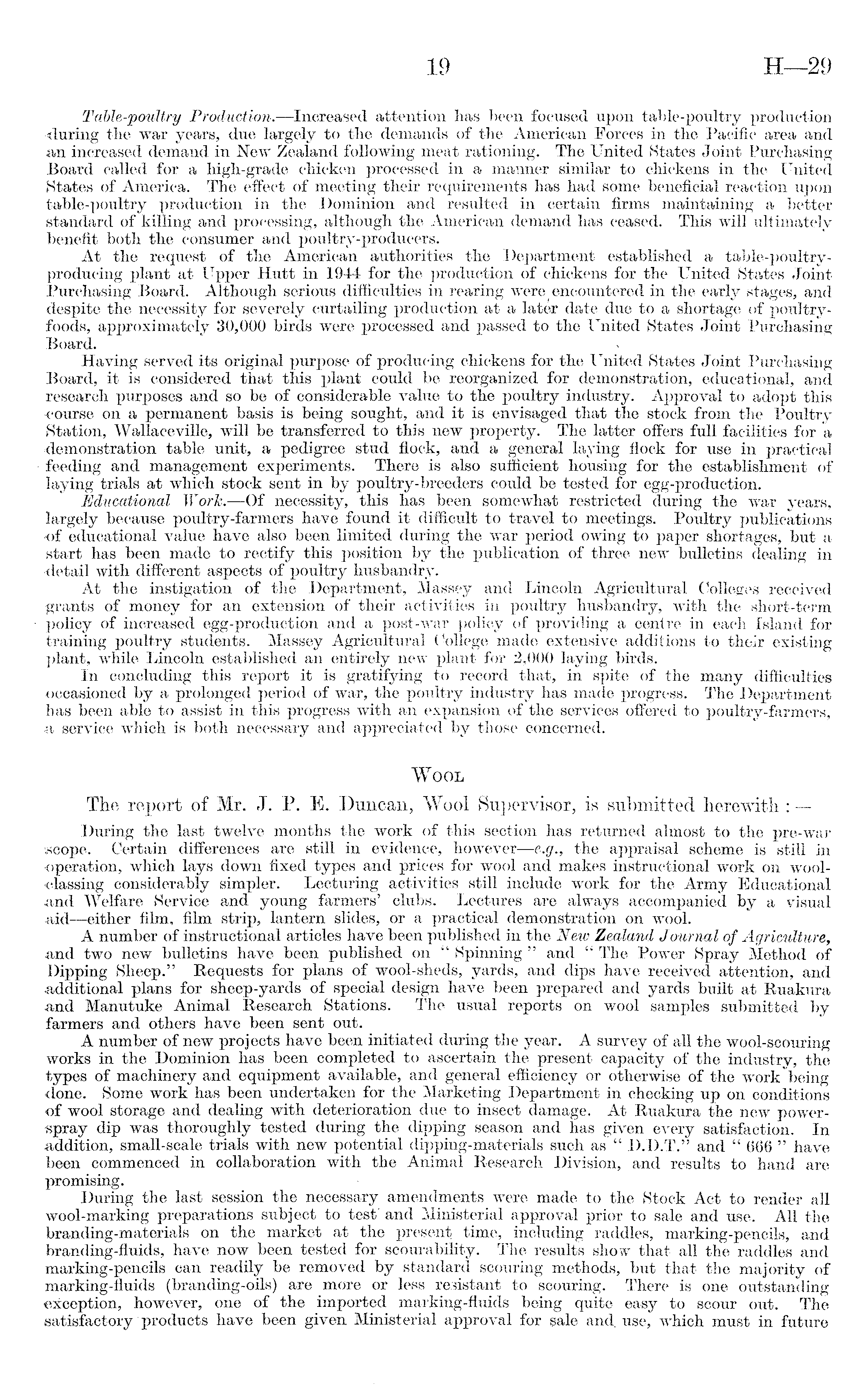 Table-poultry Production. —Increased attention has been focused upon table-poultry production -during the war years, due largely to the demands of the American Forces in the Pacific area and an increased demand in New Zealand following meat rationing. The United States Joint Purchasing Board called for a high-grade chicken processed in a manner similar to chickens in the United States of America. The effect of meeting their requirements has had some beneficial reaction upon table-poultry production in the Dominion and resulted in certain firms maintaining a better standard of killing and processing, although the American demand has ceased. This will ultimately benefit both the consumer and poultry-producers. At the request of the American authorities the Department established a table-poultry-producing plant at Upper Hutt in 1944 for the production of chickens for the United States Joint Purchasing Board. Although serious difficulties in rearing were encountered in the early stages, and despite the necessity for severely curtailing production at a later date due to a shortage of poultryfoods, approximately 30,000 birds were processed and passed to the United States Joint Purchasing Board. Having served its original purpose of producing chickens for the United States Joint Purchasing Board, it is considered that this plant could be reorganized for demonstration, educational, and research purposes and so be of considerable value to the poultry industry. Approval to adopt this •course on a permanent basis is being sought, and it is envisaged that the stock from the Poultry Station, Wallaceville, will be transferred to this new property. The latter offers full facilities for a ■demonstration table unit, a pedigree stud flock, and a general laying flock for use in practical feeding and management experiments. There is also sufficient housing for the establishment of laying trials at which stock sent in by poultry-breeders could be tested for egg-production. Educational Work. —Of necessity, this has been somewhat restricted during the war years, largely because poultry-farmers have found it difficult to travel to meetings. Poultry publications of educational value have also been limited during the war period owing to paper shortages, but a start- has been made to rectify this position by the publication of three new bulletins dealing in •detail with different aspects of poultry husbandry. At the instigation of the Department, Massey and Lincoln Agricultural Colleges received grants of money for an extension of their activities in poultry husbandry, with the short-term policy of increased egg-production and a post-war policy of providing a centre in each Island for training poultry students. Massey Agricultural College made extensive additions to their existing plant, while Lincoln established an entirely new plant for 2,000 laying birds. In concluding this report it is gratifying to record that, in spite of the many difficulties •occasioned by a prolonged period of war, the poultry industry has made progress. The Department has been able to assist in this progress with an expansion of the services offered to poultry-farmers, a service which is both necessary and appreciated by those concerned. Wool The report of Mr. J. P. E. Duncan, Wool Supervisor, is submitted herewith : During the last twelve months the work of this section has returned almost to the pre-war scope. Certain differences are still in evidence, however —e.g., the appraisal scheme is still in operation, which lays down fixed types and prices for wool and makes instructional work on woolclassing considerably simpler. Lecturing activities still include work for the Army Educational and Welfare Service and young farmers' clubs. Lectures are always accompanied by a visual aid—either film, film strip, lantern slides, or a practical demonstration on wool. A number of instructional articles have been published in the New Zealand Journal of Agriculture, and two new bulletins have been published on " Spinning " and " The Power Spray Method of Dipping Sheep." Requests for plans of wool-sheds, yards, and dips have received attention, and additional plans for sheep-yards of special design have been prepared and yards built at Ruakura and Manutuke Animal Research Stations. The usual reports on wool samples submitted by farmers and others have been sent out. A number of new projects have been initiated during the year. A survey of all the wool-scouring works in the Dominion has been completed to ascertain the present capacity of the industry, the types of machinery and equipment available, and general efficiency or otherwise of the work "being done. Some work has been undertaken for the Marketing Department in checking up on conditions of wool storage and dealing with deterioration due to insect damage. At Ruakura the new powerspray dip was thoroughly tested during the dipping season and has given every satisfaction. In addition, small-scale trials with new potential dipping-materials such as " D.D.T." and " 666 " have been commenced in collaboration with the Animal Research Division, and results to hand are promising. During the last session the necessary amendments were made to the Stock Act to render all wool-marking preparations subject to test and Ministerial approval prior to sale and use. All the branding-materials on the market at the present time, including raddles, marking-pencils, and branding-fluids, have now been tested for scourability. The results show that all the raddles and marking-pencils can readily be removed by standard scouring methods, but that the majority of marking-fluids (branding-oils) are more or less resistant to scouring. There is one outstanding exception, however, one of the imported marking-fluids being quite easy to scour out. The satisfactory products have been given Ministerial approval for sale and use, which must in future