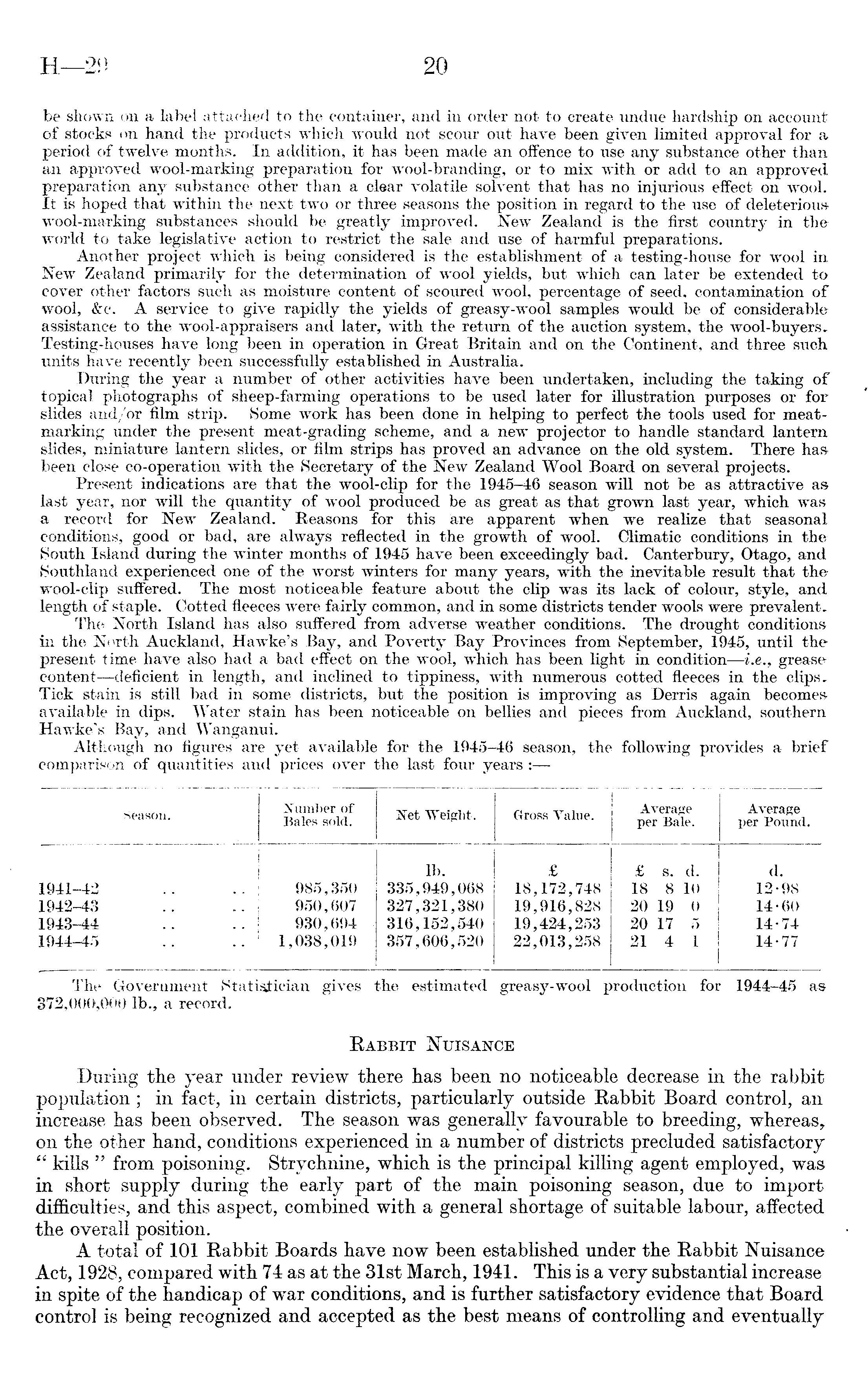 The Government Statistician gives the estimated greasy-wool production for 1944-45 as 372,000,000 lb., a record. Rabbit Nuisance During the year under review there has been no noticeable decrease in the rabbit population ; in fact, in certain districts, particularly outside Rabbit Board control, an increase has been observed. The season was generally favourable to breeding, whereas, on the other hand, conditions experienced in a number of districts precluded satisfactory " kills " from poisoning. Strychnine, which is the principal killing agent employed, was in short supply during the early part of the main poisoning season, due to import difficulties, and this aspect, combined with a general shortage of suitable labour, affected the overall position. A total of 101 Rabbit Boards have now been established under the Rabbit Nuisance Act, 1928, compared with 74 as at the 31st March, 1941. This is a very substantial increase in spite of the handicap of war conditions, and is further satisfactory evidence that Board control is being recognized and accepted as the best means of controlling and eventually