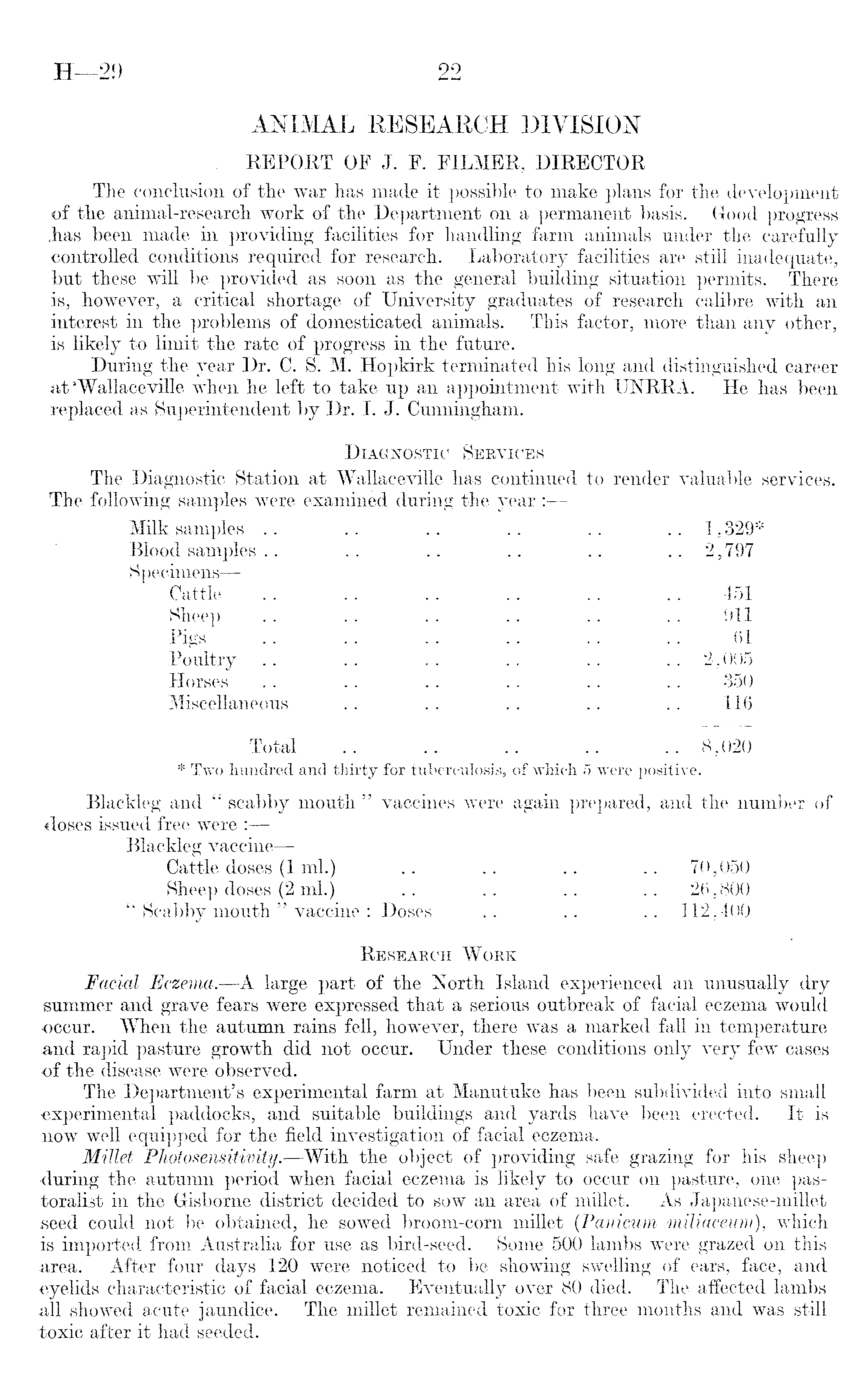 ANIMAL RESEARCH DIVISION , REPORT OF J. F. FILMER, DIRECTOR Tlie conclusion of the war has made it possible to make plans for the development of the animal-research work of the Department on a permanent basis. Good progress .has been made in providing facilities for handling farm animals under the carefullycontrolled conditions required for research. Laboratory facilities are still inadequate, but these will be provided as soon as the general building situation permits. There is, however, a critical shortage of University graduates of research calibre with an interest in the problems of domesticated animals. This factor, more than any other, is likely to limit the rate of progress in the future. During the year Dr. C. S. M. Hopkirk terminated his long and distinguished career at*Wallaceville when he left to take up an appointment with UNRRA. He has been replaced as Superintendent by Dr. I. J. Cunningham. Diagnostic Services The Diagnostic Station at Wallaceville has continued to render valuable services. The following samples were examined during the year : Milk samples .. .. .. .. .. 1, 329* Blood samples .. .. .. .. .. .. 2,797 Specimens — Cattle .. .. .. .. .. .. 451 Sheep .. .. .. .. .. .. 911 Pigs .. .. .. .. .. .. 61 Poultry .. .. .. .. .. .. 2,005 Horses .. .... .. .. .. 350 Miscellaneous .. .. .. .. .. 116 Total .. .. .. .. .. 8 j 020 * Two hundred and thirty for tuberculosis, of which 5 were positive. Blackleg and " scabby mouth " vaccines were again prepared, and the number of doses issued free were : Blackleg vaccine— Cattle doses (1 ml.) .. .. .. .. 70,050 Sheep doses (2 ml.) .. .. .. .. 26,800 " Scabby mouth" vaccine: Doses .. .. .. 112 ,400 Research Work Facial Eczema.—A. large part of the North Island experienced an unusually dry summer and grave fears were expressed that a serious outbreak of facial eczema would occur. When the autumn rains fell, however, there was a marked fall in temperature and rapid pasture growth did not occur. Under these conditions only very few cases of the disease were observed. The Department's experimental farm at Manutuke has been subdivided into small experimental paddocks, and suitable buildings and yards have been erected. It is now well equipped for the field investigation of facial eczema. Millet Photosensitivity.—With the object of providing safe grazing for his sheep during the autumn period when facial eczema is likely to occur on pasture, one pastoralist in the Gisborne district decided to sow an area of millet. As Japanese-millet seed could not be obtained, he sowed broom-corn millet (Panicum miliaceum), which is imported from Australia for use as bird-seed. Some 500 lambs were grazed on this area. After four days 120 were noticed to be showing swelling of ears, face, and eyelids characteristic of facial eczema. Eventually over 80 died. The affected lambs all showed acute jaundice. The millet remained toxic for three months and was still toxic after it had seeded.
