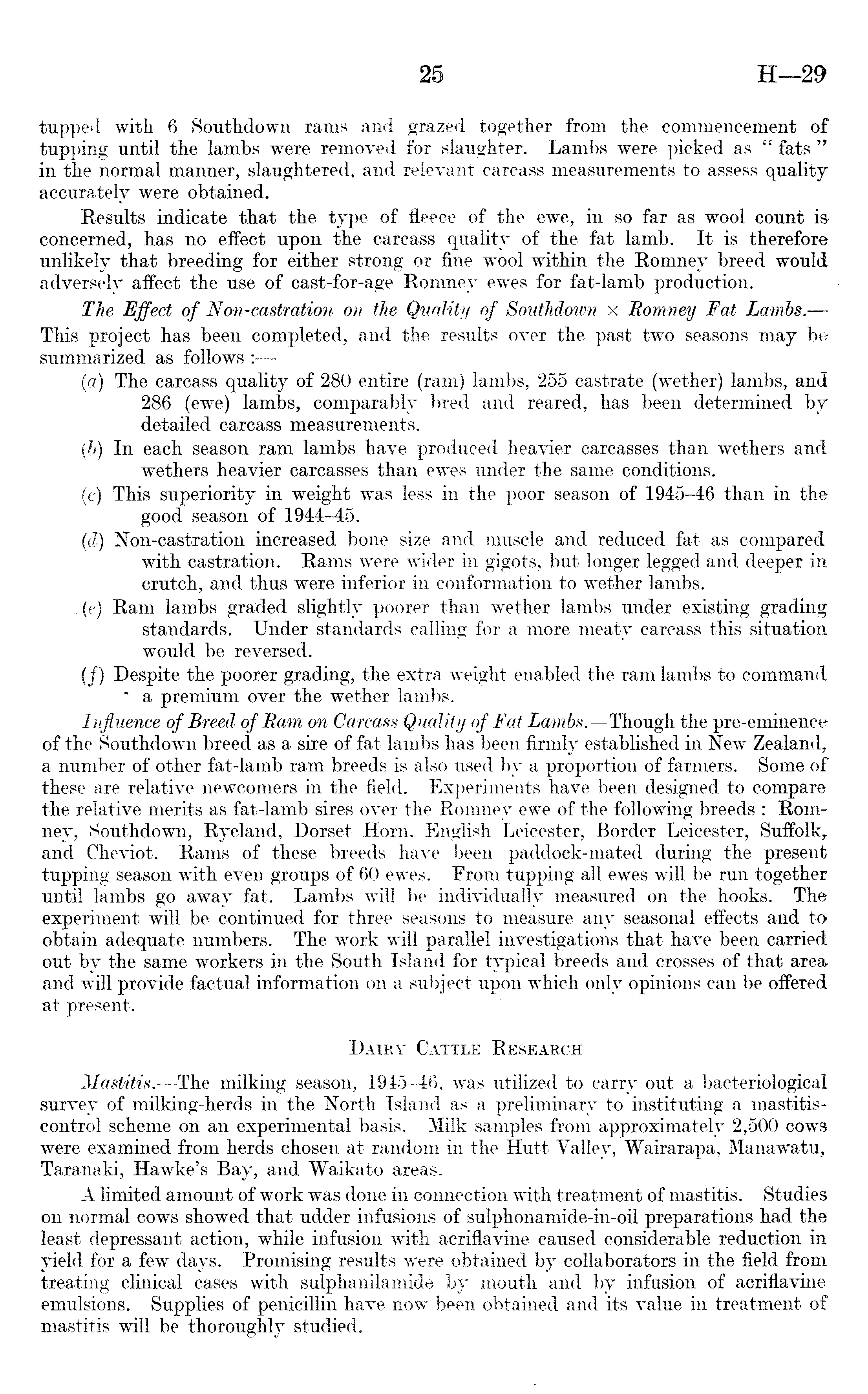 tupped with 6 Southdown rams and grazed together from the commencement of tupping until the lambs were removed for slaughter. Lambs were picked as " fats " in the normal manner, slaughtered, and relevant carcass measurements to assess quality accurately were obtained. Results indicate that the type of fleece of the ewe, in so far as wool count isconcerned, has no effect upon the carcass quality of the fat lamb. It is therefore unlikely that breeding for either strong or fine wool within the Romney breed would adversely affect the use of cast-for-age Romney ewes for fat-lamb production. The Effect of Non-castration on the Quality of Southdown x Romney Fat Lambs.— This project has been completed, and the results over the past two seasons may be summarized as follows : (a) The carcass quality of 280 entire (ram) lambs, 255 castrate (wether) lambs, and 286 (ewe) lambs, comparably bred and reared, has been determined by detailed carcass measurements. (b) In each season ram lambs have produced heavier carcasses than wethers and wethers heavier carcasses than ewes under the same conditions. (c) This superiority in weight was less in the poor season of 1945-46 than in the good season of 1944-45. (d) Non-castration increased bone size and muscle and reduced fat as compared with castration. Rams were wider in gigots, but longer legged and deeper in crutch, and thus were inferior in conformation to wether lambs. , (e) Ram lambs graded slightly poorer than wether lambs under existing grading standards. Under standards calling for a more meaty carcass this situation would be reversed. (/) Despite the poorer grading, the extra weight enabled the ram lambs to command * a premium over the wether lambs. Influence of Breed of Ram on Carcass Quality of Fat Lambs.—Though the pre-eminence of the Southdown breed as a sire of fat lambs has been firmly established in New Zealand, a number of other fat-lamb ram breeds is also used by a proportion of farmers. Some of these are relative newcomers in the field. Experiments have been designed to compare the relative merits as fat-lamb sires over the Romney ewe of the following breeds : Romney, Southdown, Ryeland, Dorset Horn, English Leicester, Border Leicester, Suffolk, and Cheviot. Rams of these breeds have been paddock-mated during the present tupping season with even groups of 60 ewes. . From tupping all ewes will be run together until lambs go away fat. Lambs will be individually measured on the hooks. The experiment will be continued for three seasons to measure any seasonal effects and to obtain adequate numbers. The work will parallel investigations that have been carried out by the same workers in the South Island for typical breeds and crosses of that area and will provide factual information on a subject upon which only opinions can be offered at present. Dairy Cattle Research Mastitis.—The milking season, 1945-46, was utilized to carry out a bacteriological survey of milking-herds in the North Island as a preliminary to instituting a mastitiscontrol scheme on an experimental basis. Milk samples from approximately 2,500 cows were examined from herds chosen at random in the Hutt Yallev, Wairarapa, Manawatu, Taranaki, Hawke's Bay, and Waikato areas. A limited amount of work was done in connection with treatment of mastitis. Studies on normal cows showed that udder infusions of sulphonamide-in-oil preparations had the least depressant action, while infusion with acriflavine caused considerable reduction in yield for a few days. Promising results were obtained by collaborators in the field from treating clinical cases with sulphanilamide by mouth and by infusion of acriflavine emulsions. Supplies of penicillin have now been obtained and its value in treatment of mastitis will be thoroughly studied.