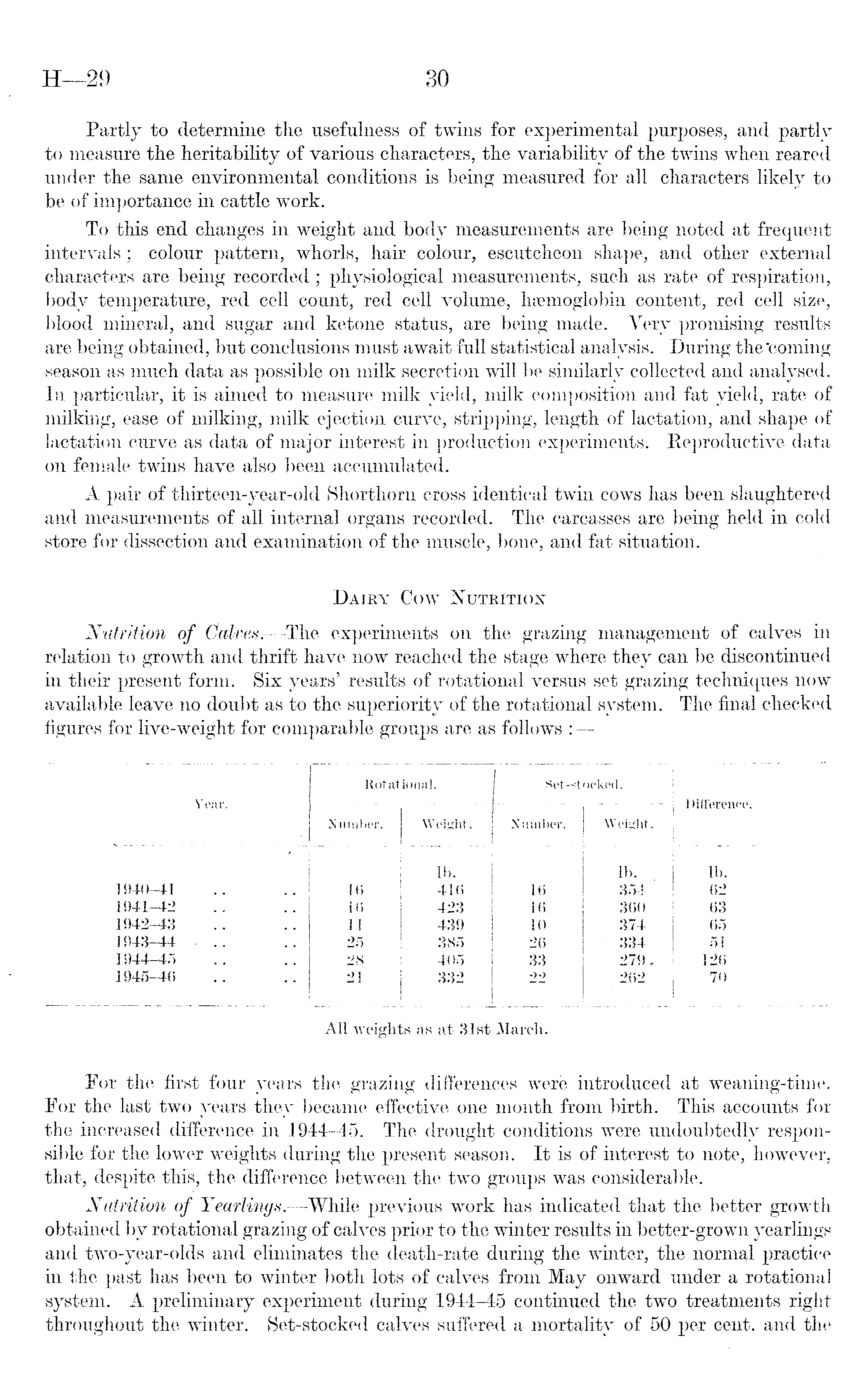Partly to determine the usefulness of twins for experimental purposes, and partly to measure tlie heritability of various characters, the variability of the twins when reared under the same environmental conditions is being measured for all characters likely to be of importance in cattle work. To this end changes in weight and body measurements are being noted at frequent intervals ; colour pattern, whorls, hair colour, escutcheon shape, and other external characters are being recorded ; physiological measurements, such as rate of respiration, body temperature, red cell count, red cell volume, haemoglobin content, red cell size, blood mineral, and sugar and ketone status, are being made. Very promising results are being obtained, but conclusions must await full statistical analysis. During the "coming season as much data as possible on milk secretion will be similarly collected and analysed. In particular, it is aimed to measure milk yield, milk composition and fat yield, rate of milking, ease of milking, milk ejection curve, stripping, length of lactation, and shape of lactation curve as data of major interest in production experiments. Reproductive data on female twins have also been accumulated. A pair of thirteen-year-old Shorthorn cross identical twin cows has been slaughtered and measurements of all internal organs recorded. The carcasses are being held in cold store for dissection and examination of the muscle, bone, and fat situation. Dairy Cow Nutrition Nutrition of Calves.—The experiments on the grazing management of calves in relation to growth and thrift have now reached the stage where they can be discontinued in their present form. Six years' results of rotational versus set grazing techniques now available leave no doubt as to the superiority of the rotational system. The final checked figures for live-weight for comparable groups are as follows :