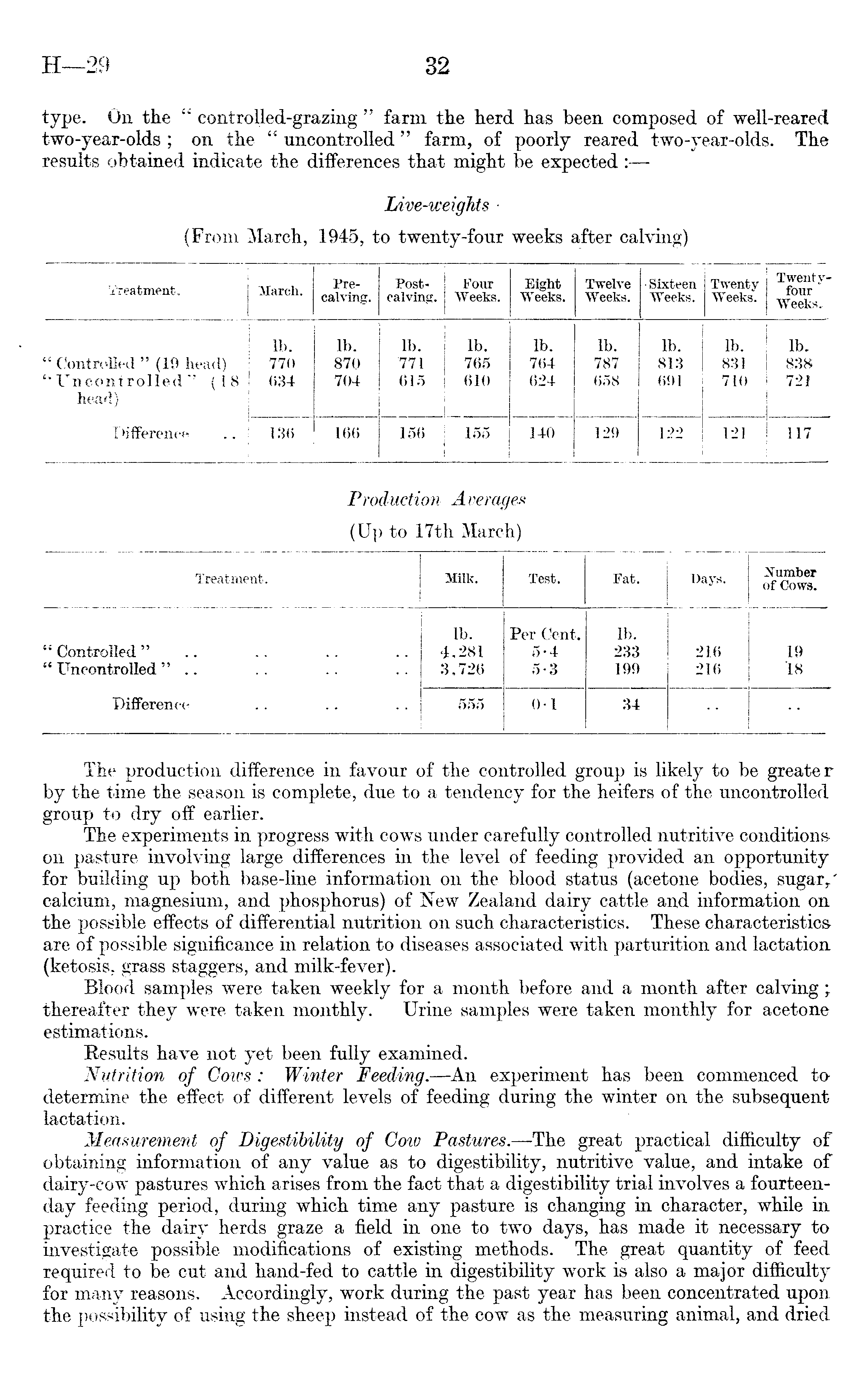 The production difference in favour of the controlled group is likely to be greater by the time the season is complete, due to a tendency for the heifers of the uncontrolled group to dry off earlier. The experiments in progress with cows under carefully controlled nutritive conditionson pasture involving large differences in the level of feeding provided an opportunity for building up both base-line information on the blood status (acetone bodies, sugar/ calcium, magnesium, and phosphorus) of New Zealand dairy cattle and information on the possible effects of differential nutrition on such characteristics. These characteristicsare of possible significance in relation to diseases associated with parturition and lactation (ketosis, grass staggers, and milk-fever). Blood samples were taken weekly for a month before and a month after calving ; thereafter they were taken monthly. Urine samples were taken monthly for acetone estimations. Results have not yet been fully examined. Nutrition of Coivs: Winter Feeding.—An experiment has been commenced to determine the effect of different levels of feeding during the winter on the subsequent lactation. Measurement of Digestibility of Cow Pastures.—The great practical difficulty of obtaining information of any value as to digestibility, nutritive value, and intake of dairy-cow pastures which arises from the fact that a digestibility trial involves a fourteenday feeding period, during which time any pasture is changing in character, while in practice the dairy herds graze a field in one to two days, has made it necessary to investigate possible modifications of existing methods. The great quantity of feed required to be cut and hand-fed to cattle in digestibility work is also a major difficulty for many reasons. Accordingly, work during the past year has been concentrated upon the possibility of using the sheep instead of the cow as the measuring animal, and dried