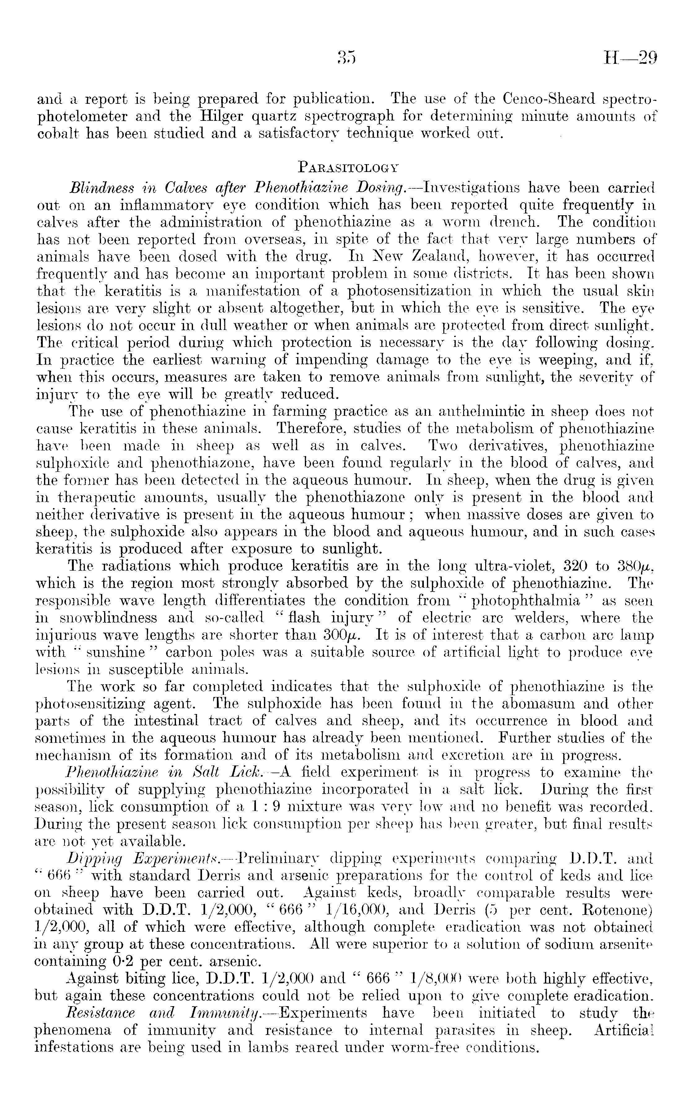 and a report is being prepared for publication. The use of the Cenco-Sheard spectrophotelometer and the Hilger quartz spectrograph for determining minute amounts of cobalt has been studied and a satisfactory technique worked out. Parasitology Blindness in Calves after Phenothiazine Dosing.—lnvestigations have been carried out on an inflammatory eye condition which has been reported quite frequently in calves after the administration of phenothiazine as a worm drench. The condition has not been reported from overseas, in spite of the fact that very large numbers of animals have, been dosed with the drug. In New Zealand, however, it has occurred frequently and has become an important problem in some districts. It has been shown that the keratitis is a manifestation of a photosensitization in which the usual skin lesions are very slight or absent altogether, but in which the eye is sensitive. The eye lesions do not occur in dull weather or when animals are protected from direct sunlight. The critical period during which protection is necessary is the day following dosing. In practice the earliest warning of impending damage to the eye is weeping, and if, when this occurs, measures are taken to remove animals from sunlight, the severity of injury to the eye will be greatly reduced. The use of phenothiazine in farming practice as an anthelmintic in sheep does not cause keratitis in these animals. Therefore, studies of the metabolism of phenothiazine have been made in sheep as well as in calves. Two derivatives, phenothiazine sulphoxide and phenothiazone, have been found regularly in the blood of calves, and the former has been detected in the aqueous humour. In sheep, when the drug is given in therapeutic amounts, usually the phenothiazone only is present in the blood and neither derivative is present in the aqueous humour; when massive doses are given to sheep, the sulphoxide also appears in the blood and aqueous humour, and in such cases keratitis is produced after exposure to sunlight. The radiations which produce keratitis are in the long ultra-violet, 320 to 380ja, which is the region most strongly absorbed by the sulphoxide of phenothiazine. The responsible wave length differentiates the condition from " photophthalmia " as seen in snowblindness and so-called " flash injury" of electric arc welders, where the injurious wave lengths are shorter than 300/u,. It is of interest that a carbon arc lamp with " sunshine " carbon poles was a suitable source of artificial light to produce eye lesions in susceptible animals. The work so far completed indicates that the sulphoxide of phenothiazine is the photosensitizing agent. The sulphoxide has been found in the abomasum and other parts of the intestinal tract of calves and sheep, and its occurrence in blood and sometimes in the aqueous humour has already been mentioned. Further studies of the mechanism of its formation and of its metabolism and excretion are in progress. Phenothiazine %n Salt Lick.—A field experiment is in progress to examine the possibility of supplying phenothiazine incorporated in a salt lick. During the first season, lick consumption of a 1 : 9 mixture was very low and no benefit was recorded. During the present season lick consumption per sheep has been greater, but final results are not yet available. Dipping Experiments.—Preliminary dipping experiments comparing D.D.T. and " 666 " with standard Derris and arsenic preparations for the control of keds and lice on sheep have been carried out. Against keds, broadly comparable results were obtained with D.D.T. 1/2,000, " 666 " 1/16,000, and Derris (5 per cent. Rotenone) 1/2,000, all of which were effective, although complete eradication was not obtained in any group at these concentrations. All were superior to a solution of sodium arsenite containing 0-2 per cent, arsenic. Against biting lice, D.D.T. 1/2,000 and " 666 " 1/8,000 were both highly effective, but again these concentrations could not be relied upon to give complete eradication. Resistance and Immunity.—Experiments have been initiated to study the phenomena of immunity and resistance to internal parasites in sheep. Artificial infestations are being used in lambs reared under worm-free conditions.