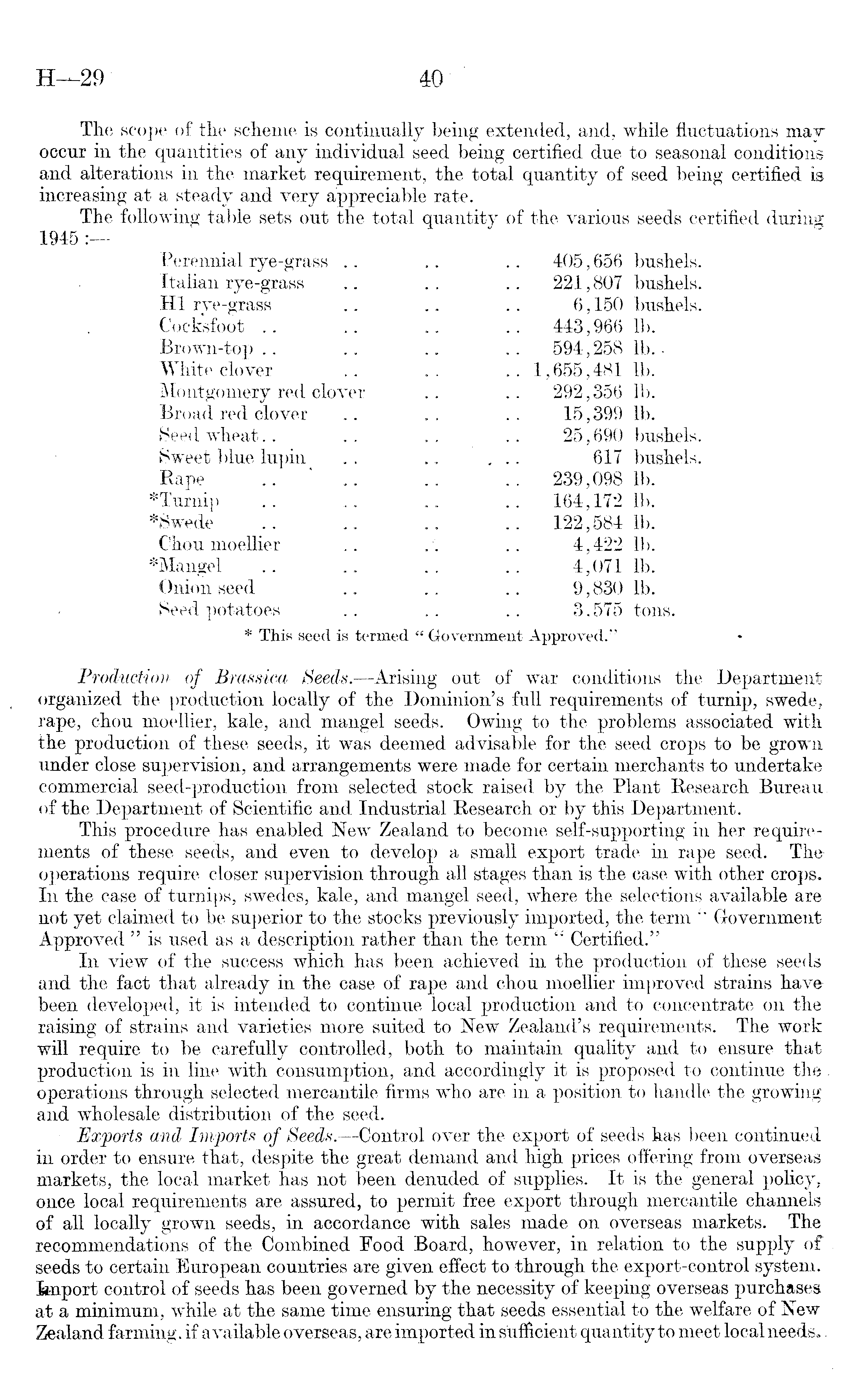 The scope of the scheme is continually being extended, and, while fluctuations may occur in the quantities of any individual seed being certified due to seasonal conditions and alterations in the market requirement, the total quantity of seed being certified is increasing at a steady and very appreciable rate. The following table sets out the total quantity of the various seeds certified during 1945 : Perennial rye-grass .. .. .. 405,656 bushels. Italian rye-grass .. .. .. 221,807 bushels. HI rye-grass .. .. .. 6,150 bushels. Cocksfoot .. .. .. .. 443,966 lb. Brown-top .. .. .. .. 594,258 lb. • White clover .. .. .. 1,655 ,481 lb. Montgomery red clover .. .. 292,356 lb. Broad red clover .. .. .. 15,399 lb. Seed wheat.. .. .. .. 25,690 bushels. Sweet blue lupin .. .. ... 617 bushels. Rape .. .. .. .. 239,098 Ib. *Turnip .. .. .. .. 164,172 Ib. *Swede .. .. .. .. 122,584 Ib. Chou moellier .. .. 4,422 lb. *Mangel .. .. .. .. 4,071 lb. Onion seed .. .. .. 9,830 lb. Seed potatoes .. .. .. 3,575 tons. * This seed is termed " Government Approved." Production of Brassica Seeds. —Arising out of war conditions the Department organized the production locally of the Dominion's full requirements of turnip, swede, rape, chou moellier, kale, and mangel seeds. Owing to the problems associated with the production of these seeds, it was deemed advisable for the seed crops to be grown under close supervision, and arrangements were made for certain merchants to undertake commercial seed-production from selected stock raised by the Plant Research Bureau of the Department of Scientific and Industrial Research or by this Department. This procedure has enabled New Zealand to become self-supporting in her requirements of these seeds, and even to develop a small export trade in rape seed. The operations require closer supervision through all stages than is the case with other crops. In the case of turnips, swedes, kale, and mangel seed, where the selections available are not yet claimed to be superior to the stocks previously imported, the term " Government Approved " is used as a description rather than the.term " Certified." In view of the success which has been achieved in the production of these seeds and the fact that already in the case of rape and chou moellier improved strains have been developed, it is intended to continue local production and to concentrate on the raising of strains and varieties more suited to New Zealand's requirements. The work will require to be carefully controlled, both to maintain quality and to ensure that production is in line with consumption, and accordingly it is proposed to continue the operations through selected mercantile firms who are in a position to handle the growing and wholesale distribution of the seed. Exports and Imports of Seeds. —Control over the export of seeds has been continued in order to ensure that, despite the great demand and high prices offering from overseas markets, the local market has not been denuded of supplies. It is the general policy, once local requirements are assured, to permit free export through mercantile channels of all locally grown seeds, in accordance with sales made on overseas markets. The recommendations of the Combined Food Board, however, in relation to the supply of seeds to certain European countries are given effect to through the export-control system. Import control of seeds has been governed by the necessity of keeping overseas purchases at a minimum, while at the same time ensuring that seeds essential to the welfare of New Zealand farming, if available overseas, are imported in sufficient quantity to meet local needs..