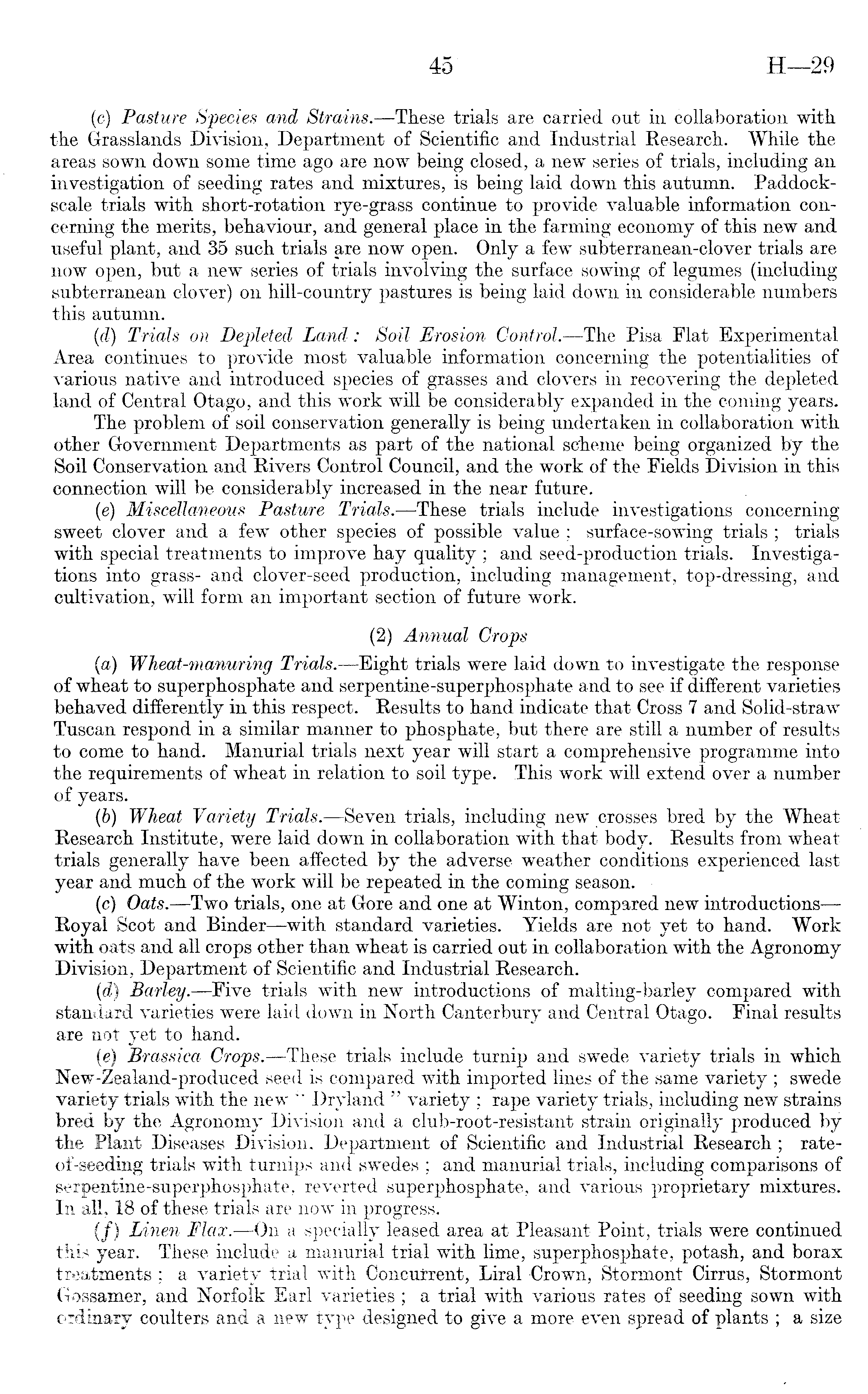 (c) Pasture Species and Strains.—These trials are carried out in collaboration with the Grasslands Division, Department of Scientific and Industrial Research. While the areas sown down some time ago are now being closed, a new series of trials, including an investigation of seeding rates and mixtures, is being laid down this autumn. Paddockscale trials with short-rotation rye-grass continue to provide valuable information concerning the merits, behaviour, and general place in the farming economy of this new and useful plant, and 35 such trials are now open. Only a few subterranean-clover trials are now open, but a new series of trials involving the surface sowing of legumes (including subterranean clover) on hill-country pastures is being laid down in considerable numbers this autumn. (d) Trials on Depleted Land: Soil Erosion Control. —The Pisa Flat Experimental Area continues to provide most valuable information concerning the potentialities of various native and introduced species of grasses and clovers in recovering the depleted land of Central Otago, and this work will be considerably expanded in the coming years. The problem of soil conservation generally is being undertaken in collaboration with other Government Departments as part of the national scheme being organized by the Soil Conservation and Rivers Control Council, and the work of the Fields Division in this connection will be considerably increased in the near future. (e) Miscellaneous Pasture Trials. —These trials include investigations concerning sweet clover and a few other species of possible value ; surface-sowing trials ; trials with special treatments to improve hay quality ; and seed-production trials. Investigations into grass- and clover-seed production, including management, top-dressing, and cultivation, will form an important section of future work. (2) Annual Crops (a) Wheat-manuring Trials.—Eight trials were laid down to investigate the response of wheat to superphosphate and serpentine-superphosphate and to see if different varieties behaved differently in this respect. Results to hand indicate that Cross 7 and Solid-straw Tuscan respond in a similar manner to phosphate, but there are still a number of results to come to hand. Manurial trials next year will start a comprehensive programme into the requirements of wheat in relation to soil type. This work will extend over a number of years. (b) Wheat Variety Trials. —Seven trials, including new crosses bred by the Wheat Research Institute, were laid down in collaboration with that body. Results from wheat trials generally have been affected by the adverse weather conditions experienced last year and much of the work will be repeated in the coming season. (c) Oats.—Two trials, one at Gore and one at Winton, compared new introductions — Royal Scot and Binder—with standard varieties. Yields are not yet to hand. Work with oats and all crops other than wheat is Carried out in collaboration with the Agronomy Division, Department of Scientific and Industrial Research. (d) Barley.—Five trials with new introductions of malting-barley compared with standard varieties were laid down in North Canterbury and Central Otago. Final results are not yet to hand. (e) Brassica Crops.—These trials include turnip and swede variety trials in which New-Zealand-produced seed is compared with imported lines of the same variety ; swede variety trials with the new " Dryland " variety ; rape variety trials, including new strains bred by the Agronomy Division and a club-root-resistant strain originally produced by the Plant Diseases Division, Department of Scientific and Industrial Research ; rate-of-seeding trials with turnips and swedes ; and manurial trials, including comparisons of serpentine-superphosphate, reverted superphosphate, and various proprietary mixtures. In all, 18 of these trials are now in progress. (/) Linen Flax. —On a specially leased area at Pleasant Point, trials were continued this year. These include a manurial trial with lime, superphosphate, potash, and borax treatments ; a variety trial with Concurrent, Liral Crown, Stormont Cirrus, Stormont Gossamer, and Norfolk Earl varieties ; a trial with various rates of seeding sown with ordinary coulters and a new type designed to give a more even spread of plants ; a size
