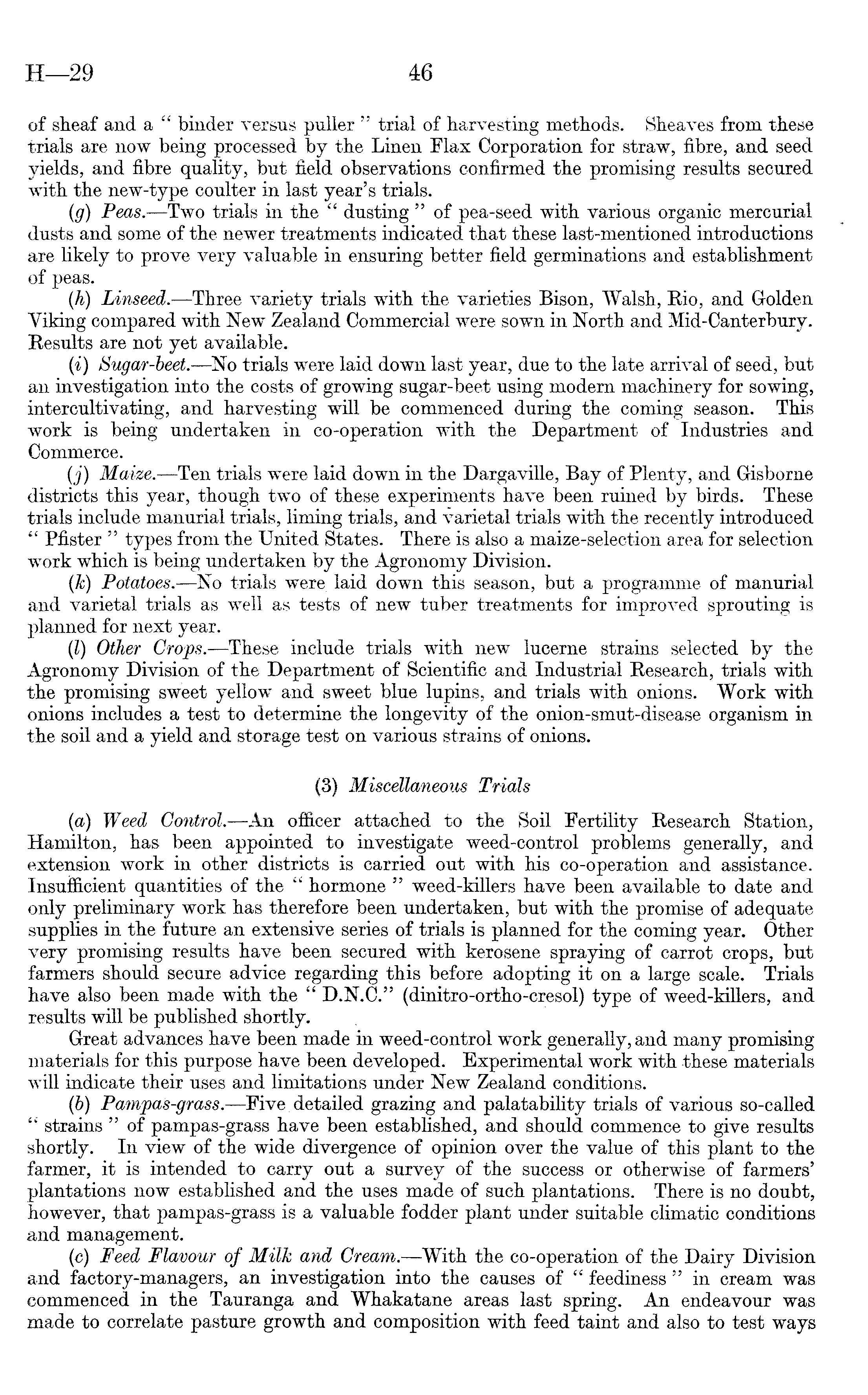 of sheaf and a " binder versus puller " trial of harvesting methods. Sheaves from these trials are now being processed by the Linen Flax Corporation for straw, fibre, and seed yields, and fibre quality, but field observations confirmed the promising results secured with the new-type coulter in last year's trials. (g) Peas. —Two trials in the " dusting "of pea-seed with various organic mercurial dusts and some of the newer treatments indicated that these last-mentioned introductions are likely to prove very valuable in ensuring better field germinations and establishment of peas. (h) Linseed.-—Three variety trials with the varieties Bison, Walsh, Rio, and Golden Viking compared with New Zealand Commercial were sown in North and Mid-Canterbury. Results are not yet available. (i) Sugar-beet.—No trials were laid down last year, due to the late arrival of seed, but an investigation into the costs of growing sugar-beet using modern machinery for sowing, intercultivating, and harvesting will be commenced during the coming season. This work is being undertaken in co-operation with the Department of Industries and Commerce. (j) Maize.—Ten trials were laid down in the Dargaville, Bay of Plenty, and Gisborne districts this year, though two of these experiments have been ruined by birds. These trials include manurial trials, liming trials, and varietal trials with the recently introduced " Pfister " types from the United States. There is also a maize-selection area for selection work which is being undertaken by the Agronomy Division. (Jc) Potatoes. —No trials were laid down this season, but a programme of manurial and varietal trials as well as tests of new tuber treatments for improved sprouting is planned for next year. (I) Other Crops. —These include trials with new lucerne strains selected by the Agronomy Division of the Department of Scientific and Industrial Research, trials with the promising sweet yellow and sweet blue lupins, and trials with onions. Work with onions includes a test to determine the longevity of the onion-smut-disease organism in the soil and a yield and storage test on various strains of onions. (3) Miscellaneous Trials (a) Weed Control. —An officer attached to the Soil Fertility Research Station, Hamilton, has been appointed to investigate weed-control problems generally, and extension work in other districts is carried out with his co-operation and assistance. Insufficient quantities of the " hormone " weed-killers have been available to date and only preliminary work has therefore been undertaken, but with the promise of adequate supplies in the future an extensive series of trials is planned for the coming year. Other very promising results have been secured with kerosene spraying of carrot crops, but farmers should secure advice regarding this before adopting it on a large scale. Trials have also been made with the " D.N.C." (dinitro-ortho-cresol) type of weed-killers, and results will be published shortly. Great advances have been made in weed-control work generally, and many promising materials for this purpose have been developed. Experimental work with these materials will indicate their uses and limitations under New Zealand conditions. (b) Pampas-grass.—Five detailed grazing and palatability trials of various so-called " strains " of pampas-grass have been established, and should Commence to give results shortly. In view of the wide divergence of opinion over the value of this plant to the farmer, it is intended to carry out a survey of the success or otherwise of farmers' plantations now established and the uses made of such plantations. There is no doubt, however, that pampas-grass is a valuable fodder plant under suitable climatic conditions and management. (c) Feed Flavour of Milk and Cream. —With the co-operation of the Dairy Division and factory-managers, an investigation into the causes of " feediness " in cream was commenced in the Tauranga and Whakatane areas last spring. An endeavour was made to correlate pasture growth and composition with feed taint and also to test ways