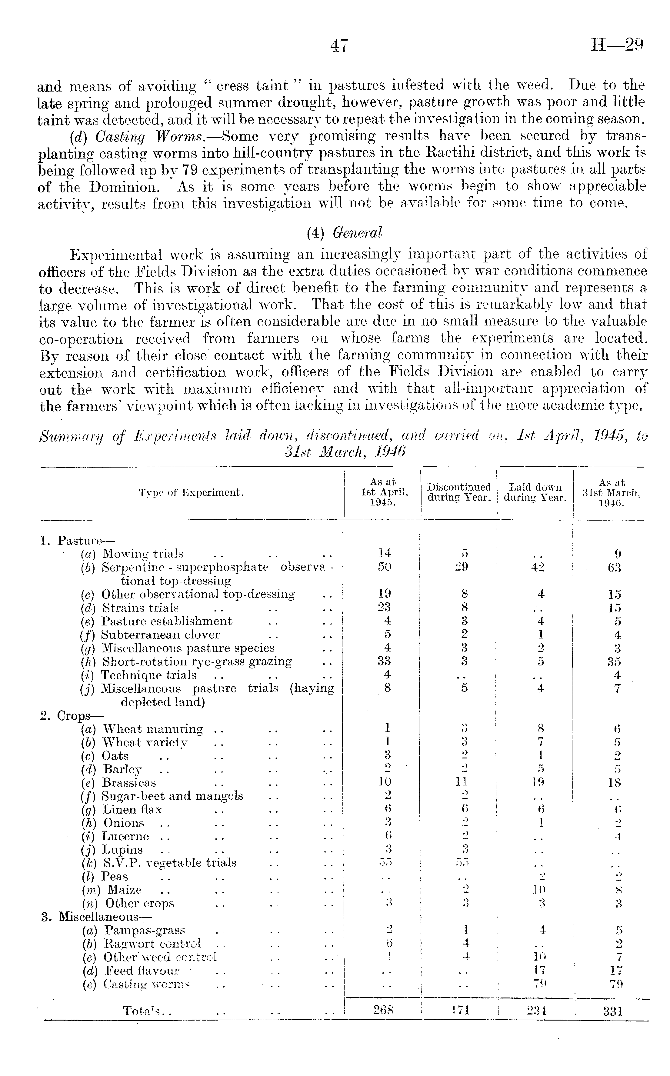 and means of avoiding " cress taint " in pastures infested with the weed. Due to the late spring and prolonged summer drought, however, pasture growth was poor and little taint was detected, and it will be necessary to repeat the investigation in the coming season. (d) Casting Worms. —Some very promising results have been secured by transplanting casting worms into hill-country pastures in the Raetihi district, and this work is being followed up by 79 experiments of transplanting the worms into pastures in all parts of the Dominion. As it is some years before the worms begin to show appreciable activity, results from this investigation will not be available for some time to come. (4) General Experimental work is assuming an increasingly important part of the activities of officers of the Fields Division as the extra duties occasioned by war conditions commence to decrease. This is work of direct benefit to the farming community and represents a large volume of investigational work. That the cost of this is remarkably low and that its value to the farmer is often considerable are due in no small measure to the valuable co-operation received from farmers on whose farms the experiments are located. By reason of their close contact with the farming community in connection with their extension and certification work, officers of the Fields Division are enabled to carry out the work with maximum efficiency and with that all-important appreciation of the farmers' viewpoint which is often lacking in investigations of the more academic type.