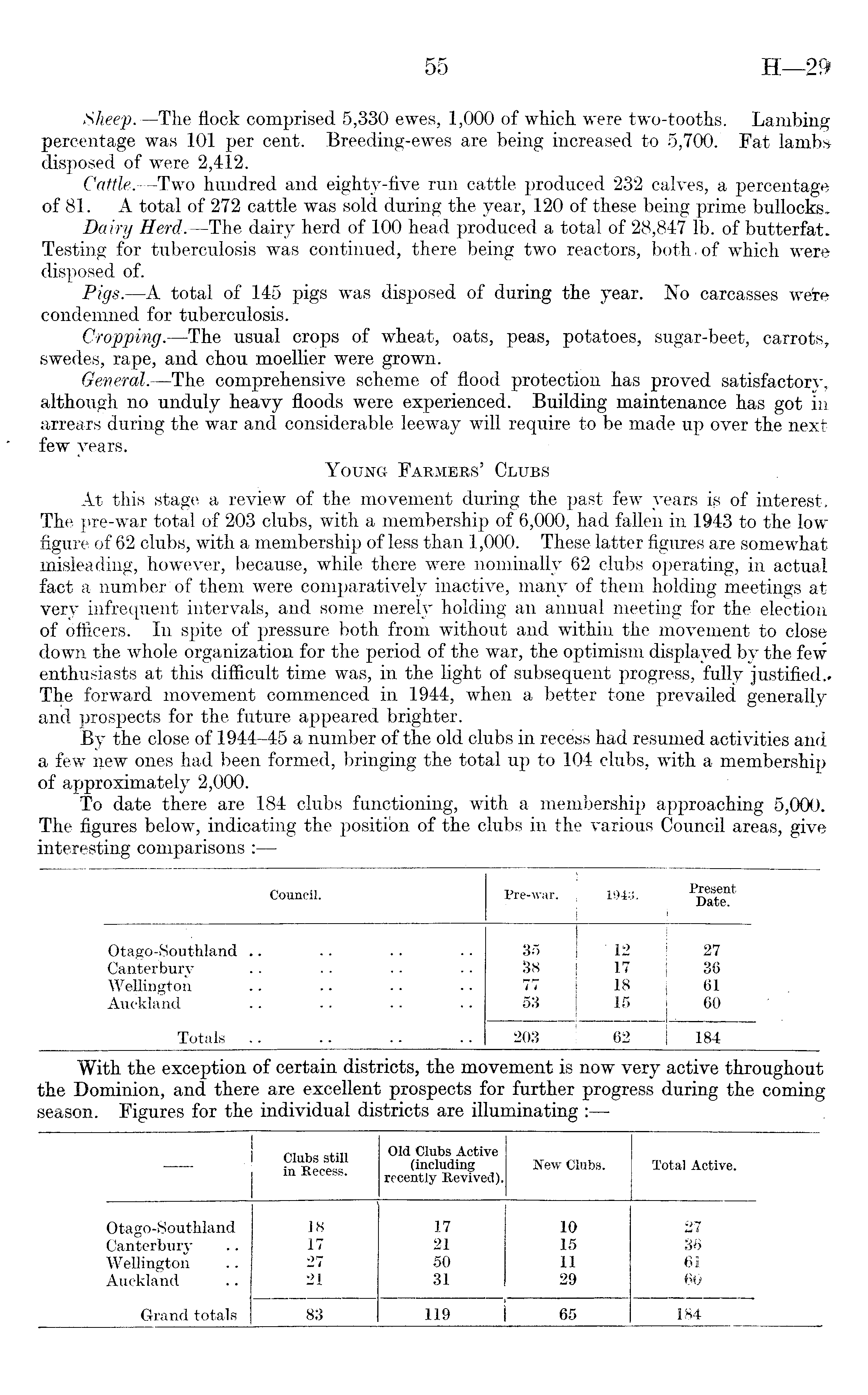 Sheep.—'The flock comprised 5,330 ewes, 1,000 of which were two-tooths. Lambing percentage was 101 per cent. Breeding-ewes are being increased to 5,700. Fat lambs disposed of were 2,412. Cattle. —Two hundred and eighty-five run cattle produced 232 calves, a percentage of 81. A total of 272 cattle was sold during the year, 120 of these being prime bullocks. Dairy Herd. —The dairy herd of 100 head produced a total of 28,847 lb. of butterfat. Testing for tuberculosis was continued, there being two reactors, both.of which were disposed of. Pigs.—A total of 145 pigs was disposed of during the year. No carcasses we're condemned for tuberculosis. Cropping.—The usual crops of wheat, oats, peas, potatoes, sugar-beet, carrots, swedes, rape, and chou moellier were grown. General.—The comprehensive scheme of flood protection has proved satisfactory, although no unduly heavy floods were experienced. Building maintenance has got in arrears during the war and considerable leeway will require to be made up over the next few years. Young Farmers' Clubs At this stage a review of the movement during the past few years ig of interest. The pre-war total of 203 clubs, with a membership of 6,000, had fallen in 1943 to the low figure of 62 clubs, with a membership of less than 1,000. These latter figures are somewhat misleading, however, because, while there were nominally 62 clubs operating, in actual fact a number of them were comparatively inactive, many of them holding meetings at very infrequent intervals, and some merely holding an annual meeting for the election of officers. In spite of pressure both from without and within the movement to close down the whole organization for the period of the war, the optimism displayed by the few enthusiasts at this difficult time was, in the light of subsequent progress, fully justified.. The forward movement commenced in 1944, when a better tone prevailed generally and prospects for the future appeared brighter. By the close of 1944-45 a number of the old clubs in recess had resumed activities and a few new ones had been formed, bringing the total up to 104 clubs, with a membership of approximately 2,000. To date there are 184 clubs functioning, with a membership approaching 5,000. The figures below, indicating the position of the clubs in the various Council areas, give interesting comparisons :