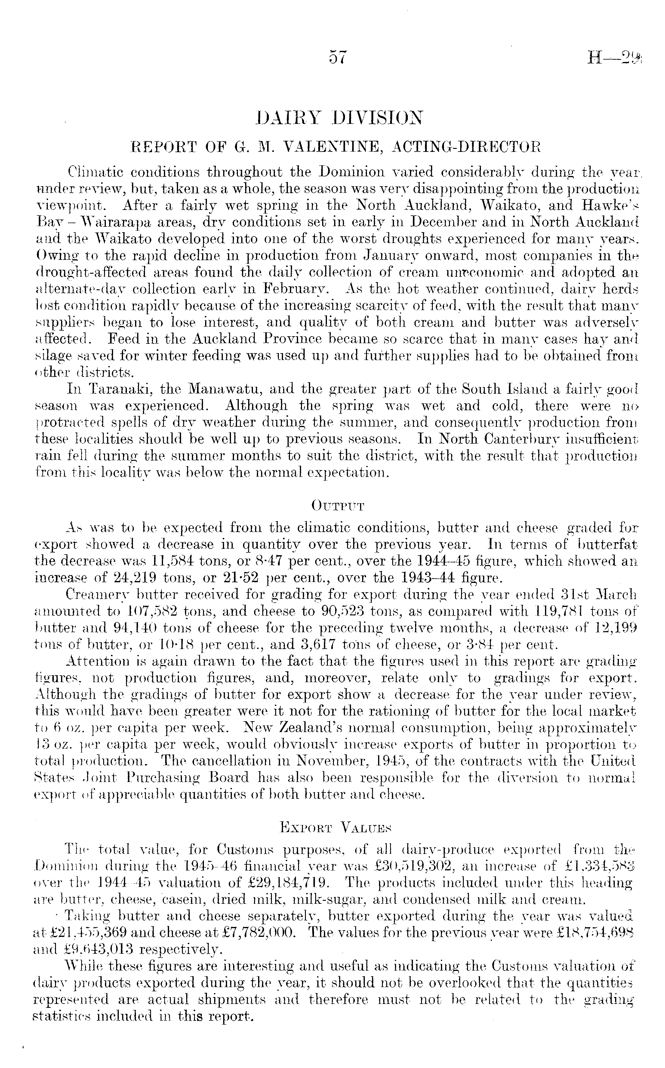 DAIRY DIVISION REPORT OF G. M. VALENTINE, ACTING-DIRECTOR Climatic conditions throughout the Dominion varied considerably during the year under review, but, taken as a whole, the season was very disappointing from the production viewpoint. After a fairly wet spring in the North Auckland, Waikato, and Hawke's Bay - Wairarapa areas, dry conditions set in early in December and in North Auckland and the Waikato developed into one of the worst droughts experienced for many years. Owing to the rapid decline in production from January onward, most companies in the drought-affected areas found the daily collection of cream uneconomic and adopted an alternate-day collection early in February. As the hot weather continued, dairy herds lost condition rapidly because of the increasing scarcity of feed, with the result that many suppliers began to lose interest, and quality of both cream and butter was adversely affected. Feed in the Auckland Province became so scarce that in many cases hay and silage saved for winter feeding was used up and further supplies had to be obtained from other districts. In Taranaki, the Manawatu, and the greater part of the South Island a fairly good season was experienced. Although the spring was wet and cold, there were no protracted spells of dry weather during the summer, and consequently production from these localities should be well up to previous seasons. In North Canterbury insufficient rain fell during the summer months to suit the district, with the result that production from this locality was below the normal expectation. Output As was to be expected from the climatic conditions, butter and cheese graded for export showed a decrease in quantity over the previous year. In terms of butterfat the decrease was 11,584 tons, or 8-47 per cent., over the 1944-45 figure, which showed an increase of 24,219 tons, or 21*52 per cent., over the 1943-44 figure. Creamery butter received for grading for export during the year ended 31st March amounted to 107,582 tons, and cheese to 90,523 tons, as compared with 119,781 tons of butter and 94,140 tons of cheese for the preceding twelve months, a decrease of 12,199 tons of T>utter, or 10*18 per cent., and 3,617 tons of cheese, or 3-84 per cent. Attention is again drawn to the fact that the figures used in this report are grading figures, not production figures, and, moreover, relate only to gradings for export. Although the gradings of butter for export show a decrease for the year under review, this would have been greater were it not for the rationing of butter for the local market to 6 oz. per capita per week. New Zealand's normal consumption, being approximately 13 oz. per capita per week, would obviously increase exports of butter in proportion to total production. The cancellation in November, 1945, of the contracts with the United States Joint Purchasing Board has also been responsible for the diversion to normal export of appreciable quantities of both butter and cheese. Export Values The total value, for Customs purposes, of all dairy-produce exported from the Dominion during the 1945-46 financial year was £30,519,302, an increase of £1,334,583 over the 1944-45 valuation of £29,184,719. The products included under this heading are butter, cheese, casein, dried milk, milk-sugar, and condensed milk and cream. • Taking butter and cheese separately, butter exported during the year was valued at £21,455,369 and cheese at £7,782,000. The values for the previous year were £18,754,698 and £9,643,013 respectively. While these figures are interesting and useful as indicating the Customs valuation of dairy products exported during the year, it should not be overlooked that the quantities represented are actual shipments and therefore must not be related to the grading statistics included in this report.