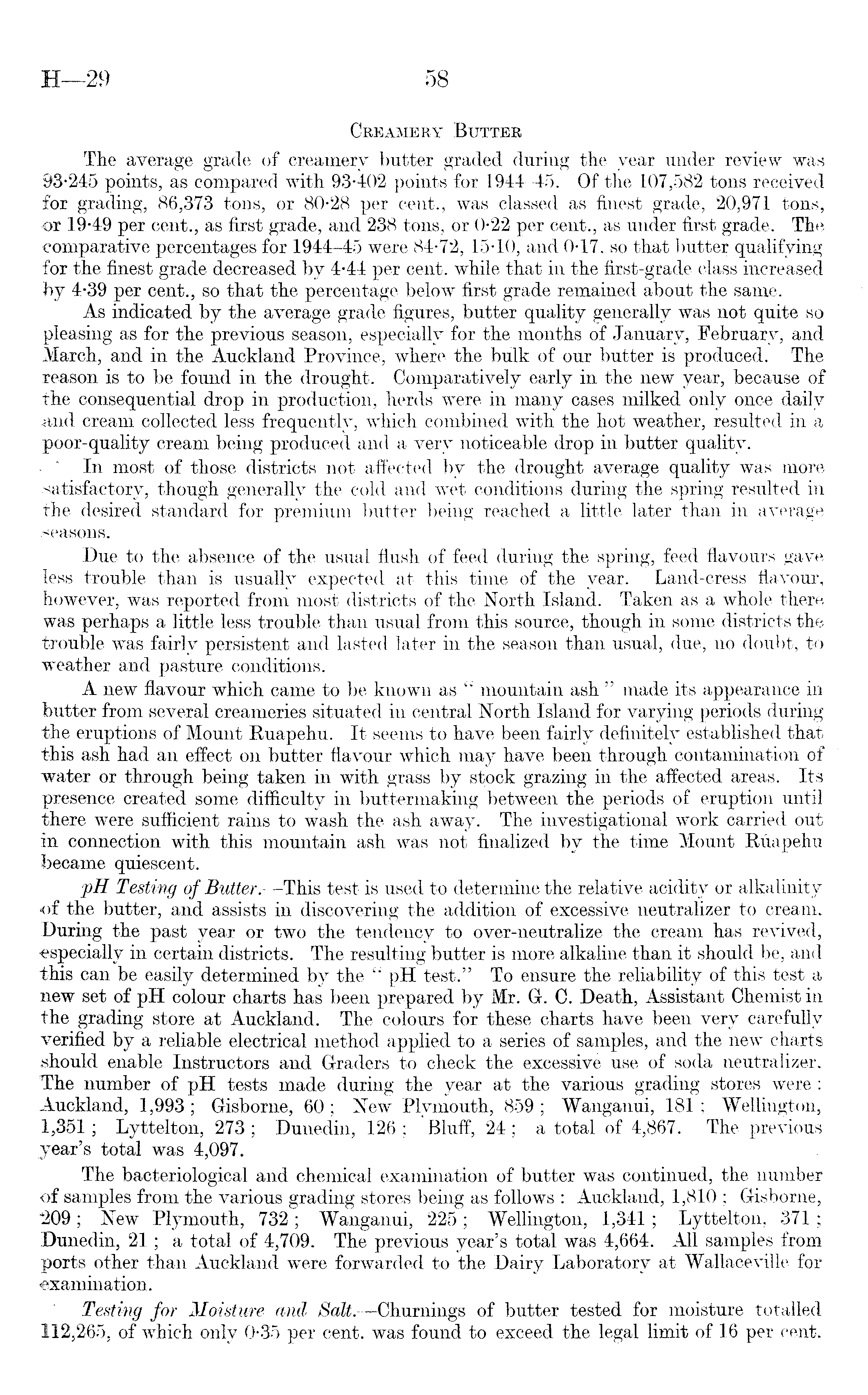 Creamery Butter The average grade of creamery butter graded during the year under review was 93-24:5 points, as compared with 93-402 points for 1944-45. Of the 107,582 tons received for grading, 86,373 tons, or 80-28 per cent., was classed as finest grade, 20,971 tons, •or 19-49 per cent., as first grade, and 238 tons, or 0-22 per cent., as under first grade. The comparative percentages for 1944-45 were 84-72, 15-10, and 0-17, so that butter qualifying for the finest grade decreased by 4-44 per cent, while that in the first-grade class increased by 4-39 per cent., so that the percentage below first grade remained about the same. As indicated by the average grade figures, butter quality generally was not quite so pleasing as for the previous season, especially for the months of January, February, and March, and in the Auckland Province, where the bulk of our butter is produced. The reason is to be found in the drought. Comparatively early in the new year, because of the consequential drop in production, herds were in many cases milked only once daily and cream collected less frequently, which combined with the hot weather, resulted in a poor-quality cream being produced and a very noticeable drop in butter quality. ■ ' In most of those districts not affected by the drought average quality was more satisfactory, though generally the cold and wet conditions during the spring resulted in the desired standard for premium butter being reached a little later than in average seasons. Due to the absence of the usual flush of feed during the spring, feed flavours gave less trouble than is usually expected at this time of the year. Land-cress flavour, however, was reported from most districts of the North Island. Taken as a whole there was perhaps a little less trouble than usual from this source, though in some districts the trouble was fairly persistent and lasted later in the season than usual, due, no doubt, to weather and pasture conditions. A new flavour which came to be known as " mountain ash " made its appearance in butter from several creameries situated in central North Island for varying periods during the eruptions of Mount Ruapehu. It seems to have been fairly definitely established that this ash had an effect on butter flavour which may have been through contamination of ■water or through being taken in with grass by stock grazing in the affected areas. Its presence created some difficulty in buttermaking between the periods of eruption until there were sufficient rains to wash the ash away. The investigational work carried out in connection with this mountain ash was not finalized by the time Mount Riiapehu became quiescent. pH Testing of Butter.—This test is used to determine the relative acidity or alkalinity ■of the butter, and assists in discovering the addition of excessive neutralizer to cream. During the past year or two the tendency to over-neutralize the cream has revived, especially in certain districts. The resulting butter is more alkaline than it should be, and this can be easily determined by the "pH test." To ensure the reliability of this test a new set of pH colour charts has been prepared by Mr. Gr. C. Death, Assistant Chemist in the grading store at Auckland. The colours for these charts have been very carefully verified by a reliable electrical method applied to a series of samples, and the new charts should enable Instructors and Graders to check the excessive use of soda neutralizer. The number of pH tests made during the year at the various grading stores were : Auckland, 1,993; Grisborne, 60; New Plymouth, 859 ; Wanganui, 181 ; Wellington, 1,351; Lyttelton, 273 ; Dunedin, 126 ; Bluff, 24 ; a total of 4,867. The previous year's total was 4,097. The bacteriological and chemical examination of butter was continued, the number of samples from the various grading stores being as follows : Auckland, 1,810 ; Gisborne, 209; New Plymouth, 732 ; Wanganui, 225 ; Wellington, 1,341; Lyttelton, 371; Dunedin, 21 ; a total of 4,709. The previous year's total was 4,664. All samples from ports other than Auckland were forwarded to the Dairy Laboratory at Wallaceville for examination. Testing for Moisture and Salt.—Churnings of butter tested for moisture totalled 112,265, of which only 0-35 per cent, was found to exceed the legal limit of 16 per cent.