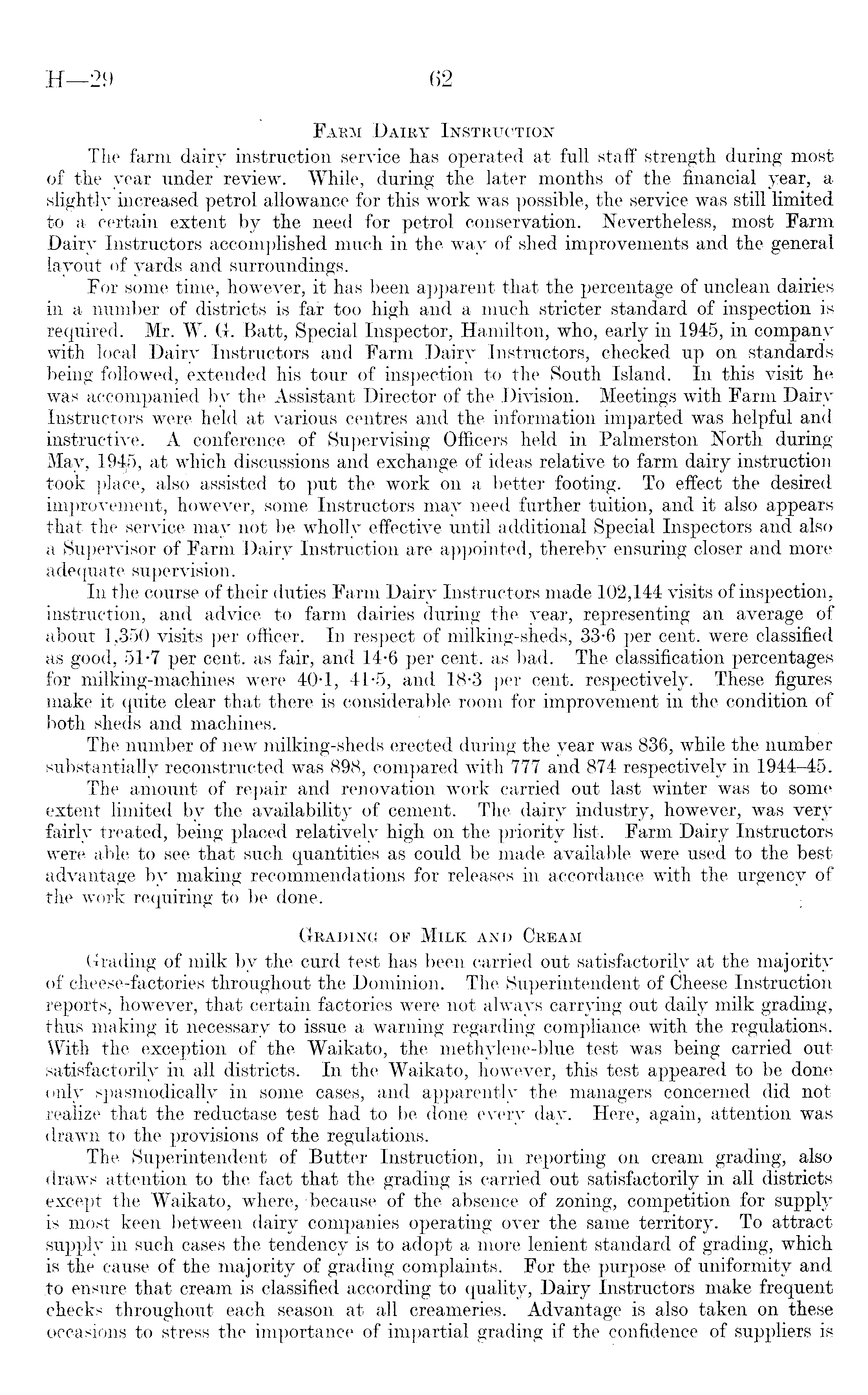 Farm Dairy Instruction The farm dairy instruction service has operated at full staff strength during most of the year under review. While, during the later months of the financial year, a slightly increased petrol allowance for this work was possible, the service was still limited to a certain extent by the need for petrol conservation. Nevertheless, most Farm Dairy Instructors accomplished much in the way of shed improvements and the general layout of yards and surroundings. For some time, however, it has been apparent that the percentage of unclean dairies in a number of districts is far too high and a much stricter standard of inspection is required. Mr. W. G. Batt, Special Inspector, Hamilton, who, early in 1945, in company with local Dairy Instructors and Farm Dairy Instructors, checked up on standards being followed, extended his tour of inspection to the South Island. In this visit he was accompanied by the Assistant Director of the Division. Meetings with Farm Dairy Instructors were held at various centres and the information imparted was helpful and instructive. A conference of Supervising Officers held in Palmerston North during May, at which discussions and exchange of ideas relative to farm dairy instruction took place, also assisted to put the work on a better footing. To effect the desired improvement, however, some Instructors may need further tuition, and it also appears that the service may not be wholly effective until additional Special Inspectors and also a Supervisor of Farm Dairy Instruction are appointed, thereby ensuring closer and more adequate supervision. In the course of their duties Farm Dairy Instructors made 102,144 visits of inspection, instruction, and advice to farm dairies during the year, representing an average of about 1,350 visits per officer. In respect of milking-sheds, 33-6 per cent, were classified as good, 51-7 per cent, as fair, and 14-6 per cent, as bad. The classification percentages for milking-machines were 40-1, 41-5, and 18-3 per cent, respectively. These figures make it quite clear that there is considerable room for improvement in the condition of both sheds and machines. The number of new milking-sheds erected during the year was 836, while the number substantially reconstructed was 898, compared with 777 and 874 respectively in 1944-45. The amount of repair and renovation work carried out last winter was to some extent limited by the availability of cement. The dairy industry, however, was very fairly treated, being placed relatively high on the priority list. Farm Dairy Instructors were able to see that such quantities as could be made available were used to the best advantage by making recommendations for releases in accordance with the urgency of the work requiring to be done. Grading of Milk and Cream Grading of milk by the curd test has been carried out satisfactorily at the majority of cheese-factories throughout the Dominion. The Superintendent of Cheese Instruction reports, however, that certain factories were not always carrying out daily milk grading, thus making it necessary to issue a warning regarding compliance with the regulations. With the exception of the Waikato, the methylene-blue test was being carried out satisfactorily in all districts. In the Waikato, however, this test appeared to be done only spasmodically in some cases, and apparently the managers concerned did not realize that the reductase test had to be done every day. Here, again, attention was drawn to the provisions of the regulations. The Superintendent of Butter Instruction, in reporting on cream grading, also draws attention to the fact that the grading is carried out satisfactorily in all districts except the Waikato, where, because of the absence of zoning, competition for supply is most keen between dairy companies operating over the same territory. To attract supply in such cases the tendency is to adopt a more lenient standard of grading, which is the cause of the majority of grading complaints. For the purpose of uniformity and to ensure that cream is classified according to quality, Dairy Instructors make frequent checks throughout each season at all creameries. Advantage" is also taken on these occasions to stress the importance of impartial grading if the confidence of suppliers is
