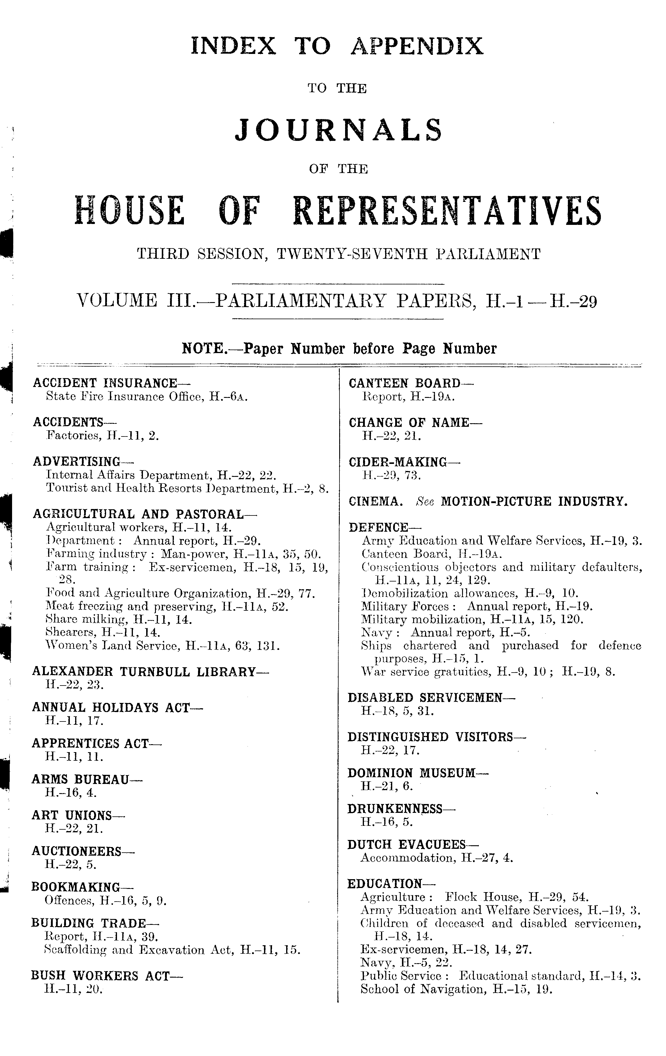 CANTEEN BOARD— Report, H.-19a. CHANGE OF NAME— H.-22, 21. CIDER-MAKING— H.-29, 73. CINEMA. See MOTION-PICTURE INDUSTRY. DEFENCE— Army Education and Welfare Services, H.-19, 3. Canteen Board, H.-19a. Conscientious objectors and military defaulters, H.-Ha, 11, 24, 129. Demobilization allowances, H.-9, 10. Military Forces : Annual report, H.-19. Military mobilization, H.-l la, 15, 120. Nary : Annual report, H.-5. Ships chartered and purchased for defence purposes, H.-15, 1. War service gratuities, H.-9, 10 ; H.-19, 8. DISABLED SERVICEMEN— H.-18, 5, 31. DISTINGUISHED VISITORS— H.-22, 17. DOMINION MUSEUM— H.-21, 6. DRUNKENNESS— H.-16, 5. DUTCH EVACUEES— Accommodation, H.-27, 4. EDUCATION— Agriculture : Flock House, H.-29, 54. Army Education and Welfare Services, H.-19, 3. Children of deceased and disabled servicemen, H.-18, 14. Ex-servicemen, H.-l 8, 14, 27. Navy, H.-5, 22. Public Service : Educational standard, H.-14, 3. School of Navigation, H.-15, 19.