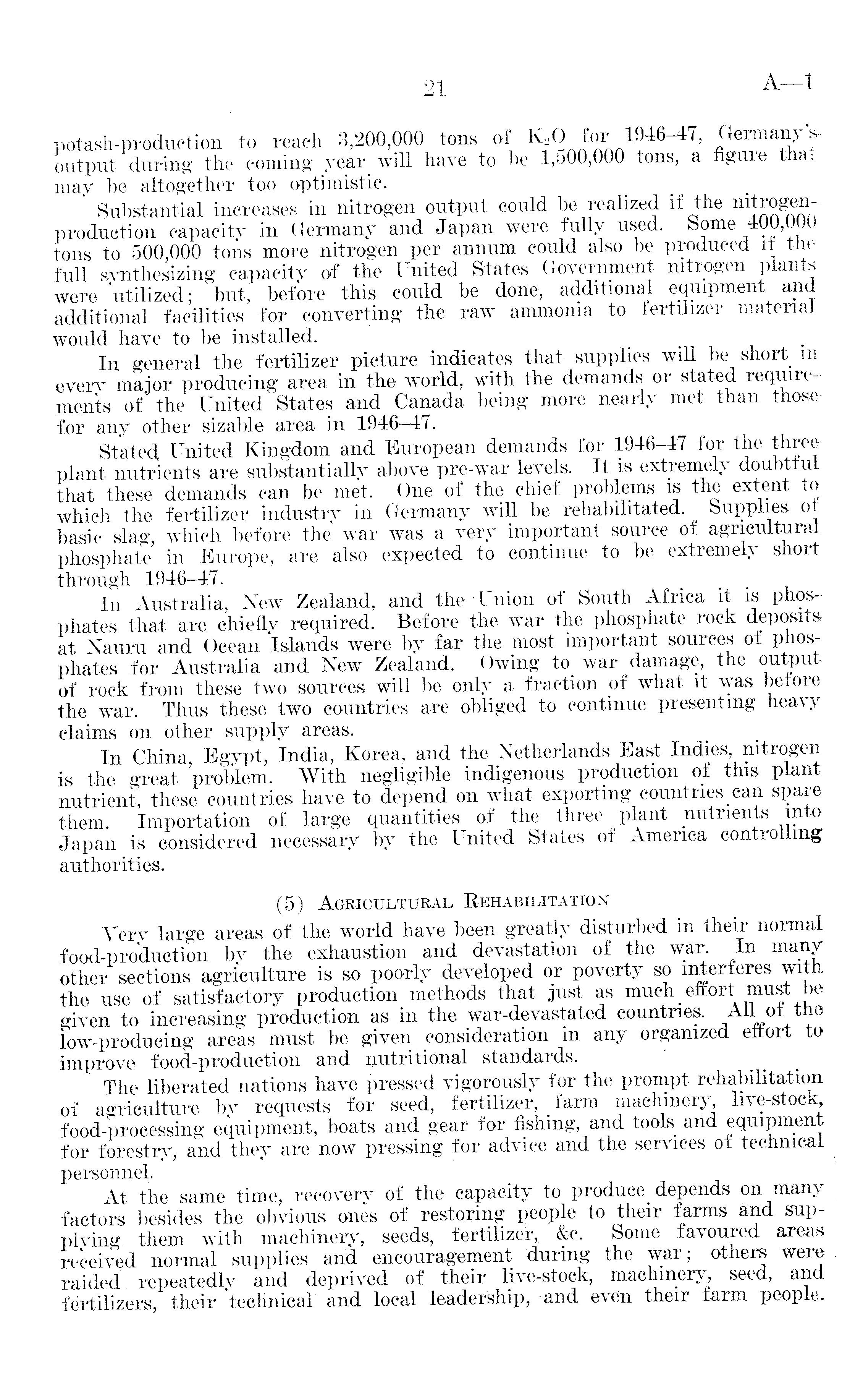 potash-production to reach 3,200,000 tons of K,O for 1946-47, Germany's output during the coming year will have to be 1,500,000 tons, a figure that may be altogether too optimistic. * Substantial increases in nitrogen output could be realized if the nitrogenproduction capacity in Germany and Japan were fully used. Some 400,000 tons to 500,000 tons more nitrogen per annum could also be produced it the full synthesizing capacity of the United States Government nitrogen plants were utilized; but, before this could be done, additional equipment and additional facilities for converting the raw ammonia to fertilizer material would have to be installed. In general the fertilizer picture indicates that supplies will be short m. every major producing area in the world, with the demands or stated requirements of the United States and Canada being more nearly met than those for any other sizable area in 1946-47. Stated United Kingdom and European demands for 1946-47 for the threeplant nutrients are substantially above pre-war levels. It is extremely doubttul that these demands can be met. One of the chief problems is the extent to which the fertilizer industry in Germany will be rehabilitated. Supplies ot basic slag, which before the war was a very important source of agricultural phosphate in Europe, are also expected to continue to be extremely short through 1946-47. In Australia, New Zealand, and the Union of South Africa it is phosphates that are chiefly required. Before the war the phosphate rock deposits, at Nauru and Ocean Islands were by far the most important sources o± phosphates for Australia and New Zealand. Owing to war damage, the output of rock from these two sources will be only a fraction of what.it was before the war. Thus these two countries are obliged to continue presenting heavy claims on other supply areas. In China, Egypt, India, Korea, and the Netherlands East Indies, nitrogen, is the great problem. With negligible indigenous production of this plant nutrient, these countries have to depend on what exporting countries can spaie them. Importation of large quantities of the three plant nutrients into Japan is considered necessary by the United States of America controlling authorities. (5) Agricultural, Rehabilitation Very large areas of the world have been greatly disturbed in their normal food-production by the exhaustion and devastation of the war. In maiiy other sections agriculture is so poorly developed or poverty so interferes with the use of satisfactory production methods that just as much eftort must be given to increasing production as in the war-devastated countries. All ot the low-producing areas must be given consideration in any organized ettort to improve food-production and nutritional standards. The liberated nations have pressed vigorously for the prompt rehabilitation of agriculture by requests. for seed, fertilizer, farm machinery, live-stock, food-processing equipment, boats and gear for fishing, and tools and equipment for forestry, and they are now pressing for advice and the services of technical personnel. At the same time, recovery of the capacity to produce depends on many factors besides the obvious ones of restoring people to their farms and supplying them with machinery, seeds, fertilizer, &c. Some favoured areas received normal supplies and encouragement during the war; others were raided repeatedly and deprived of their live-stock, machinery, seed, and fertilizers, their technical and local leadership, and evdn their farm people.