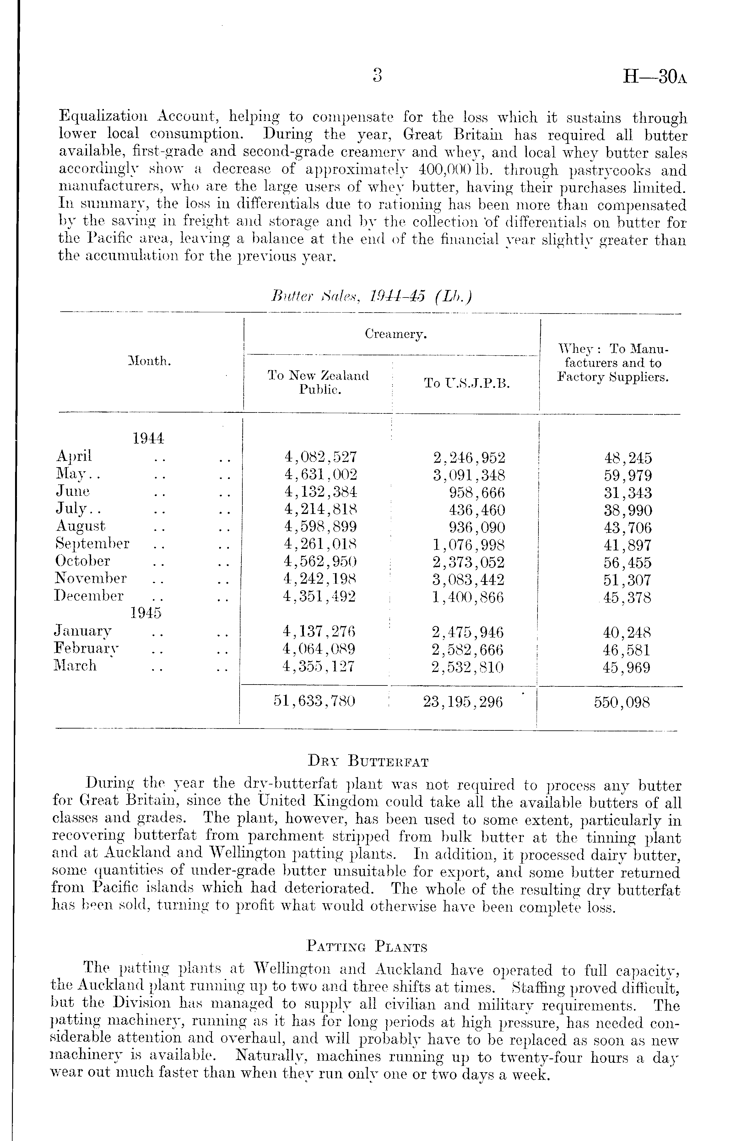 Dry Butterfat During the year the dry-butterfat plant was not required to process any butter for Great Britain, since the United Kingdom could take all the available butters of all classes and grades. The plant, however, has been used to some extent, particularly in recovering butterfat from parchment stripped from bulk butter at the tinning plant and at Auckland and Wellington patting plants. In addition, it processed dairy butter, some quantities of under-grade butter unsuitable for export, and some butter returned from Pacific islands which had deteriorated. The whole of the resulting dry butterfat has been sold, turning to profit what would otherwise have been complete loss. Patting Plants The patting plants at Wellington and Auckland have operated to full capacity, the Auckland plant running up to two and three shifts at times. Staffing proved difficult, but the Division has managed to supply all civilian and military requirements. The patting machinery, running as it has for long periods at high pressure, has needed considerable attention and overhaul, and will probably have to be replaced as soon as new machinery is available. Naturally, machines running up to twenty-four hours a day wear out much faster than when they run only one or two days a week.
