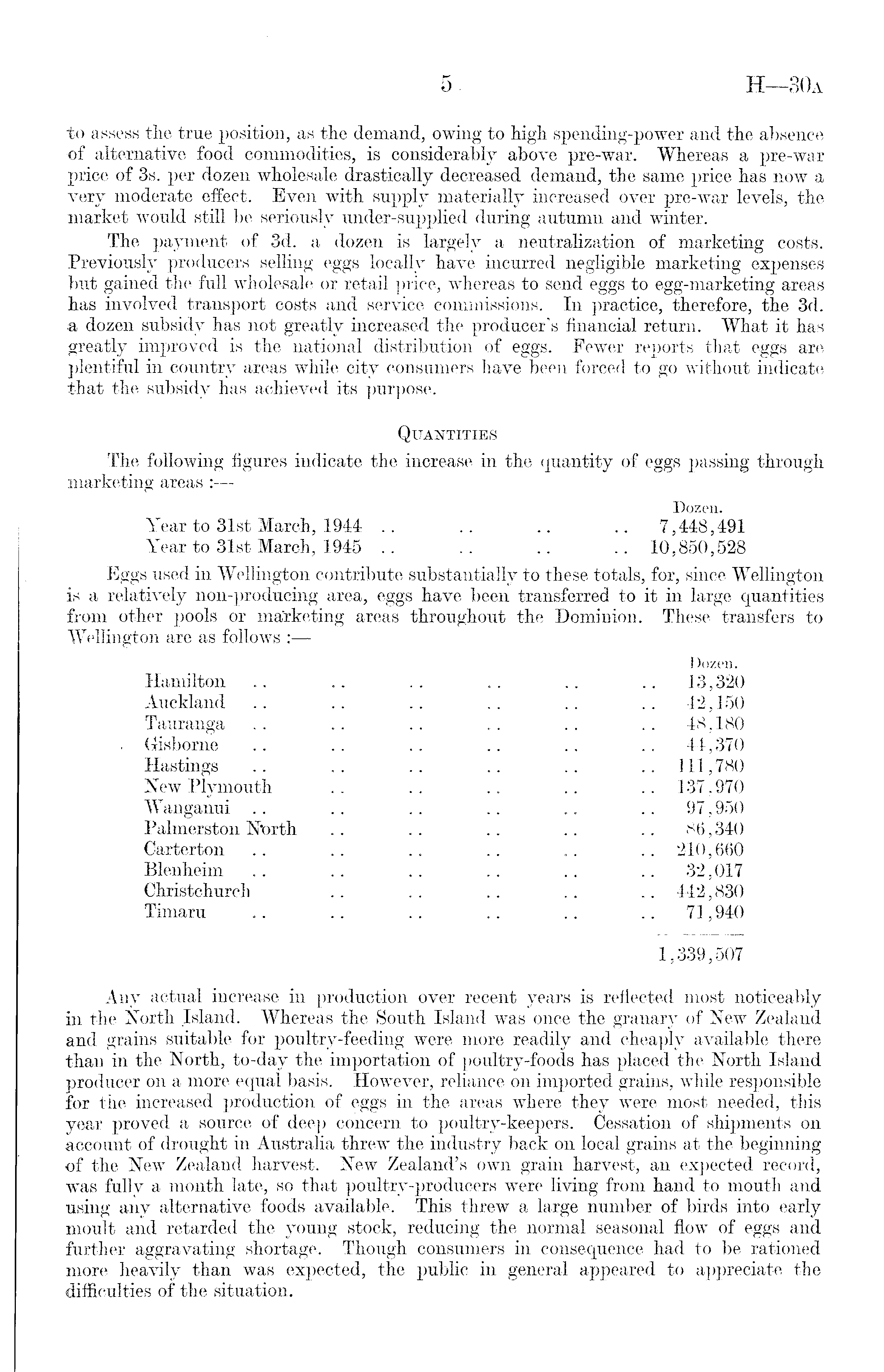 to assess the true position, as the demand, owing to high spending-power and the absence of alternative food commodities, is considerably above pre-war. Whereas a pre-war price of 3s. per dozen wholesale drastically decreased demand, the same price has now a very moderate effect. Even with supply materially increased over pre-war levels, the market would still be seriously under-supplied during autumn and winter. The payment of 3d. a dozen is largely a neutralization of marketing costs. Previously producers selling eggs locally have incurred negligible marketing expenses but gained the full wholesale or retail price, whereas to send eggs to egg-marketing areas has involved transport costs and service commissions. In practice, therefore, the 3d. a dozen subsidy has not greatly increased the producer's financial return. What it has greatly improved is the national distribution of eggs. Fewer reports that eggs are plentiful in country areas while city consumers have been forced to go without indicate that the subsidy has achieved its purpose. Quantities The following figures indicate the increase in the quantity of eggs passing through marketing areas : Dozen. Year to 31st March, 1944 .. .. .. .. 7,448,491 Year to 31st March, 1945 .. .. .. .. 10,850,528 Eggs used in Wellington contribute substantially to these totals, for, since Wellington is a relatively non-producing area, eggs have been transferred to it in large quantities from other pools or marketing areas throughout the Dominion. These transfers to Wellington are as follows : Dozen. Hamilton .. .. .. .. .. .. 13,320 Auckland .. .. .. .. .. 42,150 Tauranga .. .. .. .. .. .. 48,180 . Gisborne .. .. .. .. .. .. 44,370 Hastings .. .. .. .. .. .. 111,780 New Plymouth .. .. .. .. .. 137,970 Wanganui .. .. .. .. .. .. 97,950 Palmerston Nt»rth .. .. .. .. 86,340 Carterton .. .. .. .. .. .. 210,660 Blenheim .. .. .. .. .. .. 32,017 Christchurch .. .. .. .. .. 442,830 Timaru .. .. .. .. .. .. 71,940 1,339,507 Any actual increase in production over recent years is reflected most noticeably in the North Island. Whereas the South Island was once the granary of New Zealand and grains suitable for poultry-feeding were more readily and cheaply available there than in the North, to-day the importation of poultry-foods has placed the North Island producer on a more equal basis. However, reliance on imported grains, while responsible for the increased production of eggs in the areas where they were most needed, this year proved a source of deep concern to poultry-keepers. Cessation of shipments on account of drought in Australia threw the industry back on local grains at the beginning of the New Zealand harvest. New Zealand's own grain harvest, an expected record, was fully a month late, so that poultry-producers were living from hand to mouth and using any alternative foods available. This threw a large number of birds into early moult and retarded the young stock, reducing the normal seasonal flow of eggs and further aggravating shortage. Though consumers in consequence had to be rationed more heavily than was expected, the public in general appeared to appreciate the difficulties of the situation.