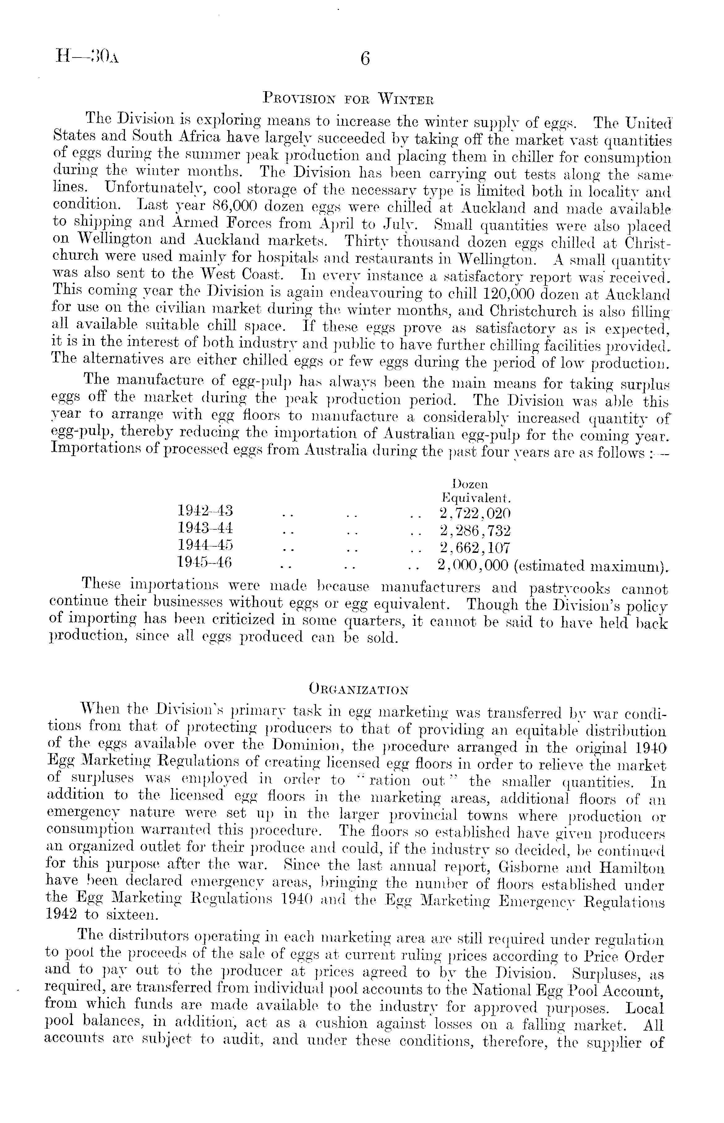 Provision for Winter The Division is exploring means to increase the winter supply of eggs. The United States and South Africa have largely succeeded by taking off the market vast quantitiesof eggs during the summer peak production and placing them in chiller for consumption during the winter months. The Division has been carrying out tests along the same lines. _ Unfortunately, cool storage of the necessary type is limited both in locality and condition. Last year 86,000 dozen eggs were chilled at Auckland and made availableto shipping and Armed Forces from April to July. Small quantities were also placed on Wellington and Auckland markets. Thirty thousand dozen eggs chilled at Christchurch were used mainly for hospitals and restaurants in Wellington. A small quantity was also sent to the West Coast. In every instance a satisfactory report was received. This coming year the Division is again endeavouring to chill 120,000 dozen at Auckland for use on the civilian market during the winter months, and Christchurch is also filling all available suitable chill space. If these eggs prove as satisfactory as is expected, it is in the interest of both industry and public to have further chilling facilities provided. The alternatives are either chilled eggs or few eggs during the period of low production. The manufacture of egg-pulp has always been the main means for taking surplus eggs off the market during the peak production period. The Division was able this year to arrange with egg floors to manufacture a considerably increased quantity of e §g"P u lp> thereby reducing the importation of Australian egg-pulp for the coming year. Importations of processed eggs from Australia during the past four years are as follows : Dozen Equivalent. 1942-43 .. .. .. 2,722,020 1943-44 .. .. .. 2,286,732 1944-45 .. .. .. 2,662,107 1945-46 .. .. .. 2,000,000 (estimated maximum). These importations were made because manufacturers arid pastrycooks cannot continue their businesses without eggs or egg equivalent. Though the Division's policy of importing has been criticized in some quarters, it cannot be said to have held back production, since all eggs produced can be sold. Organization TV hen the Division s primary task in egg marketing was transferred by war conditions from that of protecting producers to that of providing an equitable distribution of the eggs available over the Dominion, the procedure arranged in the original 1940 Egg Marketing Regulations of creating licensed egg floors in order to relieve the market of surpluses was employed in order to "ration out" the smaller quantities. In addition to the licensed egg floors in the marketing areas, additional floors of an emergency nature were set up in the larger provincial towns where production or consumption warranted this procedure. The floors so established have given producers an organized outlet for their produce and could, if the industry so decided, be continued for this purpose after the war. Since the last annual report, Gisborne and Hamilton have been declared emergency areas, bringing the number of floors established under the Egg Marketing Regulations 1940 and the Egg Marketing Emergency Regulations 1942 to sixteen. The distributors operating in each marketing area a,re still required under regulation to pool the proceeds of the sale of eggs at current ruling prices according to Price Order and to pay out to the producer at prices agreed to by the Division. Surpluses, as required, are transferred from individual pool accounts to the National Egg Pool Account, from which funds are made available to the industry for approved purposes. Local pool balances, in addition, act as a cushion against losses on a falling market. All accounts are subject to audit, and Tinder these conditions, therefore, the supplier of