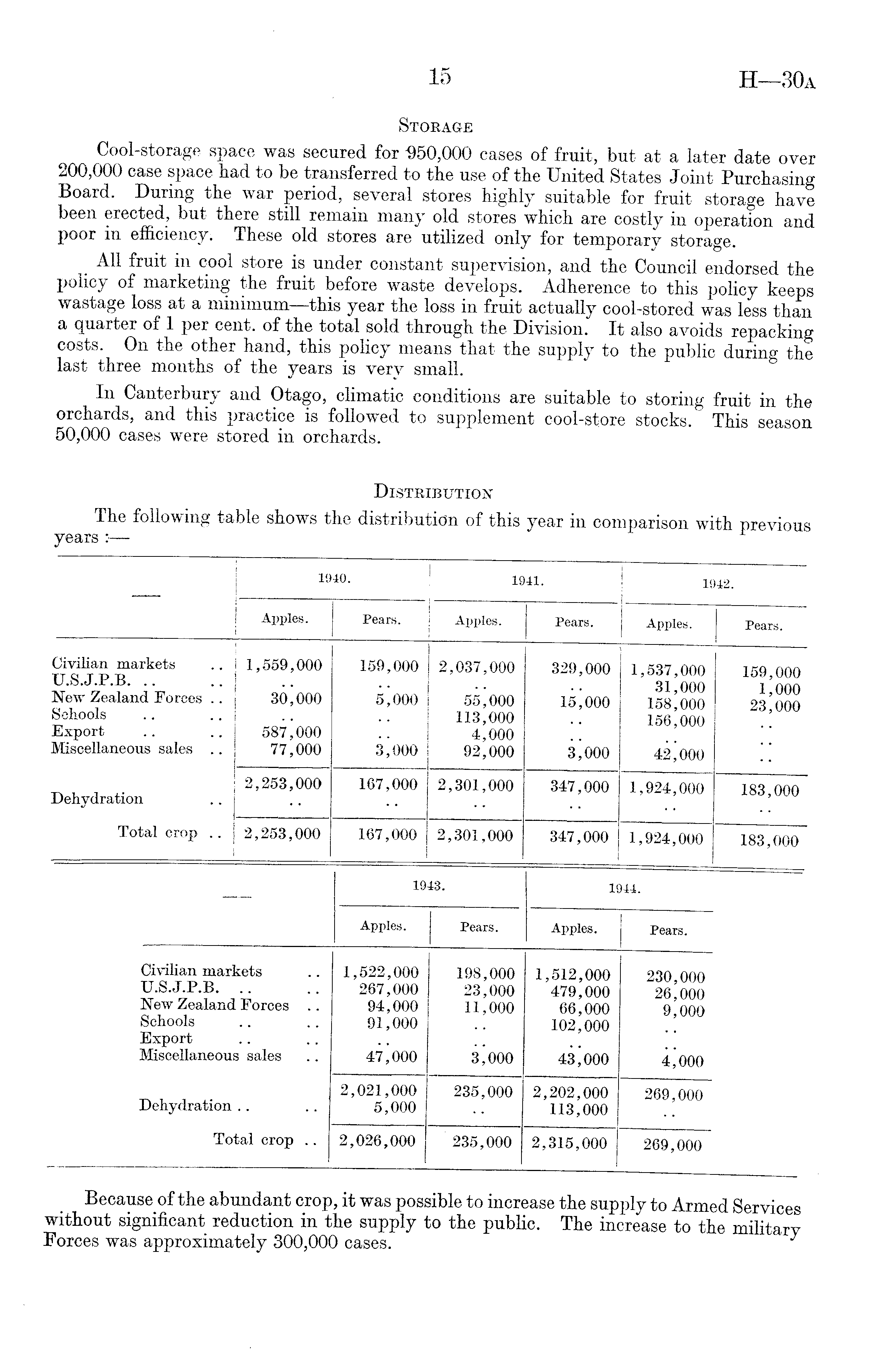 1940. 1941. 1942. Apples. Pears. Apples. Pears. Apples. Pears. Civilian markets U.S.J.P.B New Zealand Forces .. Schools Export Miscellaneous sales .. 1,559,000 30,000 587*000 77,000 159,000 5^000 jijooo 2,037,000 55,000 113,000 4,000 92,000 329,000 15j 000 3 joOO 1,537,000 31,000 158,000 156,000 42,000 159,000 1,000 23,000 Dehydration 2,253,000 167,000 2,301,000 347,000 1,924,000 183,000 Total crop .. 2,253,000 167,000 2,301,000 347,000 1,924,000 183,000 1943. 1944. Apples. Pears. Apples. Pears. Civilian markets U.S. J.P.B. New Zealand Forces .. Schools Export Miscellaneous sales 1,522,000 267,000 94,000 91,000 47,000 198,000 23,000 11,000 3^000 1,512,000 479,000 66,000 102,000 43^000 230,000 26,000 9,000 4,000 Dehydration 2,021,000 5,000 235,000 2,202,000 113,000 269,000 Total crop .. 2,026,000 235,000 2,315,000 269,000