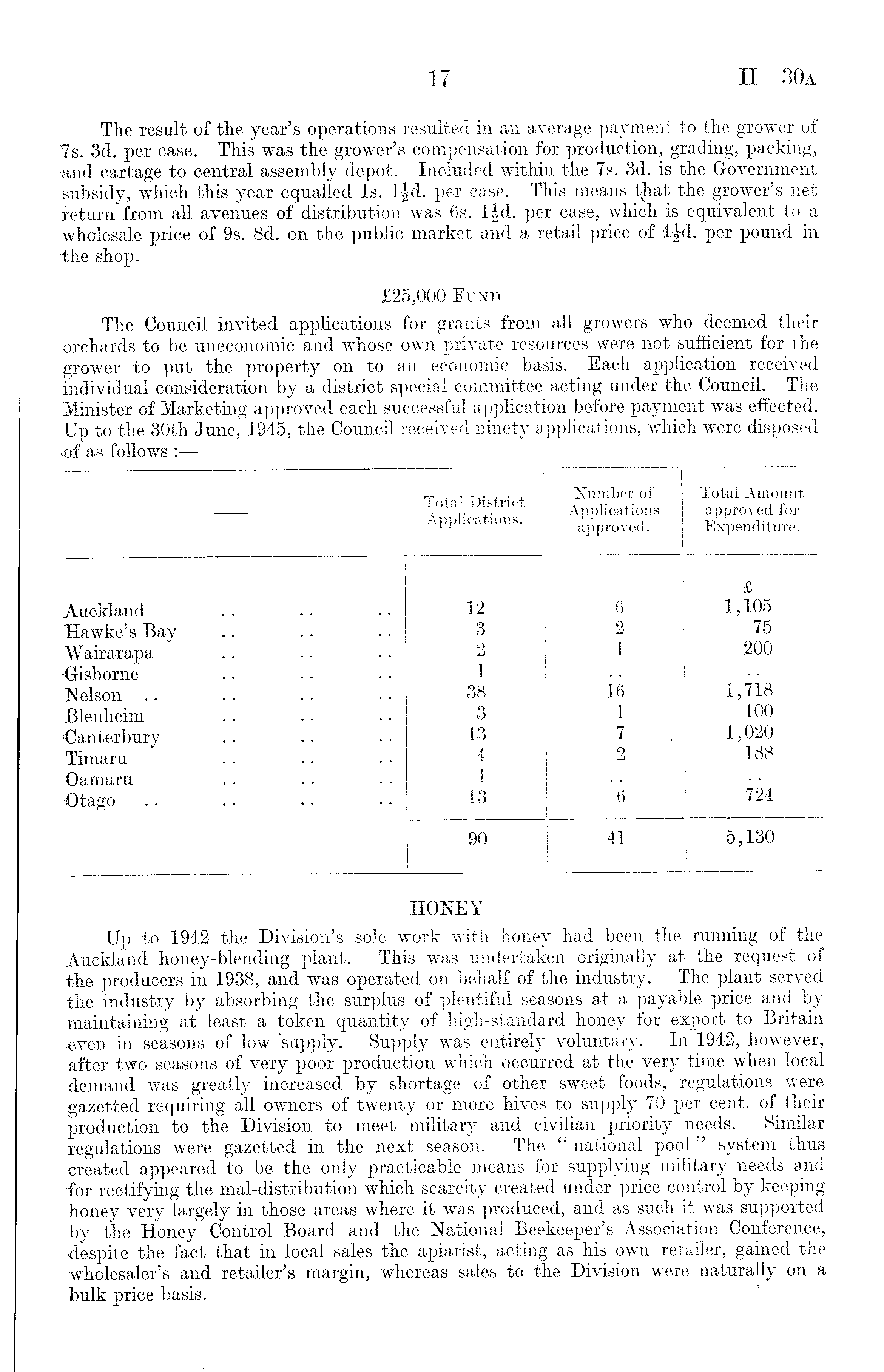 The result of the year's operations resulted in an average payment to the grower of is. 3d. per case. This was the grower's compensation for production, grading, packing, and cartage to central assembly depot. Included within the 7s. 3d. is the Government subsidy, which this year equalled Is. l£d. per case. This means that the grower's net return from all avenues of distribution was 6s. per case, which is equivalent to a wholesale price of 9s. Bd. on the public market and a retail price of 4|d. per pound in the shop. £25,000 Fund The Council invited applications for grants from all growers who deemed their orchards to be uneconomic and whose own private resources were not sufficient for the grower to put the property on to an economic basis. Bach application received individual consideration by a district special committee acting under the Council. The Minister of Marketing approved each successful application before payment was effected. Up to the 30th June, 1945, the Council received ninety applications, which were disposed of as follows :