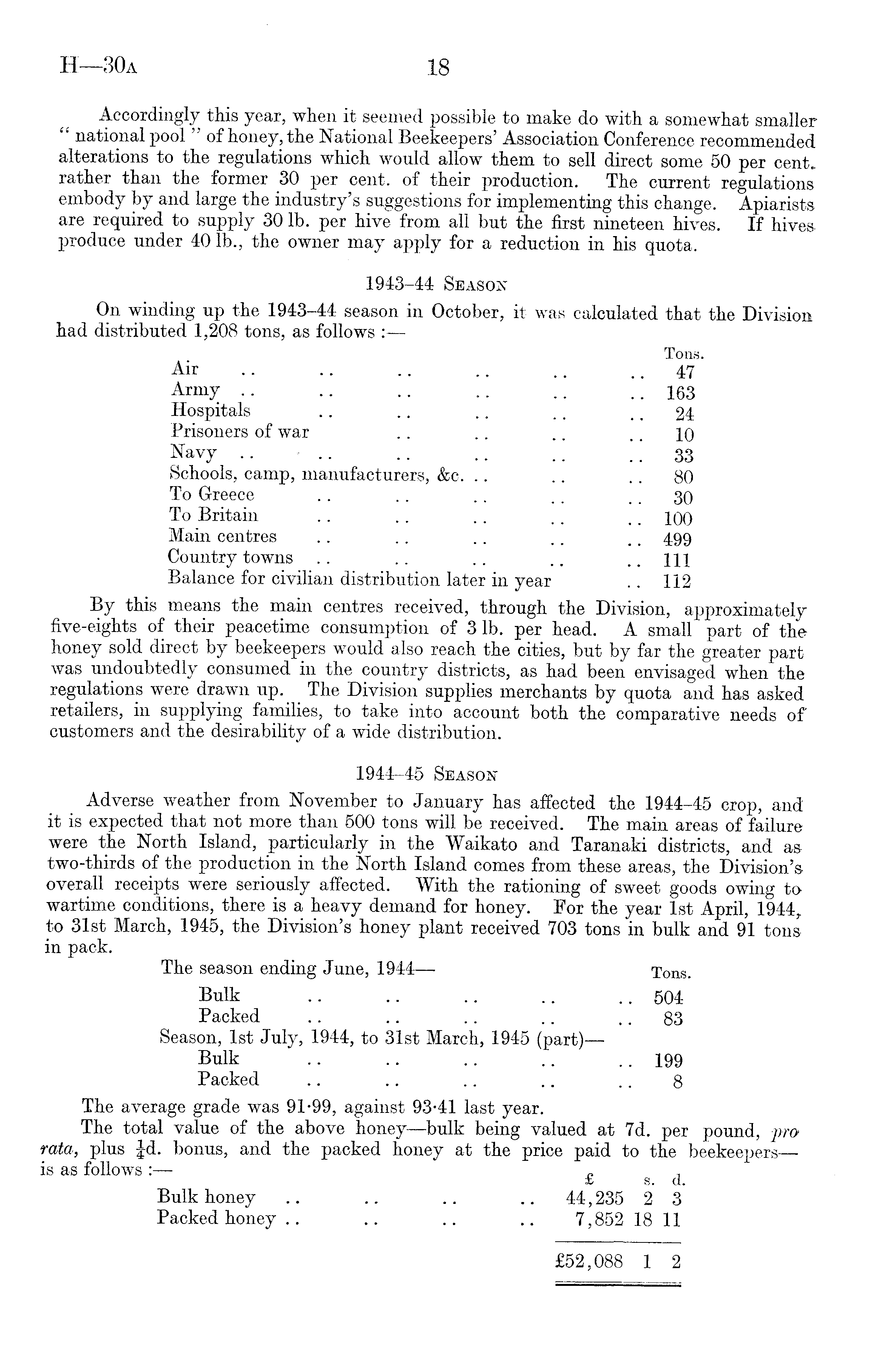 Accordingly this year, when it seemed possible to make do with a somewhat smaller " national pool " of honey, the National Beekeepers' Association Conference recommended alterations to the regulations which would allow them to sell direct some 50 per centrather than the former 30 per cent, of their production. The current regulations embody by and large the industry's suggestions for implementing this change. Apiarists are required to supply 30 lb. per hive from all but the first nineteen hires. If hives produce under 40 lb., the owner may apply for a reduction in his quota. 1943-44 Season On winding up the 1943-44 season in October, it was calculated that the Division had distributed 1,208 tons, as follows : Tons. Air .. .. .. .. .. .. 47 Army .. .. .. .. .. .. 163 Hospitals .. .. .. .. 24 Prisoners of war .. .. .. .. 10 Navy .. - .. .. .. .. 33 Schools, camp, manufacturers, &c. .. .. .. 80 To Greece .. .. .. .. .. 30 To Britain .. .. .. .. .. 100 Main centres .. .. .. .. .. 499 Country towns .. .. .. .. .. m Balance for civilian distribution later in year .. 112 By this means the main centres received, through the Division, approximately five-eights of their peacetime consumption of 3 lb. per head. A small part of the honey sold direct by beekeepers would also reach the cities, but by far the greater part was undoubtedly consumed in the country districts, as had been envisaged when the regulations were drawn up. The Division supplies merchants by quota and has asked retailers, in supplying families, to take into account both the comparative needs of customers and the desirability of a wide distribution. 1944-45 Season Adverse weather from November to January has affected the 1944-45 crop, and it is expected that not more than 500 tons will be received. The main areas of failure were the North Island, particularly in the Waikato and Taranaki districts, and as two-thirds of the production in the North Island comes from these areas, the Division's overall receipts were seriously affected. With the rationing of sweet goods owing to wartime conditions, there is a heavy demand for honey. For the year Ist April, 1944, to 31st March, 1945, the Division's honey plant received 703 tons in bulk and 91 tons in pack. The season ending June, 1944 Tons. Bulk .. .. .. .. .. 504 Packed .. .. .. .. 83 Season, Ist July, 1944, to 31st March, 1945 (part)— Bulk .. .. .. .. .. 199 Packed .. .. .. .. .. 8 The average grade was 91*99, against 93*41 last year. The total value of the above honey—bulk being valued at 7d. per pound, pro rata, plus Jd. bonus, and the packed honey at the price paid to the beekeepers—is as follows: „ , £ s. d. Bulk honey .. .. .. .. 44,235 2 3 Packed honey .. .. .. .. 7,852 18 11 £52,088 1 2