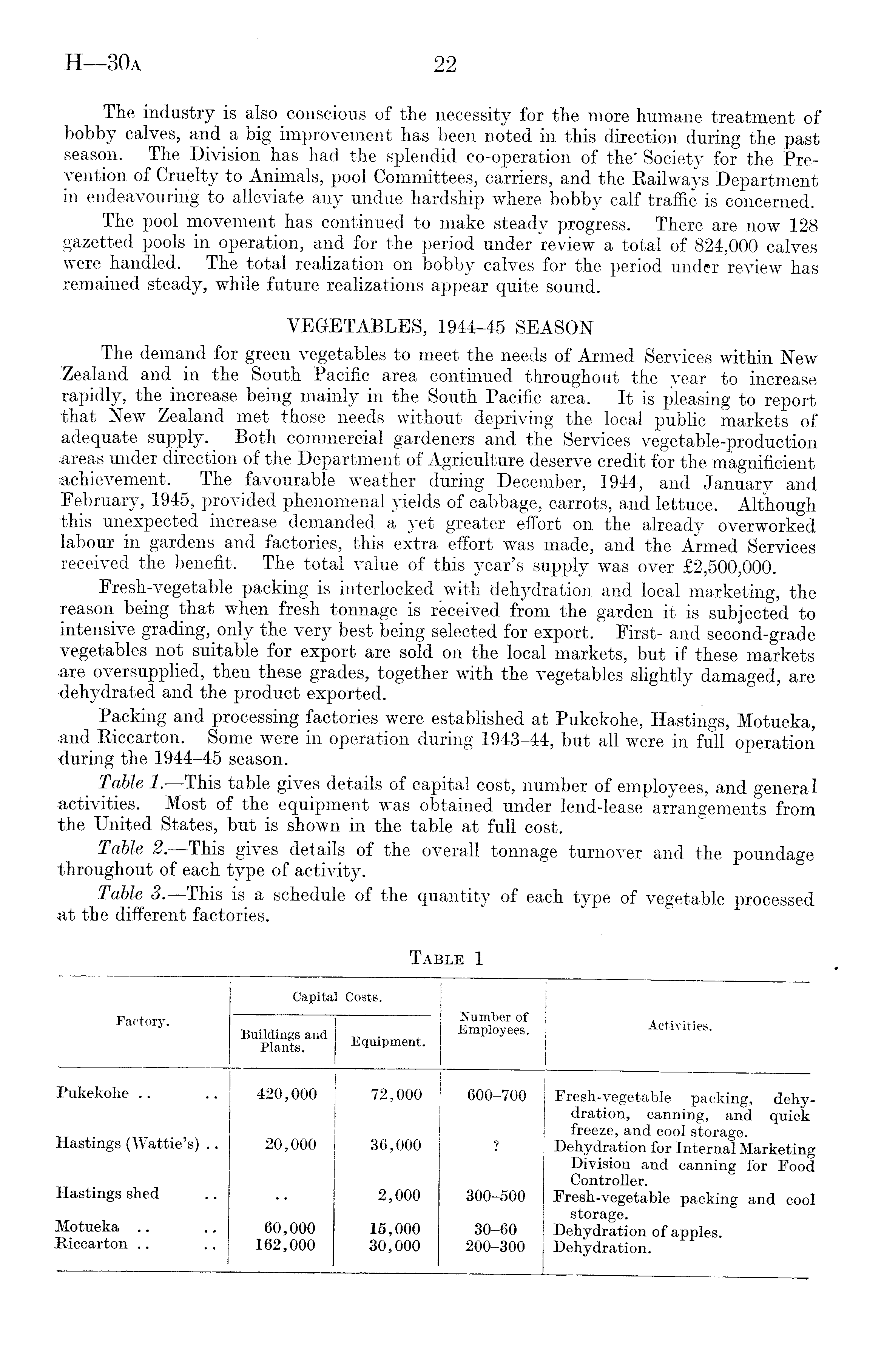 The industry is also conscious of the necessity for the more humane treatment of bobby calves, and a big improvement has been noted in this direction during the past season. The Division has had the splendid co-operation of the' Society for the Prevention of Cruelty to Animals, pool Committees, carriers, and the Railways Department in endeavouring to alleviate any undue hardship where bobby calf traffic is concerned. The pool movement has continued to make steady progress. There are now 128 gazetted pools in operation, and for the period under review a total of 824,000 calves were handled. The total realization on bobby calves for the period under review has remained steady, while future realizations appear quite sound. VEGETABLES, 1944-45 SEASON The demand for green vegetables to meet the needs of Armed Services within New .Zealand and in the South Pacific area continued throughout the year to increase rapidly, the increase being mainly in the South Pacific area. It is pleasing to report that New Zealand met those needs without depriving the local public markets of adequate supply. Both commercial gardeners and the Services vegetable-production areas under direction of the Department of Agriculture deserve credit for the magnificient achievement. The favourable weather during December, 1944, and January and February, 1945, provided phenomenal yields of cabbage, carrots, and lettuce. Although this unexpected increase demanded a yet greater effort on the already overworked labour in gardens and factories, this extra effort was made, and the Armed Services received the benefit. The total value of this year's, supply was over £2,500,000. Fresh-vegetable packing is interlocked with dehydration and local marketing, the reason being that when fresh tonnage is received from the garden it is subjected to intensive grading, only the very best being selected for export. First- and second-grade vegetables not suitable for export are sold on the local markets, but if these markets are oversupplied, then these grades, together with the vegetables slightly damaged, are dehydrated and the product exported. Packing and processing factories were established at Pukekohe, Hastings, Motueka, and Riccarton. Some were in operation during 1943-44, but all were in full operation during the 1944-45 season. Table 1. —This table gives details of capital cost, number of employees, and general activities. Most of the equipment was obtained under lend-lease arrangements from the United States, but is shown in the table at full cost. Table 2.—This gives details of the overall tonnage turnover and the poundage throughout of each type of activity. Table 3. .This is a schedule of the quantity of each type of vegetable processed at the different factories.