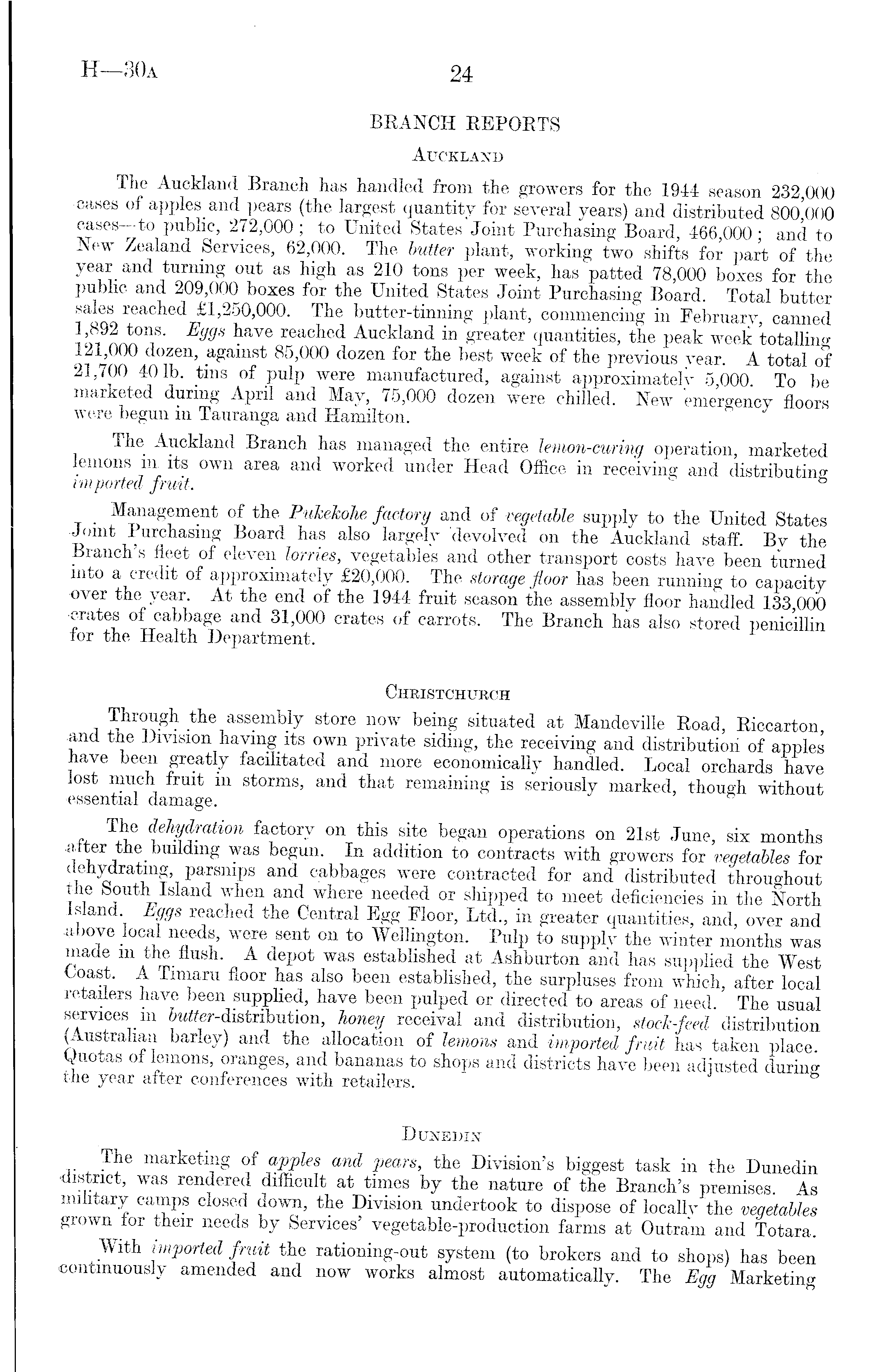 BRANCH REPORTS Auckland The Auckland Branch has handled from the growers for the 1944 season 232,000 •cases of applesand pears (the largest quantity for several years) and distributed 800000 •cases—to public, 272,000 ; to United States Joint Purchasing Board, 466,000 ; and to New Zealand Services, 62,000. The butter plant, working two shifts for part of the year and turning out as high as 210 tons per week, has patted 78,000 boxes for the public and 209,000 boxes for the United States Joint Purchasing Board. Total butter 1^ ie d £1,250,000. Tlie butter - tinnin g p!ant, commencing in February, canned AAnT' " s • 6 reaclied Auckland in greater quantities, the peak week totalling 121,000 dozen, against 85,000 dozen for the best week of the previous year. A total of '21,700 401b. tins of pulp were manufactured, against approximated 5,000. To be marketed during April and May, 75,000 dozen were chilled. New emergency floors were begun m Tauranga and Hamilton. The Auckland Branch has managed the entire lemon-curing operation, marketed lemons m, its own area and worked under Head Office in receiving and distributing imported fruit. & Management of the PuJcekohe factory and of vegetable supply to the United States Joint Purchasing Board has also largely 'devolved on the Auckland staff. Bv the Branch's fleet of eleven lorries, vegetables and other transport costs have been turned into a credit of approximately £20,000. The storage floor has been running to capacity .•over the year. At the end of the 1944 fruit season the assembly floor handled 133 000 •crates of cabbage and 31,000 crates of carrots. The Branch has also stored penicillin for the Health Department. Christchurch Through the assembly store now being situated at Mandeville Road, Riccarton ■and the Division having its own private siding, the receiving and distribution of apples have been greatly facilitated and more economically handled. Local orchards have lost much fruit m storms, and that remaining is seriously marked, though without •essential damage. & T A 6 factory on this site began operations on 21st June, six months after the budding was begun. In addition to contracts with growers for vegetables for dehydrating parsnips and cabbages were contracted for and distributed throughout the bouth Island when and where needed or shipped to meet deficiencies in the North Island Eggs reached the Central Egg Floor, Ltd., in greater quantities, and, over and oje loc f 1 1 n^ d s, were sent on to Wellington. Pulp to supply the winter months was made m the flush. A depot was established at Ashburton and has supplied the West •toast. A Timaru floor has also been established, the surpluses from which, after local retailers have been supplied, have been pulped or directed to areas of need. The usual services m &wZter-distribution, honey receival and distribution, stock-feed distribution (Australian barley) and the allocation of lemons and imported fruit has taken place. Quotas of lemons, oranges, and bananas to shops and districts have been adjusted during the year after conferences with retailers. Dune din The marketing of apples and pears, the Division's biggest task in the Dunedin district, was rendered difficult at times by the nature of the Branch's premises. As military camps closed down, the Division undertook to dispose of locally the vegetables grown for their needs by Services' vegetable-production farms at Outram and Totara. With imported fruit the rationing-out system (to brokers and to shops) has been continuously amended and now works almost automatically. The Egg Marketing