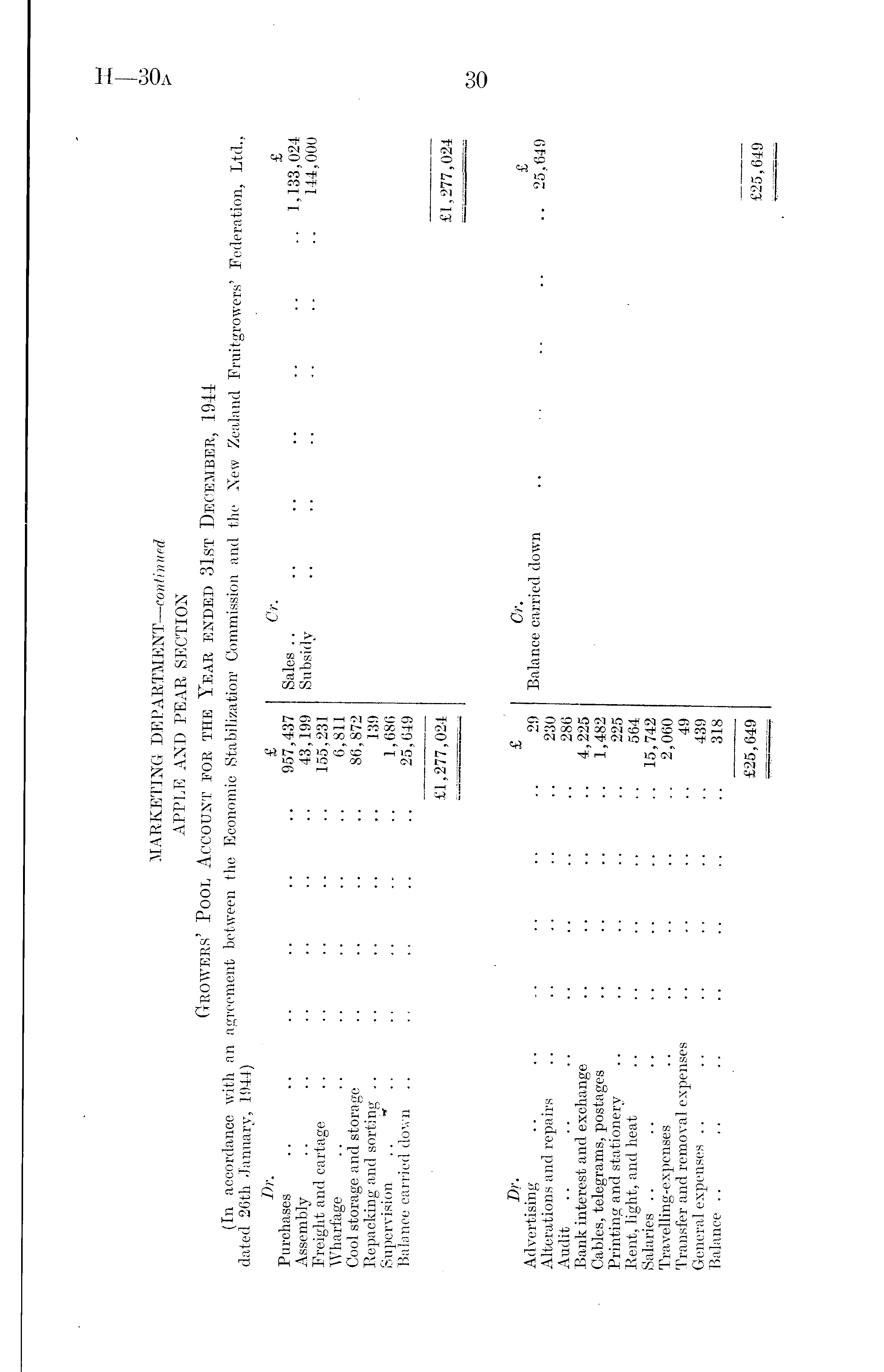 MARKETING DEPARTMENT— continued APPLE AND PEAR SECTION Growers' Pool Account for the Year ended 31st December, 19M , f co T ordance with an agreement between the Economic Stabilization' Commission and the New Zealand Fruitgrowers' Federation Ltd dated 26th January, 1944) > •> Dr • £ Cr. £ Purchases .. .. .. .. .. .. 957,437 Sales.. .. .. .. 1 IS*} 024 Assembly .. .. 43,199 Subsidy .. .. .. " " ' 144/000 Freight and cartage .......... 155,231 ' Wharfage .. .. .. .. .. .. 6,811 Cool storage and storage .. .. .. .. 86,872 Repacking and sorting .. .. .. .. .. 139 Supervision -.. • .. .. .. .. .. 1,686 Balance carried down .. . .. .. .. 25,649 £1,277,024 £1,277,024 Dr- £ Cr. £ Advertising .. .. .. .. .. .. 29 Balance carried down .. . . .. ~ 05 *540 Alterations and repairs .. .. .. .. .. 230 " " ' Audit .. .. .. .. .. .. .. 286 Bank interest and exchange .. .. .. .. 4,225 Cables, telegrams, postages .. .. .. .. 1,482 Printing and stationery .. .. .. .. .. 225 Rent, light, and heat .. .. .. .. .. 564 Salaries .. .. .. .. .. .. .. 15,742 Travelling-expenses .. .. .. .. 2,060 Transfer and removal expenses .. .. .. .. 49 General expenses .. .. .. .. .. .. 439 Balance .. .. .. .. .. .. .. 318 £25 ' 649 £25,649