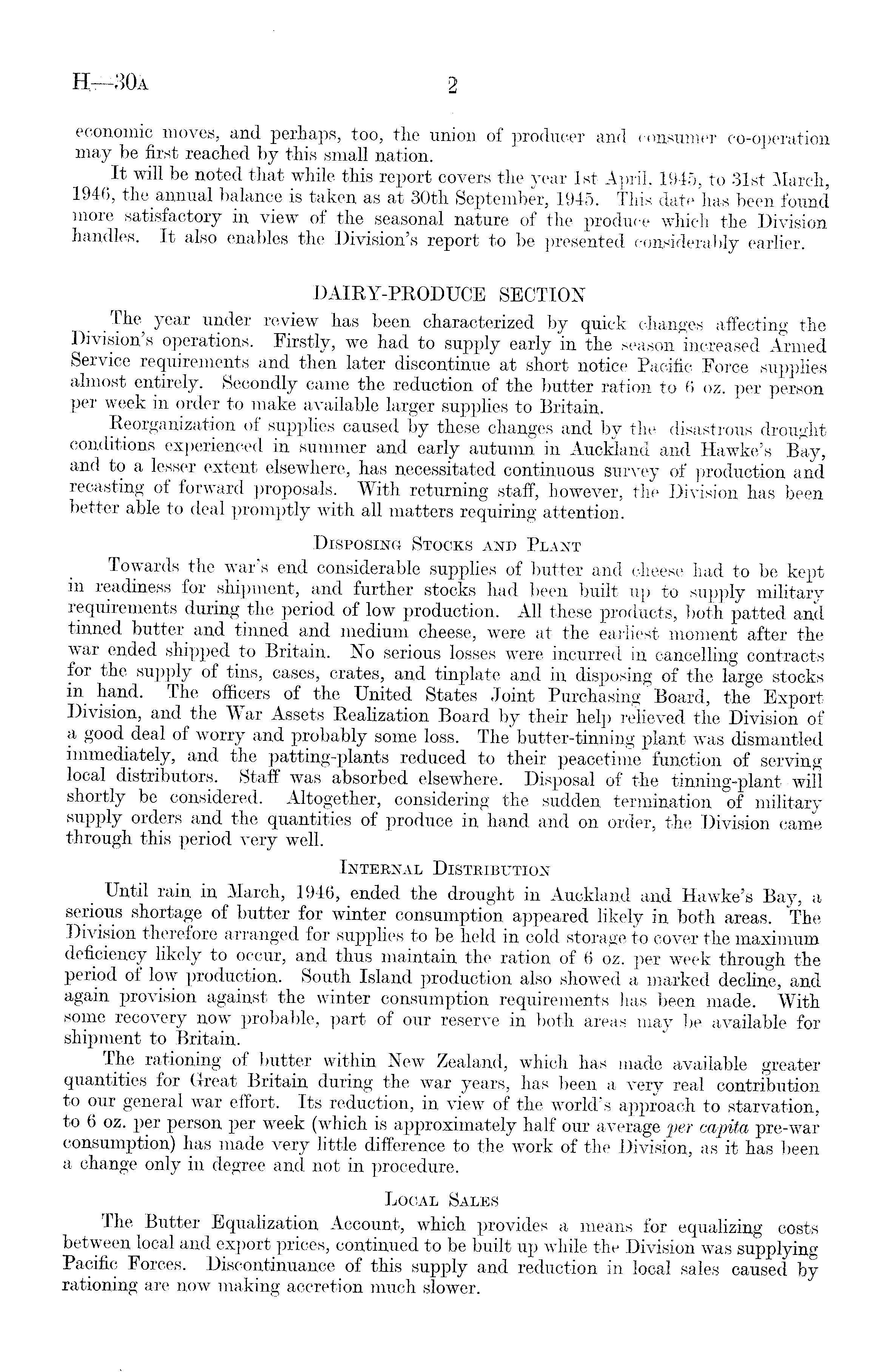 economic moves, and perhaps, too, the union of producer and consumer co-operation may be first reached by this small nation. It will be noted that while this report covers the year Ist April, 1945, to 31st March, 1946, the annual balance is taken as at 30th September, 1945. This date has been found more satisfactory in view of the seasonal nature of the produce which the Division handles. It also enables the Division's report to be presented considerably earlier. DAIRY-PRODUCE SECTION The year under review has been characterized by quick changes affecting the Division's operations. Firstly, we had to supply early in the season increased Armed Service requirements and then later discontinue at short notice Pacific Force supplies almost entirely. Secondly came the reduction of the butter ration to 6 oz. per person per week in order to make available larger supplies to Britain. Reorganization of supplies caused by these changes and by the disastrous drought conditions experienced in summer and early autumn in Auckland and Hawke's Bay, and to a lesser extent elsewhere, has necessitated continuous survey of production and recasting of forward proposals. With returning staff, however, the Division has been better able to deal promptly with all matters requiring attention. Disposing Stocks and Plant Towards the war's end considerable supplies of butter and cheese had to be kept in readiness for shipment, and further stocks had been built up to supply military requirements during the period of low production. All these products, both patted and tinned butter and tinned and medium cheese, were at the earliest moment after the war ended shipped to Britain. No serious losses were incurred in cancelling contracts for the supply of tins, cases, crates, and tinplate and in disposing of the large stocks in hand. The officers of the United States Joint Purchasing Board, the Export Division, and the War Assets Realization Board by their help relieved the Division of a good deal of worry and probably some loss. The butter-tinning plant was dismantled immediately, and the patting-plants reduced to their peacetime function of serving local distributors. Staff was absorbed elsewhere. Disposal of the tinning-plant will shortly be considered. Altogether, considering the sudden termination of military supply orders and the quantities of produce in hand and on order, the Division came through this period very well. Internal Distribution Until rain in March, 1946, ended the drought in Auckland and Hawke's Bay, a serious shortage of butter for winter consumption appeared likely in both areas. The Division therefore arranged for supplies to be held in cold storage to cover the maximum deficiency likely to occur,' and thus maintain the ration of 6 oz. per week through the period of low production. South Island production also showed a marked decline, and again provision against the winter consumption requirements has been made. With some recovery now probable, part of our reserve in both areas may be available for shipment to Britain. The rationing of butter within New Zealand, which has made available greater quantities for Great Britain during the war years, has been a very real contribution to our general war effort. Its reduction, in view of the world's approach to starvation, to 6 oz. per person per week (which is approximately half our average per capita pre-war consumption) has made very little difference to the work of the Division, as it has been a change only in degree and not in procedure. Local Sales The Butter Equalization Account, which provides a means for equalizing costs between local and export prices, continued to be built up while the Division was supplying Pacific Forces. Discontinuance of this supply and reduction in local sales caused by rationing are now making accretion much slower.