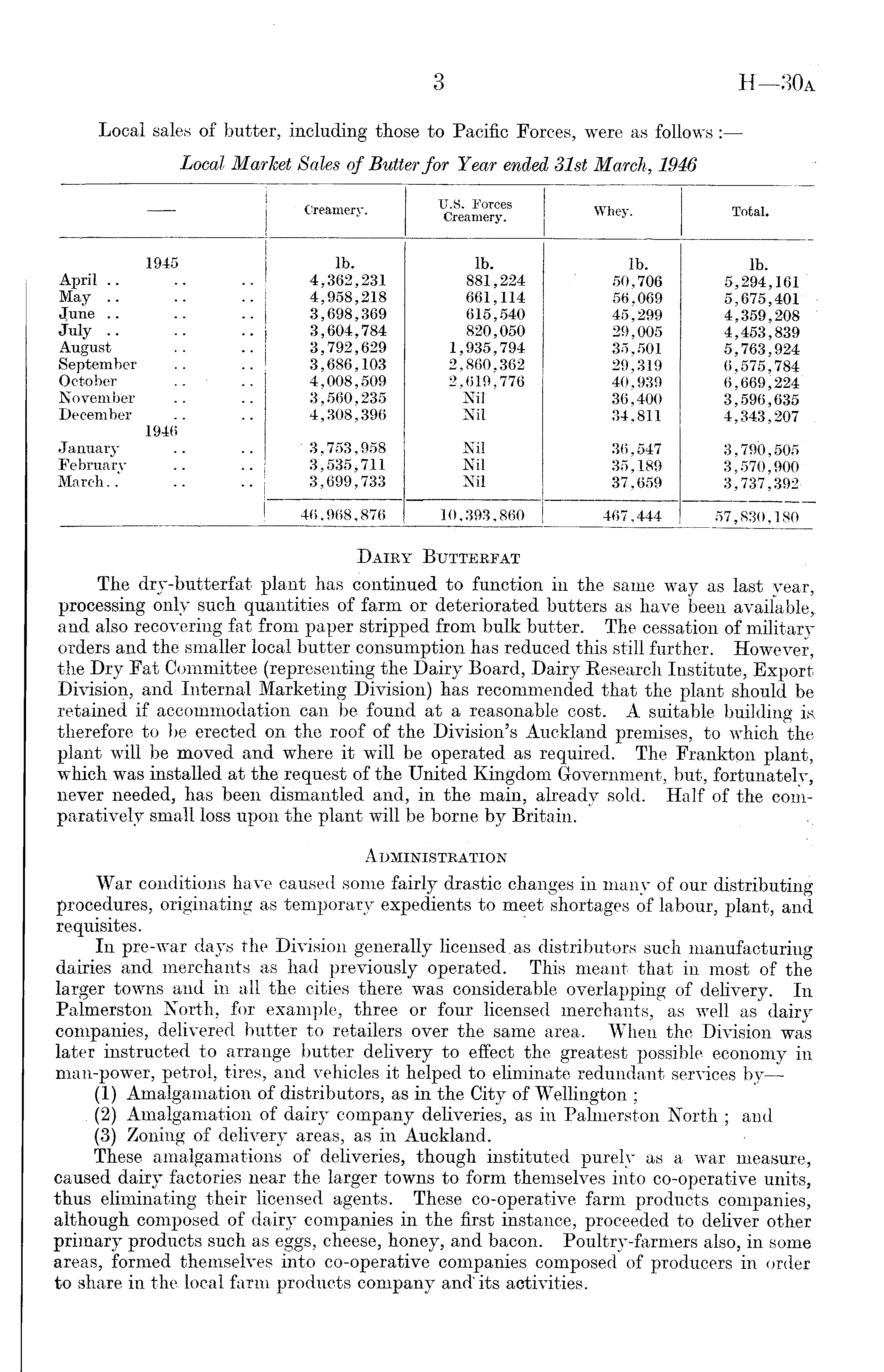 — Creamery. U.S. Forces Creamery. Whey. Total. 1945 April May .. June July August September October November December 1946 January February March lb. 4,362,231 4,958,218 3,698,369 3,604,784 3,792,629 3,686,103 4,008,509 3,560,235 4,308,396 3,753,958 3,535,711 3,699,733 lb. 881,224 661,114 615,540 820,050 1,935,794 2,860.362 2,619,776 Nil Nil Nil Nil Nil lb. 50,706 56,069 45,299 29,005 35,501 29,319 40,939 36,400 34,811 36,547 35,189 37,659 lb. 5,294,161 5,675,401 4,359,208 4,453,839 5,763,924 6,575,784 6,669,224 3,596,635 4,343,207 3,790,505 3,570,900 3,737,392 46,968,876 10,393,860 467,444 57,830,180