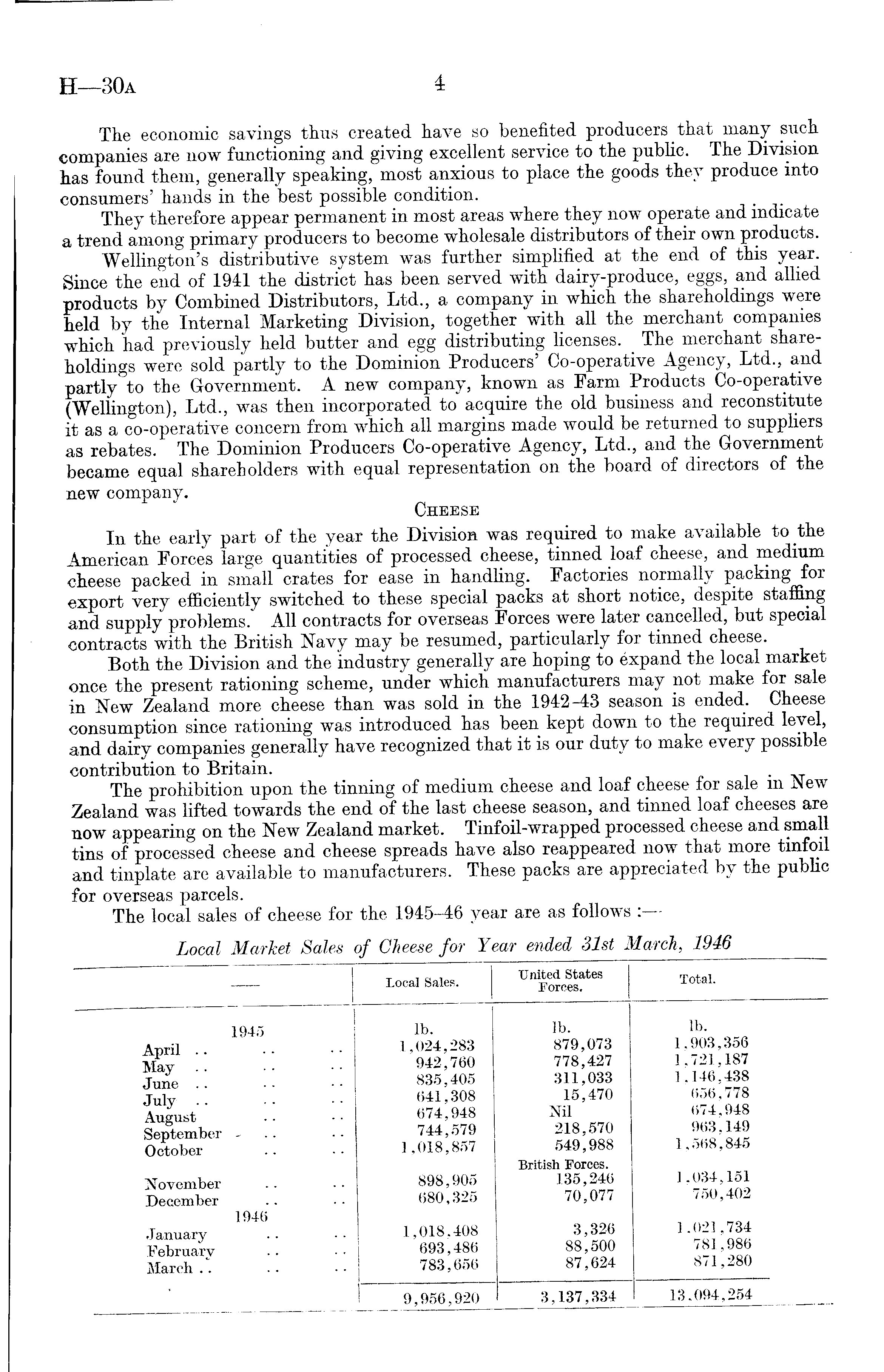 The economic savings thus created have so benefited producers that many such companies are now functioning and giving excellent service to the public. The Division has found them, generally speaking, most anxious to place the goods they produce into consumers' hands in the best possible condition. They therefore appear permanent in most areas where they now operate and indicate a trend among primary producers to become wholesale distributors of their own products. Wellington's distributive system was further simplified at the end of this year. Since the end of 1941 the district has been served with dairy-produce, eggs, and allied products by Combined Distributors, Ltd., a company in which the shareholdings were held by the Internal Marketing Division, together with all the merchant companies which had previously held butter and egg distributing licenses. The merchant shareholdings were sold partly to the Dominion Producers' Co-operative Agency, Ltd., and partly to the Government. A new company, known as Farm Products Co-operative (Wellington), Ltd., was then incorporated to acquire the old business and reconstitute it as a co-operative concern from which all margins made would be returned to suppliers as rebates. The Dominion Producers Co-operative Agency, Ltd., and the Government became equal shareholders with equal representation on the board of directors of the new company. Cheese In the early part of the year the Division was required to make available to the American Forces large quantities of processed cheese, tinned loaf cheese, and medium cheese packed in small crates for ease in handling. Factories normally packing for export very efficiently switched to these special packs at short notice, despite staffing and supply problems. All contracts for overseas Forces were later cancelled, but special contracts with the British Navy may be resumed, particularly for tinned cheese. Both the Division and the industry generally are hoping to expand the local market once the present rationing scheme, under which manufacturers may not make for sale in New Zealand more cheese than was sold in the 1942-43 season is ended. Cheese consumption since rationing was introduced has been kept down to the required level, and dairy companies generally have recognized that it is our duty to make every possible contribution to Britain. . . AT The prohibition upon the tinning of medium cheese and loaf cheese tor sale in JNew Zealand was lifted towards the end of the last cheese season, and tinned loaf cheeses are now appearing on the New Zealand market. Tinfoil-wrapped processed cheese and small tins of processed cheese and cheese spreads have also reappeared now that more tinfoil and tinplate are available to manufacturers. These packs are appreciated by the public for overseas parcels. The local sales of cheese for the 1945-46 year are as follows