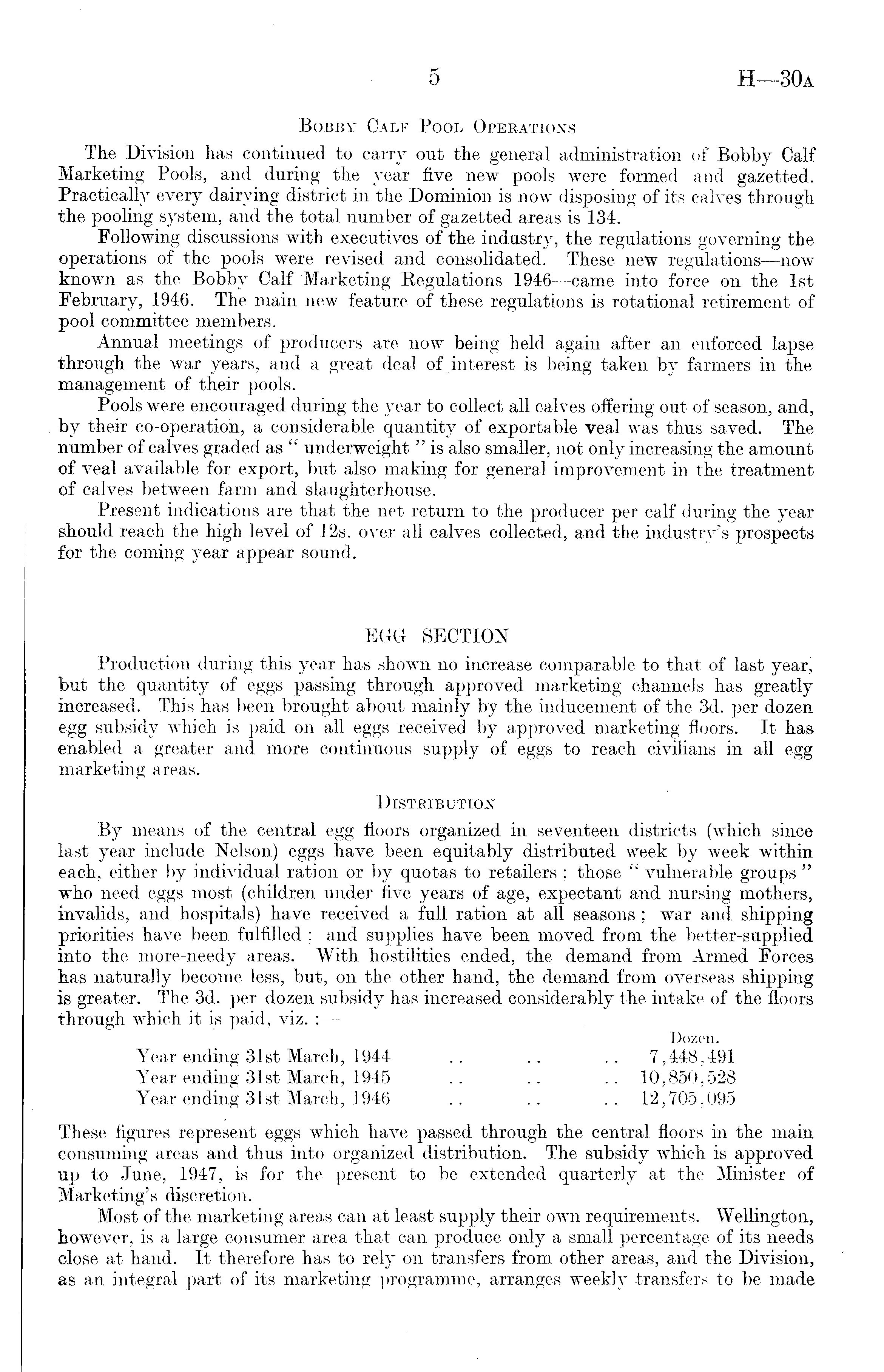 Bobby Calf Pool Operations The Division has continued to carry out the general administration of Bobby Calf Marketing Pools, and during the year five new pools were formed and gazetted. Practically every dairying district in the Dominion is now disposing of its calves through the pooling system, and the total number of gazetted areas is 134. Following discussions with executives of the industry, the regulations governing the operations of the pools were revised and consolidated. These new regulations—now known as the Bobby Calf Marketing Regulations 1946—came into force on the Ist February, 1946. The main new feature of these regulations is rotational retirement of pool committee members. Annual meetings of producers are now being held again after an enforced lapse through the war years, and a great deal of interest is being taken by farmers in the management of their pools. Pools were encouraged during the year to collect all calves offering out of season, and, by their co-operation, a considerable quantity of exportable Veal was thus saved. The number of calves graded as " underweight " is also smaller, not only increasing the amount of veal available for export, but also making for general improvement in the treatment of calves between farm and slaughterhouse. Present indications are that the net return to the producer per calf during the year should reach the high level of 12s. over all calves collected, and the industry's prospects for the coming year appear sound. EGG SECTION Production during this year has shown no increase comparable to that of last year, but the quantity of eggs passing through approved marketing channels has greatly increased. This has been brought about mainly by the inducement of the 3d. per dozen egg subsidy which is paid on all eggs received by approved marketing floors. It has enabled a greater and more continuous supply of eggs to reach civilians in all egg marketing areas. Distribution By means of the central egg floors organized in seventeen districts (which since last year include Nelson) eggs have been equitably distributed week by week within each, either by individual ration or by quotas to retailers ; those " vulnerable groups " who need eggs most (children under five years of age, expectant and nursing mothers, invalids, and hospitals) have received a full ration at all seasons; war and shipping priorities have been fulfilled ; and supplies have been moved from the better-supplied into the more-needy areas. With hostilities ended, the demand from Armed Forces has naturally become less, but, on the other hand, the demand from overseas shipping is greater. The 3d. per dozen subsidy has increased considerably the intake of the floors through which it is paid, viz. : Dozen. Year ending 31st March, 1944 .. .. .. 7,448,491 Year ending 31st March, 1945 .. .. .. 10,850,528 Year ending 31st March, 1946 .. .. .. 12,705,095 These figures represent eggs which have passed through the central floors in the main consuming areas and thus into organized distribution. The subsidy which is approved up to June, 1947, is for the present to be extended quarterly at the Minister of Marketing's discretion. Most of the marketing areas can at least supply their own requirements. Wellington, however, is a large consumer area that can produce only a small percentage of its needs close at hand. It therefore has to rely on transfers from other areas, and the Division, as an integral part of its marketing programme, arranges weekly transfers to be made