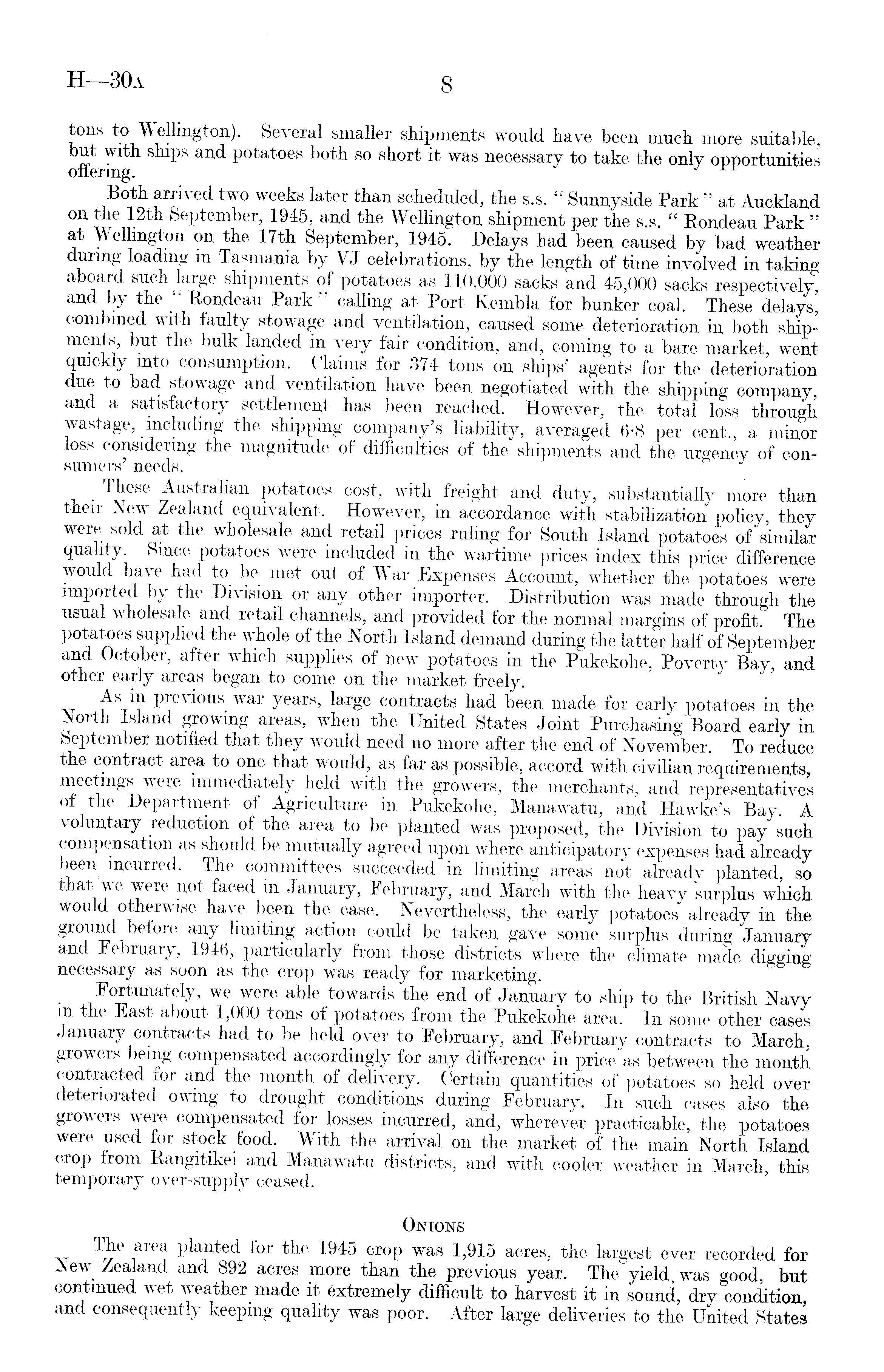 tons to Wellington). Several smaller shipments would have been much more suitable, but with ships and potatoes both so short it was necessary to take the only opportunities Both arrived two weeks later than scheduled, the s.s. " Sunnyside Park " at Auckland 011 ™: e 12th September, 1945, and the Wellington shipment per the s.s. " Rondeau Park " at Wellington on the 17th September, 1945. Delays had been caused by bad weather during loading m Tasmania by VJ celebrations, by the length of time involved in taking aboard such large shipments of potatoes as 110,000 sacks and 45,000 sacks respectively, and by the Rondeau Park " calling at Port Kembla for bunker coal. These delays, combined with faulty stowage and ventilation, caused some deterioration in both shipments, but the bulk landed m very fair condition, and, coming to a bare market, went quickly into consumption. Claims for 374 tons on ships' agents for the deterioration due to bad stowage and ventilation have been negotiated with the shipping company and a satisfactory settlement has been reached. However, the total loss through wastage, including the shipping company's liability, averaged 6-8 per cent., a minor loss considering the magnitude of difficulties of the shipments and the urgency of consumers needs. , . T i ese Australian potatoes cost, with freight and duty, substantially more than their New Zealand equivalent. However, in accordance with stabilization policy, they were sold at the wholesale and retail prices ruling for South Island potatoes of similar quality Since potatoes were included in the wartime prices index this price difference would have had to be met out of War Expenses Account, whether the potatoes were imported by the Division or any other importer. Distribution was made through the usual wholesale and retail channels, and provided for the normal margins of profit The potatoes supplied the whole of the North Island demand during the latter half of September and October, after which supplies of new potatoes in the Pukekohe, Poverty Bay, and other early areas began to come on the market freely. Previous war years, large contracts had been made for early potatoes in the North Island growing areas, when the United States Joint Purchasing Board early in September notified that they would need no more after the end of November. To reduce the contract area to one that would, as far as possible, accord with civilian requirements, meetings were immediately held with the growers, the merchants, and representatives of the Department of Agriculture in Pukekohe, Manawatu, and Hawke's Bay. A voluntary reduction of the area to be planted was proposed, the Division to pay such compensation as should be mutually agreed upon where anticipatory expenses had already been incurred. The committees succeeded in limiting areas not already planted, so that we were not faced in January, February, and March with the heavy surplus which would Otherwise have been the case. Nevertheless, the early potatoes already in the ground before any limiting action could be taken gave some surplus during January and February, 1946, particularly from those districts where the climate made digging necessary as soon as the crop was ready for marketing. Fortunately, we were able towards the end of January to ship to the British Navy in the East about 1,000 tons of potatoes from the Pukekohe area. In some other cases January contracts had to be held over to February, and February contracts to March, growers being compensated accordingly for any difference in price as between the month contracted for and the month of delivery. Certain quantities of potatoes so held over deteriorated owing to drought conditions during February. In such cases also the growers were compensated for losses incurred, and, wherever practicable, the potatoes were used for stock food. With the arrival on the market of the main North Island crop from Rangitikei and Manawatu districts, and with cooler weather in March this temporary over-supply ceased. Onions The area planted for the 1945 crop was 1,915 acres, the largest ever recorded for ew _ Zealand and 892 acres more than the previous year. The yield, was good, but continued wet weather made it extremely difficult to harvest it in sound, dry condition, and consequently keeping quality was poor. After large deliveries to the United States