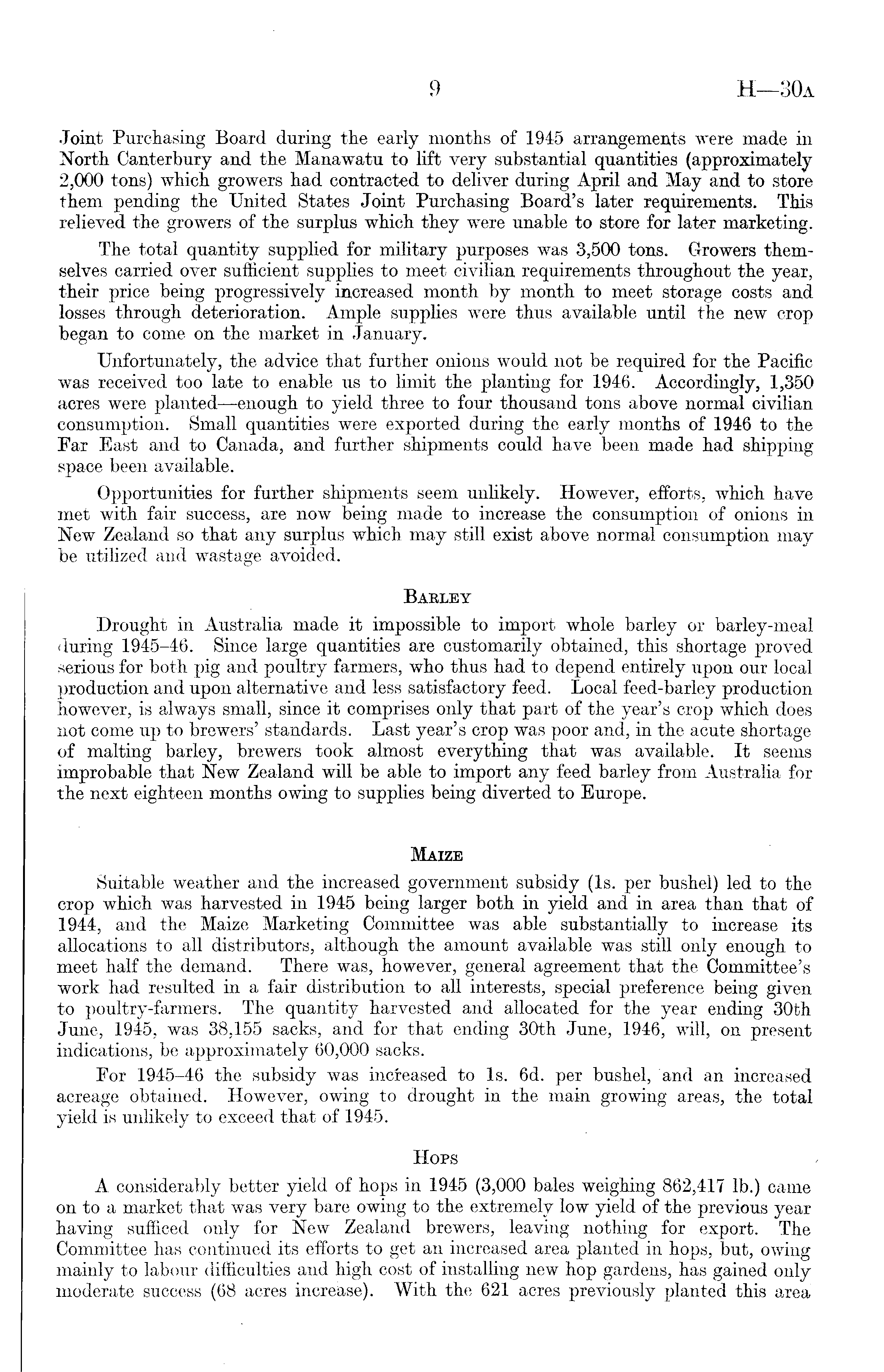 Joint Purchasing Board during the early months of 1945 arrangements were made in North Canterbury and the Manawatu to lift very substantial quantities (approximately 2,000 tons) which growers had contracted to deliver during April and May and to store them pending the United States Joint Purchasing Board's later requirements. This relieved the growers of the surplus which they were unable to store for later marketing. The total quantity supplied for military purposes was 3,500 tons. Growers themselves carried over sufficient supplies to meet civilian requirements throughout the year, their price being progressively increased month by month to meet storage costs and losses through deterioration. Ample supplies were thus available until the new crop began to come on the market in January. Unfortunately, the advice that further onions would not be required for the Pacific was received too late to enable us to limit the planting for 1946. Accordingly, 1,350 acres were planted—enough to yield three to four thousand tons above normal civilian consumption. Small quantities were exported during the early months of 1946 to the Far East and to Canada, and further shipments could have been made had shipping space been available. Opportunities for further shipments seem unlikely. However, efforts, which have met with fair success, are now being made to increase the consumption of onions in New Zealand so that any surplus which may still exist above normal consumption may be utilized and wastage avoided. Barley Drought in Australia made it impossible to import whole barley or barley-meal during 1945-46. Since large quantities are customarily obtained, this shortage proved serious for both pig and poultry farmers, who thus had to depend entirely upon our local production and upon alternative and less satisfactory feed. Local feed-barley production however, is always small, since it comprises only that part of the year's crop which does not come up to brewers' standards. Last year's crop was poor and, in the acute shortage of malting barley, brewers took almost everything that was available. It seems improbable that New Zealand will be able to import any feed barley from Australia for the next eighteen months owing to supplies being diverted to Europe. Matzf, Suitable weather and the increased government subsidy (Is. per bushel) led to the crop which was harvested in 1945 being larger both in yield and in area than that of 1944, and the Maize Marketing Committee was able substantially to increase its allocations to all distributors, although the amount available was still only enough to meet half the demand. There was, however, general agreement that the Committee's work had resulted in a fair distribution to all interests, special preference being given to poultry-farmers. The quantity harvested and allocated for the year ending 30th June, 1945, was 38,155 sacks, and for that ending 30th June, 1946, will, on present indications, be approximately 60,000 sacks. For 1945-46 the subsidy was increased to Is. 6d. per bushel, and an increased acreage obtained. However, owing to drought in the main growing areas, the total yield is unlikely to exceed that of 1945. Hops A. considerably better yield of hops in 1945 (3,000 bales weighing 862,417 lb.) came on to a market that was very bare owing to the extremely low yield of the previous year having sufficed only for New Zealand brewers, leaving nothing for export. The Committee has continued its efforts to get an increased area planted in hops, but, owing mainly to labour difficulties and high cost of installing new hop gardens, has gained only moderate success (68 acres increase). With the 621 acres previously planted this area