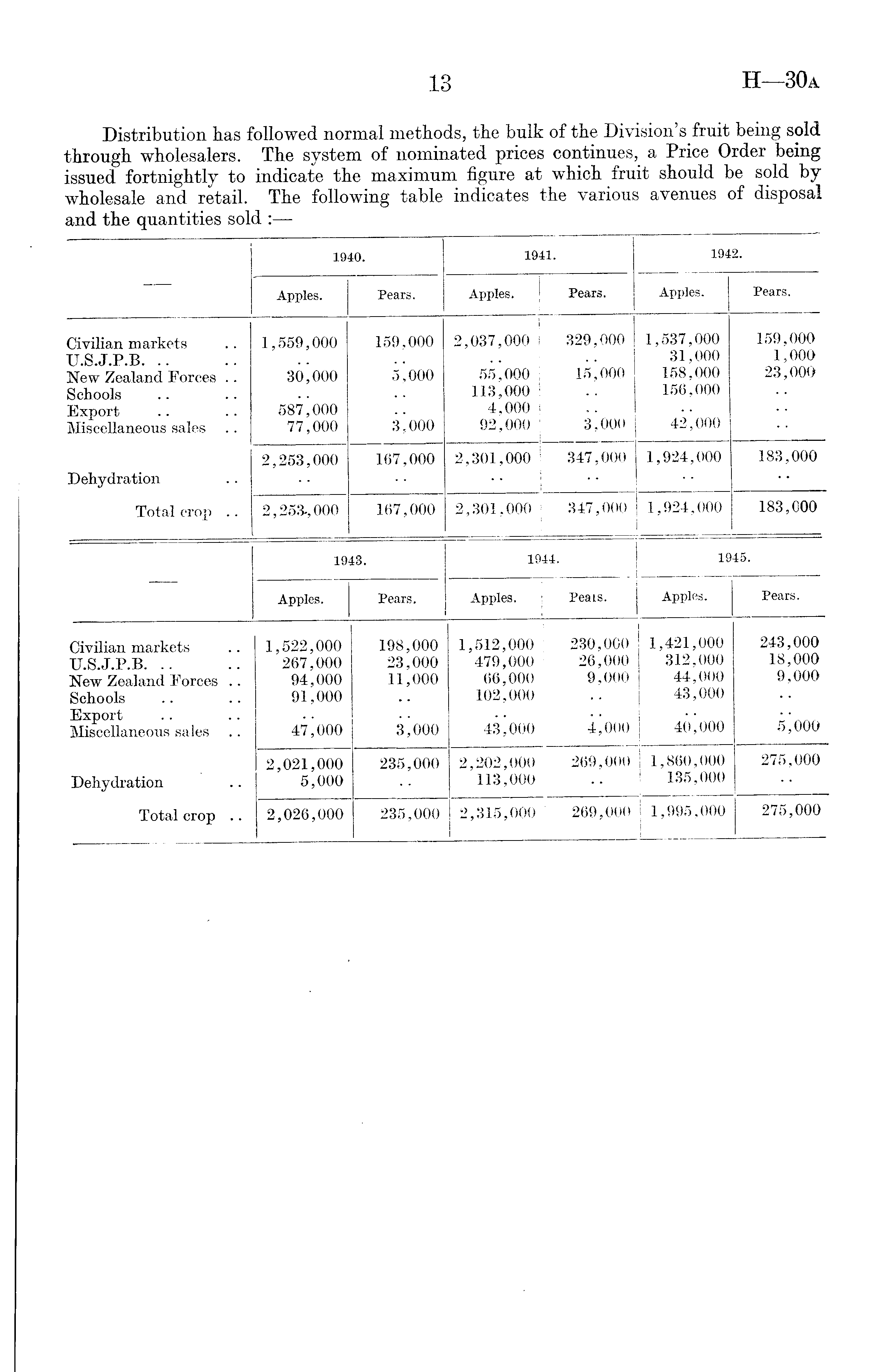 — 1940. 1941. 1942. Apples. Pears. Apples. Pears. Apples. Pears. Civilian markets U.S.J.P.B. New Zealand Forces .. Schools Export Miscellaneous sales Dehydration Total crop .. 1,559,000 30,000 587,000 77,000 159,000 5^000 3 joOO 2,037,000 55,000 113,000 4,000 92,000 329,000 15,000 3,000 1,537,000 31,000 158,000 156,000 42,000 159,000 1,000 23,000 2,253,000 167,000 2,301,000 347,000 1,924,000 183,000 2,253-, 000 167,000 2,301,000 347,000 1,924,000 183,000 1943. 1944. 1945. Apples. Pears. Apples. Peais. Apples. Pears. Civilian markets U.S.J.P.B New Zealand Forces .. Schools Export Miscellaneous sales Dehydration Total crop .. 1,522,000 267,000 94,000 91,000 47,000 198,000 23,000 11,000 3^000 1,512,000 479,000 66,000 102,000 43j 000 230,000 26,000 9,000 ijooo 1,421,000 312,000 44,000 43,000 40,000 243,000 18,000 9,000 5 joOO 2,021,000 5,000 235,000 2,202,000 113,000 269,000 1,860,000 135,000 275,000 2,026,000 235,000 2,315,000 269,000 1,995,000 275,000