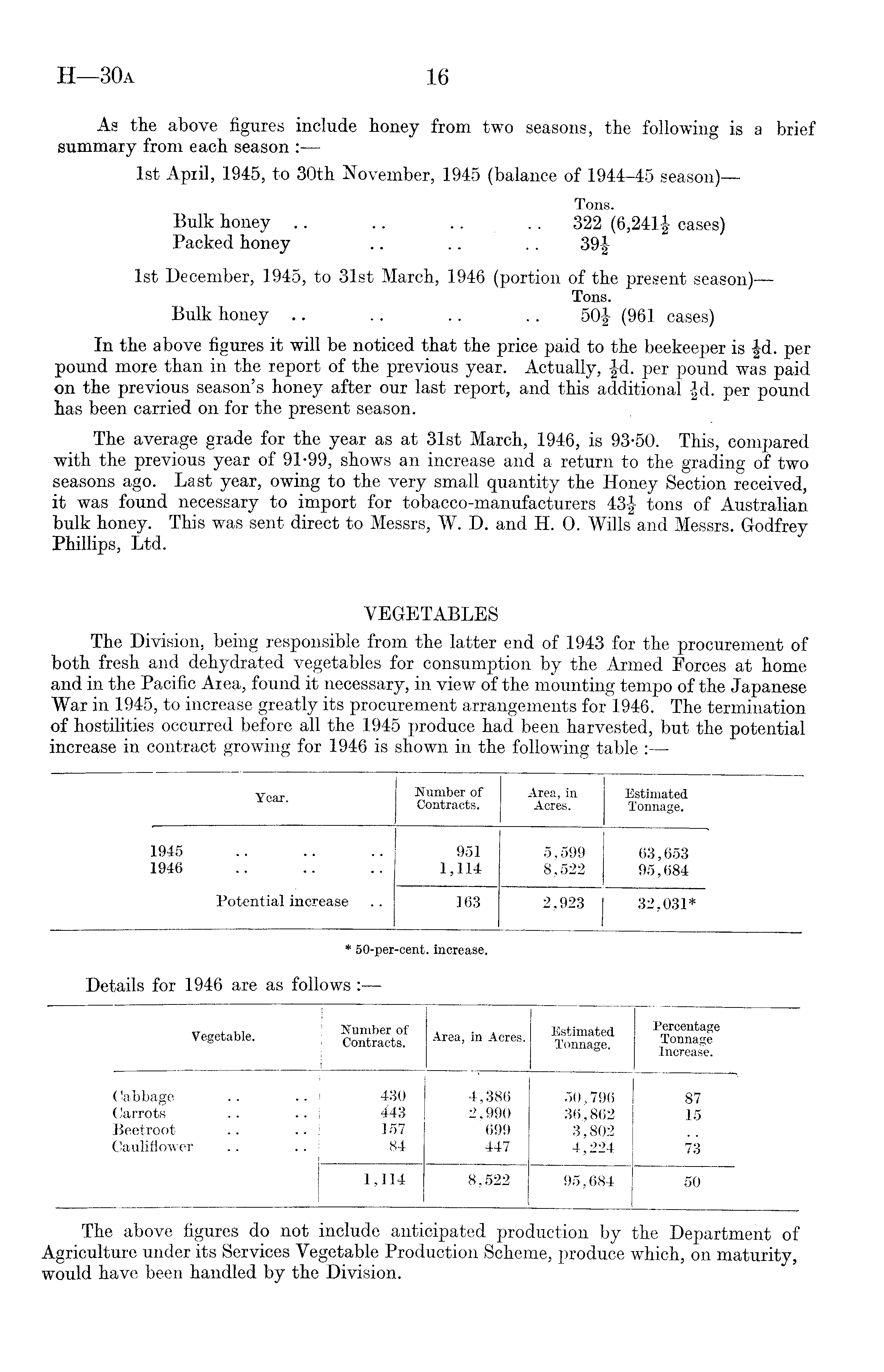 As the above figures include honey from two seasons, the following is a brief summary from each season : Ist April, 1945, to 30th November, 1945 (balance of 1944-45 season) — Tons. Bulk honey .. .. .... 322 (6,241£ cases) Packed honey .. .. .. 39| Ist December, 1945, to 31st March, 1946 (portion of the present season) — Tons. Bulk honey .. .. .. .. 50| (961 cases) In the above figures it will be noticed that the price paid to the beekeeper is |d. per pound more than in the report of the previous year. Actually, |d. per pound was paid on the previous season's honey after our last report, and this additional £d. per pound has been carried on for the present season. The average grade for the year as at 31st March, 1946, is 93-50. This, compared with the previous year of 91-99, shows an increase and a return to the grading of two seasons ago. Last year, owing to the very small quantity the Honey Section received, it was found necessary to import for tobacco-manufacturers 43J tons of Australian bulk honey. This was sent direct to Messrs, W. D. and H. 0. Wills and Messrs. Godfrey Phillips, Ltd. VEGETABLES The Division, being responsible from the latter end of 1943 for the procurement of both fresh and dehydrated vegetables for consumption by the Armed Forces at home and in the Pacific Area, found it necessary, in view of the mounting tempo of the Japanese War in 1945, to increase greatly its procurement arrangements for 1946. The termination of hostilities occurred before all the 1945 produce had been harvested, but the potential increase in contract growing for 1946 is shown in the following table :