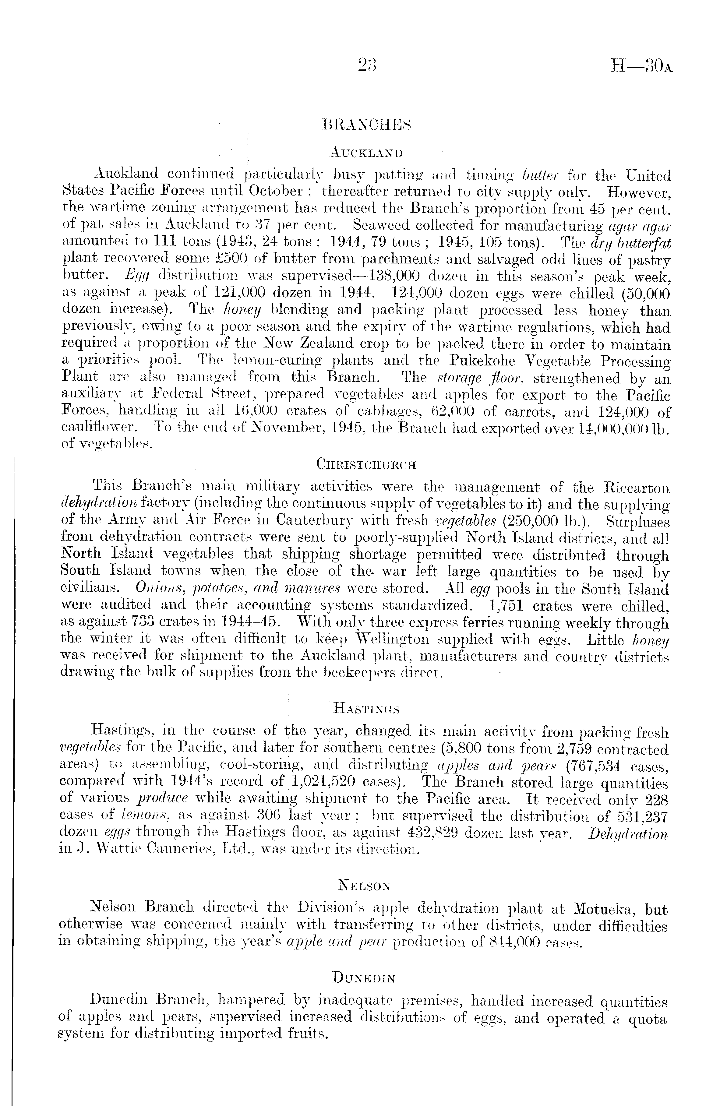 BRANCHES i. i Auckland Auckland continued particularly busy patting and tinning butter for tlie United States Pacific Forces until October ; thereafter returned to city supply only. However, the wartime zoning arrangement has reduced the Branch's proportion from 45 per cent, of pat sales in Auckland to 37 per cent. Seaweed collected for manufacturing agar agar amounted to 111 tons (1943, 24 tons ; 1944, 79 tons ; 1945, 105 tons). The dry butterfat plant recovered some £500; of butter from parchments and salvaged odd lines of pastry butter. Egg distribution was supervised—l3B,ooo dozen in this season's peak week, as against a peak of 121,000 dozen in 1944. 124,000 dozen eggs were chilled (50,000 dozen increase). The honey blending and packing plant processed less honey than previously, owing to a poor season and the expiry of the wartime regulations, which had required a proportion of the New Zealand crop to be packed there in order to .maintain a 'priorities pool. The lemon-curing plants and the Pukekohe Vegetable Processing Plant are also managed from this Branch. The storage floor, strengthened by an auxiliary at Federal Street, prepared vegetables and apples for export to the Pacific Forces, handling in all 16,000 crates of cabbages, 62,000 of carrots, and 124,000 of cauliflower. To the end of November, 1945, the Branch had exported over 14,000,000 lb. of vegetables. Christchurch This Branch's main military activities were the management of the Riccarton dehydration factory (including the continuous supply of vegetables to it) and the supplying of the Army and Air Force in Canterbury with fresh vegetables (250,000 lb.). Surpluses from dehydration contracts were sent to poorly-supplied North Island districts, and all North Island vegetables that shipping shortage permitted were distributed through South Island towns when the close of the. war left large quantities to be used by civilians. Onions, •potatoes, and manures were stored. All egg pools in the South Island were audited and their accounting systems standardized. 1,751 crates were chilled, as against 733 crates in 1944-45. , With only three express ferries running weekly through the winter it was often difficult to keep Wellington supplied with eggs. Little honey was received for shipment to the Auckland plant, manufacturers and country districts drawing the bulk of supplies from the beekeepers direct. | Hastings Hastings, in the course of the year, changed its main activity from packing fresh vegetables for the Pacific, and later for southern centres (5,800 tons from 2,759 contracted areas) to assembling, cool-storing, and distributing apples and pears (767,534 cases, compared with 1944's record of 1,021,520 cases). The Branch stored large quantities of various produce while awaiting shipment to the Pacific area. It received only 228 cases of lemons, as against 306 last year; but supervised the distribution of 531,237 dozen eggs through the Hastings floor, as against 432,829 dozen last year. Dehydration in J. Wattie Canneries, Ltd., was under its direction. Nelson Nelson Branch directed the Division's apple dehydration plant at Motueka, but otherwise was concerned mainly with transferring to other districts, under difficulties in obtaining shipping, the year's apple and pear production of 844,000 cases. Dunedin Dunedin Branch, hampered by inadequate premises, handled increased quantities of apples and pears, supervised increased distributions of eggs, and operated a quota system for distributing imported fruits.