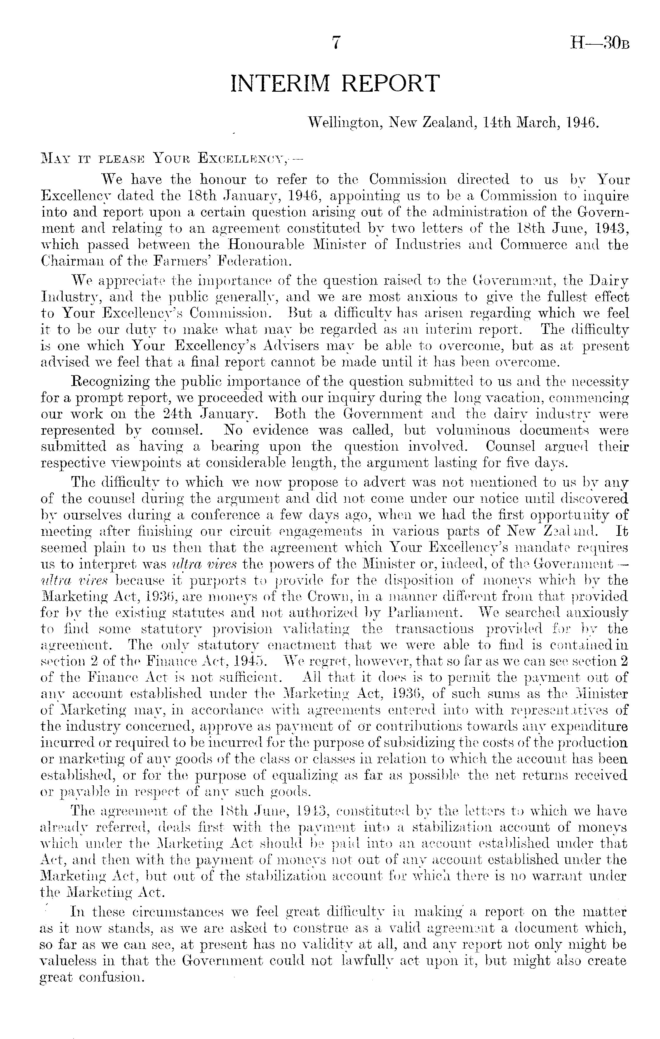 INTERIM REPORT Wellington, New Zealand, 14th March, 1946. May it please Your Excellency,— We have the honour to refer to the Commission directed to us by Your Excellency dated the 18th January, 1946, appointing us to be a Commission to inquire into and report upon a certain question arising out of the administration of the Government and relating to an agreement constituted by two letters of the 18th June, 1943, which passed between the Honourable Minister of Industries and Commerce and the Chairman of the Farmers' Federation. We appreciate the importance of the question raised to the Government, the Dairy Industry, and the public generally, and we are most anxious to give the fullest effect to Your Excellency's Commission. But a difficulty has arisen regarding which we feel it to be our duty to make what may be regarded as an interim report. The difficulty is one which Your Excellency's Advisers may be able to overcome, but as at present advised we feel that a final report cannot be made until it has been overcome. Recognizing the public importance of the question submitted to us and the necessity for a prompt report, we proceeded with our inquiry during the long vacation, commencing our work on the 24th January. Both the Government and the dairy industry were represented by counsel. No evidence was called, but voluminous documents were submitted as having a bearing upon the question involved. Counsel argued their respective viewpoints at considerable length, the argument lasting for five days. The difficulty to which we now propose to advert was not mentioned to us by any of the counsel during the argument and did not come under our notice until discovered by ourselves during a conference a few days ago, when we had the first opportunity of meeting after finishing our circuit engagements in various parts of New Zsaland. It seemed plain to us then that the agreement which Your Excellency's mandate requires us to interpret was ultra vires the powers of the Minister or, indeed, of the Government—ultra vires because it purports to provide for the disposition of moneys which by the Marketing Act, 1936, are moneys of the Crown, in a manner different from that provided for by the existing statutes and not authorized by Parliament. We searched anxiously to find some statutory provision validating the transactions provided for by the agreement. The only statutory enactment that we were able to find is contained in section 2of the Finance Act, 1945. We regret, however, that so far as we can see section 2 of the Finance Act is not sufficient. All that it does is to permit the payment out of any account established under the Marketing Act, 1936, of such sums as the Minister of Marketing may, in accordance with agreements entered into with representatives of the industry concerned, approve as payment of or contributions towards any expenditure incurred or required to be incurred for the purpose of subsidizing the costs of the production, or marketing of any goods of the class or classes in relation to which the account has been established, or for the purpose of equalizing as far as possible the net returns received or. payable in respect of any such-goods. The agreement of the 18th June, 1943, constituted by the letters to which we have already referred, deals first with the payment into a stabilization account of moneys which under the Marketing Act should be paid into an account established under that Act, and then with the payment of moneys not out of any account established under the Marketing Act, but out of the stabilization account for which there is no warrant under the Marketing Act. In these circumstances we feel great difficulty in making a report on the matter as it now stands, as we are asked to construe as a valid agreement a document which, so far as we can see, at present has no validity at all, and any report not only might be valueless in that the Government could not lawfully act upon it, but might also create great confusion.