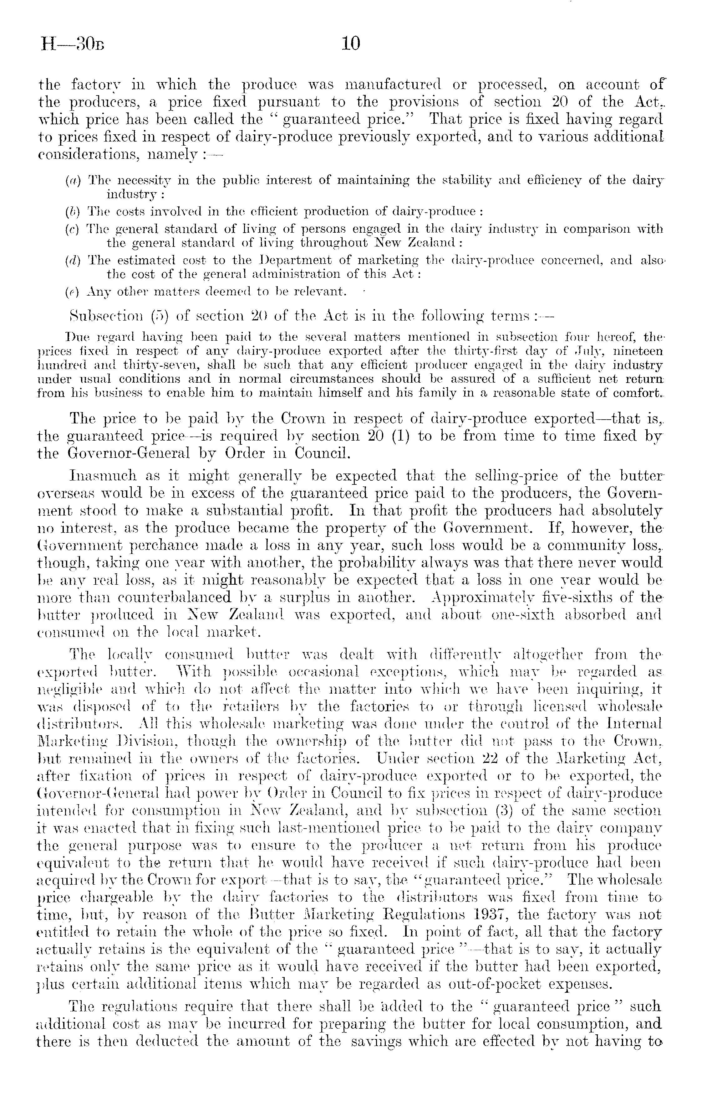 the factory in which the produce was manufactured or processed, on account of the producers, a price fixed pursuant to the provisions of section 20 of the Act r which price has been called the " guaranteed price." That price is fixed having regard to prices fixed in respect of dairy-produce previously exported, and to various additional considerations, namely:— (a) The necessity in the public interest of maintaining the stability and efficiency of the dairy industry : (b) The costs involved in the efficient production of dairy-produce : (c) The general standard of living of persons engaged in the dairy industry in comparison with the general standard of living throughout New Zealand : (d) The estimated cost to the Department of marketing the dairy-produce concerned, and also* the cost of the general administration of this Act: (e) Any other matters deemed to be relevant. Subsection (5) of section 20 of the Act is in the following terms : Due regard having been paid to the several matters mentioned in subsection four hereof, the' prices fixed in respect of any dairy-produce exported after the thirty-first day of July, nineteen hundred and thirty-seven, shall be such that any efficient producer engaged in the dairy industry under usual conditions and in normal circumstances should be assured of a sufficient net return from his business to enable him to maintain himself and his family in a reasonable state of comfort.. The price to be paid by the Crown in respect of dairy-produce exported—that is,, the guaranteed price—is required by section 20 (1) to be from time to time fixed by the Governor-General by Order in Council. Inasmuch as it might generally be expected that the selling-price of the butter overseas would be in excess of the guaranteed price paid to the producers, the Government stood to make a substantial profit. In that profit the producers had absolutely no interest, as the produce became the property of the Government. If, however, the Government perchance made a loss in any year, such loss would be a community loss,, though, taking one year with another, the probability always was that there never would be any real loss, as it might reasonably be expected that a loss in one year would be more than counterbalanced by a surplus in another. Approximately five-sixths of the butter produced in New Zealand was exported, and about one-sixth absorbed and consumed on the local market. The locally consumed butter was dealt with differently altogether from the exported butter. With possible occasional exceptions, which may be regarded as negligible and which do not affect the matter into which we have been inquiring, it was disposed of to the retailers by the factories to or through licensed wholesale distributors. All this wholesale marketing was done under the control of the Internal Marketing Division, though the ownership of the butter did not pass to the Crown, but remained in the owners of the factories. Under section 22 of the Marketing Act r after fixation of prices in respect of dairy-produce exported or to be exported, the Governor-General had power by Order in Council to fix prices in respect of dairy-produce intended for consumption in New Zealand, and by subsection (3) of the same section it was enacted that in fixing such last-mentioned price to be paid to the dairy company the general purpose was to ensure to the producer a net return from his produce equivalent to the return that he would have received if such dairy-produce had been acquired by the Crown for export —that is to say, the " guaranteed price." The wholesale price chargeable by the dairy factories to the distributors was fixed from time to time, but, by reason of the Butter Marketing Regulations 1937, the factory was not entitled to retain the whole of the price so fixed. In point of fact, all that the factory actually retains is the equivalent, of the " guaranteed price " —that is to say, it actually retains only the same price as it would have received if the butter had been exported, plus certain additional items which may be regarded as out-of-pocket expenses. The regulations require that there shall be added to the " guaranteed price " such additional cost as may be incurred for preparing the butter for local consumption, and there is then deducted the amount of the savings which are effected by not having to