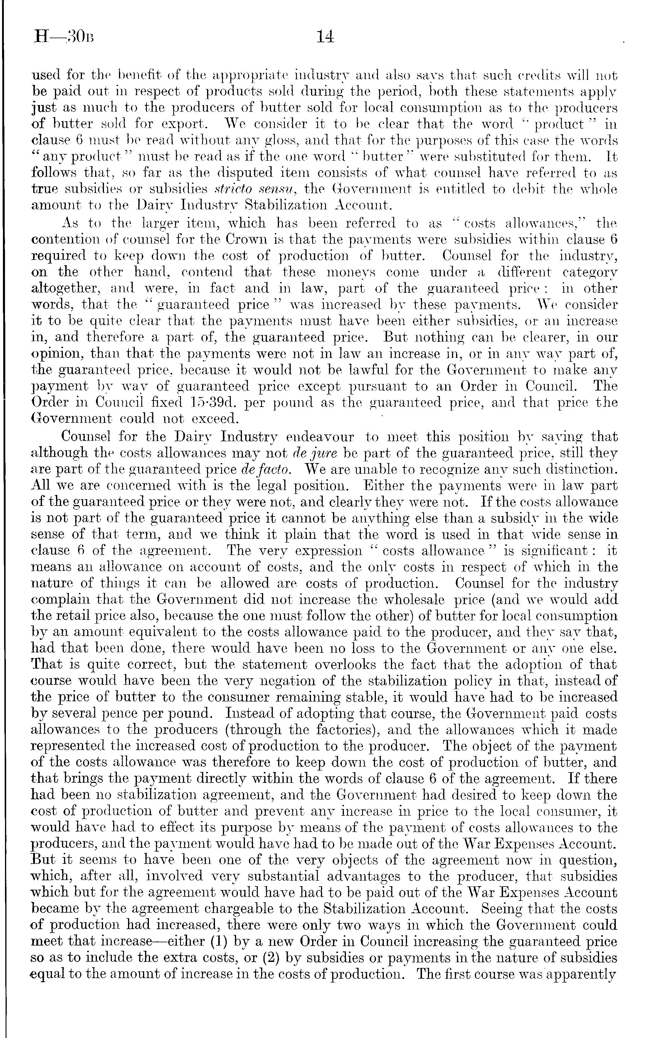 used for the benefit of the appropriate industry and also says that such credits will not be paid out in respect of products sold during the period, both these statements apply just as much to the producers of butter sold for local consumption as to the producers of butter sold for export. We consider it to be clear that the word " product " in clause 6 must be read without any gloss, and that for the purposes of this case the words " any product" must be read as if the one word " butter " were substituted for them. It follows that, so far as the disputed item consists of what counsel have referred to as true subsidies or subsidies stricto sensu, the Government is entitled to debit the whole amount to the Dairy Industry Stabilization Account. As to the larger item, which has been referred to as " costs allowances," the contention of counsel for the Crown is that the payments were subsidies within clause 6 required to keep down the cost of production of butter. Counsel for the industry, on the other hand, contend that these moneys come under a different category altogether, and were, in fact and in law, part of the guaranteed price; in other words, that the " guaranteed price " was increased by these payments. We consider it to be quite clear that the payments must have been either subsidies, or an increase in, and therefore a part of, the guaranteed price. But nothing can be clearer, in our opinion, than that the payments were not in law an increase in, or in any way part of, the guaranteed price, because it would not be lawful for the Government to make any payment by way of guaranteed price except pursuant to an Order in Council. The Order in Council fixed 15-39 d. per pound as the guaranteed price, and that price the Government could not exceed. Counsel for the Dairy Industry endeavour to meet this position by saying that although the costs allowances may not de jure be part of the guaranteed price, still they are part of the guaranteed price de facto. We are unable to recognize any such distinction. All we are concerned with is the legal position. Either the payments were in law part of the guaranteed price or they were not, and clearly they were not. If the costs allowance is not part of the guaranteed price it cannot be anything else than a subsidy in the wide sense of that term, and we think it plain that the word is used in that wide sense in clause 6of the agreement. The very expression " costs allowance "is significant: it means an allowance on account of costs, and the only costs in respect of which in the nature of things it can be allowed are costs of production. Counsel for the industry complain that the Government did not increase the wholesale price (and we would add the retail price also, because the one must follow the other) of butter for local consumption by an amount equivalent to the costs allowance paid to the producer, and they say that, had that been done, there would have been no loss to the Government or any one else. That is quite correct, but the statement overlooks the fact that the adoption of that course would have been the very negation of the stabilization policy in that, instead of the price of butter to the consumer remaining stable, it would have had to be increased by several pence per pound. Instead of adopting that course, the Government paid costs allowances to the producers (through the factories), and the allowances which it made represented the increased cost of production to the producer. The object of the payment of the costs allowance was therefore to keep down the cost of production of butter, and that brings the payment directly within the words of clause 6 of the agreement. If there had been no stabilization agreement, and the Government had desired to keep down the cost of production of butter and prevent any increase in price to the local consumer, it would have had to effect its purpose by means of the payment of costs allowances to the producers, and the payment would have had to be made out of the War Expenses Account. But it seems to have been one of the very objects of the agreement now in question, which, after all, involved very substantial advantages to the producer, that subsidies which but for the agreement would have had to be paid out of the War Expenses Account became by the agreement chargeable to the Stabilization Account. Seeing that the costs of production had increased, there were only two ways in which the Government could meet that increase—either (1) by a new Order in Council increasing the guaranteed price so as to include the extra costs, or (2) by subsidies or payments in the nature of subsidies equal to the amount of increase in the costs of production. The first course was apparently