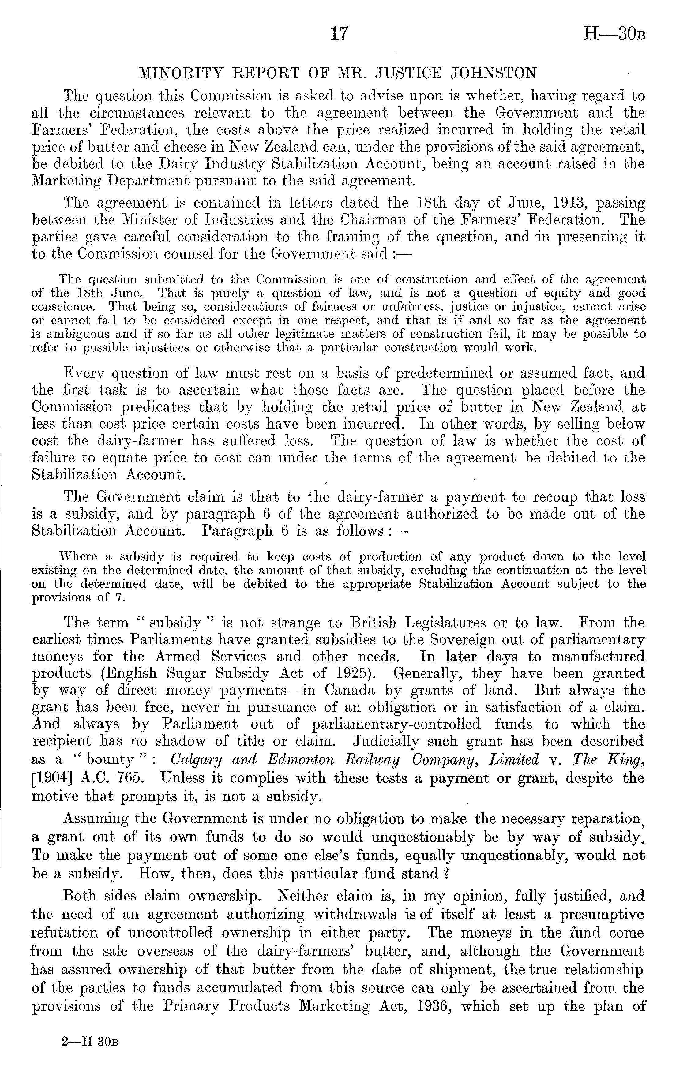 MINORITY REPORT OF MR. JUSTICE JOHNSTON The question this Commission is asked to advise upon is whether, having regard to all the circumstances relevant to the agreement between the Government and the Farmers' Federation, the costs above the price realized incurred in holding the retail price of butter and cheese in New Zealand can, under the provisions of the said agreement, be debited to the Dairy Industry Stabilization Account, being an account raised in the Marketing Department pursuant to the said agreement. The agreement is contained in letters dated the 18th day of June, 1943, passing between the Minister of Industries and the Chairman of the Farmers' Federation. The parties gave careful consideration to the framing of the question, and 'in presenting it to the Commission counsel for the Government said : The question submitted to the Commission is one of construction and effect of the agreement of the 18th June. That is purely a question of law, and is not a question of equity and good conscience. That being so, considerations of fairness or unfairness, justice or injustice, cannot arise or cannot fail to be considered except in one respect, and that is if and so far as the agreement is ambiguous and if so far as all other legitimate matters of construction fail, it may be possible to refer to possible injustices or otherwise that a particular construction would work. Every question of law must rest on a basis of predetermined or assumed fact, and the first task is to ascertain what those facts are. The question placed before the Commission predicates that by holding the retail price of butter in New Zealand at less than cost price certain costs have been incurred. In other words, by selling below cost the dairy-farmer has suffered loss. The question of law is whether the cost of failure to equate price to cost can under the terms of the agreement be debited to the Stabilization Account. The Government claim is that to the dairy-farmer a payment to recoup that loss is a subsidy, and by paragraph 6 of the agreement authorized to be made out of the Stabilization Account. Paragraph 6is as follows : —• Where a subsidy is required to keep costs of production of any product down to the level existing on the determined date, the amount of that subsidy, excluding the continuation at the level on the determined date, will be debited to the appropriate Stabilization Account subject to the provisions of 7. The term " subsidy " is not strange to British Legislatures or to law. From the earliest times Parliaments have granted subsidies to the Sovereign out of parliamentary moneys for the Armed Services and other needs. In later days to manufactured products (English Sugar Subsidy Act of 1925). Generally, they have been granted by way of direct money payments —in Canada by grants of land. But always the grant has been free, never in pursuance of an obligation or in satisfaction of a claim. And always by Parliament out of parliamentary-controlled funds to which the recipient has no shadow of title or claim. Judicially such grant has been described as a bounty" : Calgary and Edmonton Railway Company, Limited v. The King, [1904] A.C. 765. Unless it complies with these tests a payment or grant, despite the motive that prompts it, is not a subsidy. Assuming the Government is under no obligation to make the necessary reparation a grant out of its own funds to do so would unquestionably be by way of subsidy. To make the payment out of some one else's funds, equally unquestionably, would not be a subsidy. How, then, does this particular fund stand ? Both sides claim ownership. Neither claim is, in my opinion, fully justified, and the need of an agreement authorizing withdrawals is of itself at least a presumptive refutation of uncontrolled ownership in either party. The moneys in the fund come from the sale overseas of the dairy-farmers' blotter, and, although the Government has assured ownership of that butter from the date of shipment, the true relationship of the parties to funds accumulated from this source can only be ascertained from the provisions of the Primary Products Marketing Act, 1936, which set up the plan of 2—H 30b
