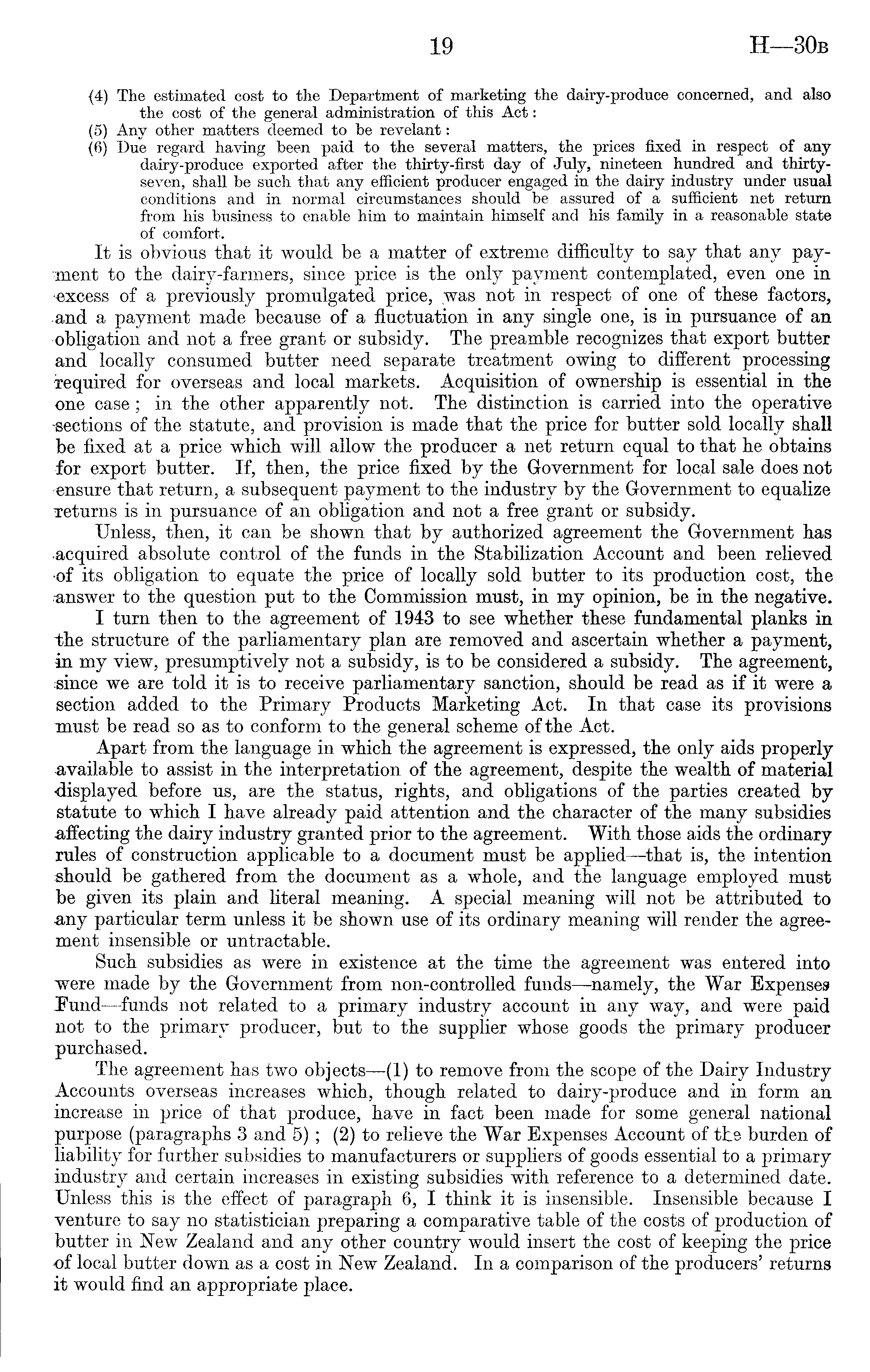{4) The estimated cost to the Department of marketing the dairy-produce concerned, and also the cost of the general administration of this Act: (5) Any other matters deemed to be revelant: (6) Due regard having been paid to the several matters, the prices fixed in respect of any dairy-produce exported after the thirty-first day of July, nineteen hundred and thirtyseven, shall be such that any efficient producer engaged in the dairy industry under usual conditions and in normal circumstances should be assured of a sufficient net return from his business to enable him to maintain himself and his family in a reasonable state of comfort. It is obvious that it would be a matter of extreme difficulty to say that any payment to the dairy-farmers, since price is the only payment contemplated, even one in -excess of a previously promulgated price, was not in respect of one of these factors, and a payment made because of a fluctuation in any single one, is in pursuance of an ■obligation and not a free grant or subsidy. The preamble recognizes that export butter and locally consumed butter need separate treatment owing to different processing required for overseas and local markets. Acquisition of ownership is essential in the one case; in the other apparently not. The distinction is carried into the operative -sections of the statute, and provision is made that the price for butter sold locally shall be fixed at a price which will allow the producer a net return equal to that he obtains for export butter. If, then, the price fixed by the Government for local sale does not •ensure that return, a subsequent payment to the industry by the Government to equalize Teturns is in pursuance of an obligation and not a free grant or subsidy. Unless, then, it can be shown that by authorized agreement the Government has ■acquired absolute control of the funds in the Stabilization Account and been relieved -of its obligation to equate the price of locally sold butter to its production cost, the -answer to the question put to the Commission must, in my opinion, be in the negative. I turn then to the agreement of 1943 to see whether these fundamental planks in the structure of the parliamentary plan are removed and ascertain whether a payment, in my view, presumptively not a subsidy, is to be considered a subsidy. The agreement, since we are told it is to receive parliamentary sanction, should be read as if it were a section added to the Primary Products Marketing Act. In that case its provisions must be read so as to conform to the general scheme of the Act. Apart from the language in which the agreement is expressed, the only aids properly available to assist in the interpretation of the agreement, despite the wealth of material •displayed before us, are the status, rights, and obligations of the parties created by statute to which I have already paid attention and the character of the many subsidies affecting the dairy industry granted prior to the agreement. With those aids the ordinary rules of construction applicable to a document must be applied —that is, the intention should be gathered from the document as a whole, and the language employed must be given its plain and literal meaning. A special meaning will not be attributed to any particular term unless it be shown use of its ordinary meaning will render the agreement insensible or untractable. Such subsidies as were in existence at the time the agreement was entered into were made by the Government from non-controlled funds—namely, the War Expenses Pund —funds not related to a primary industry account in any way, and were paid not to the primary producer, but to the supplier whose goods the primary producer purchased. The agreement has two objects—(l) to remove from the scope of the Dairy Industry Accounts overseas increases which, though related to dairy-produce and in form an increase in price of that produce, have in fact been made for some general national purpose (paragraphs 3 and 5); (2) to relieve the War Expenses Account of the burden of liability for further subsidies to manufacturers or suppliers of goods essential to a primary industry and certain increases in existing subsidies with reference to a determined date. Unless this is the effect of paragraph 6, I think it is insensible. Insensible because I venture to say no statistician preparing a comparative table of the costs of production of butter in New Zealand and any other country would insert the cost of keeping the price of local butter down as a cost in New Zealand. In a comparison of the producers' returns it would find an appropriate place.