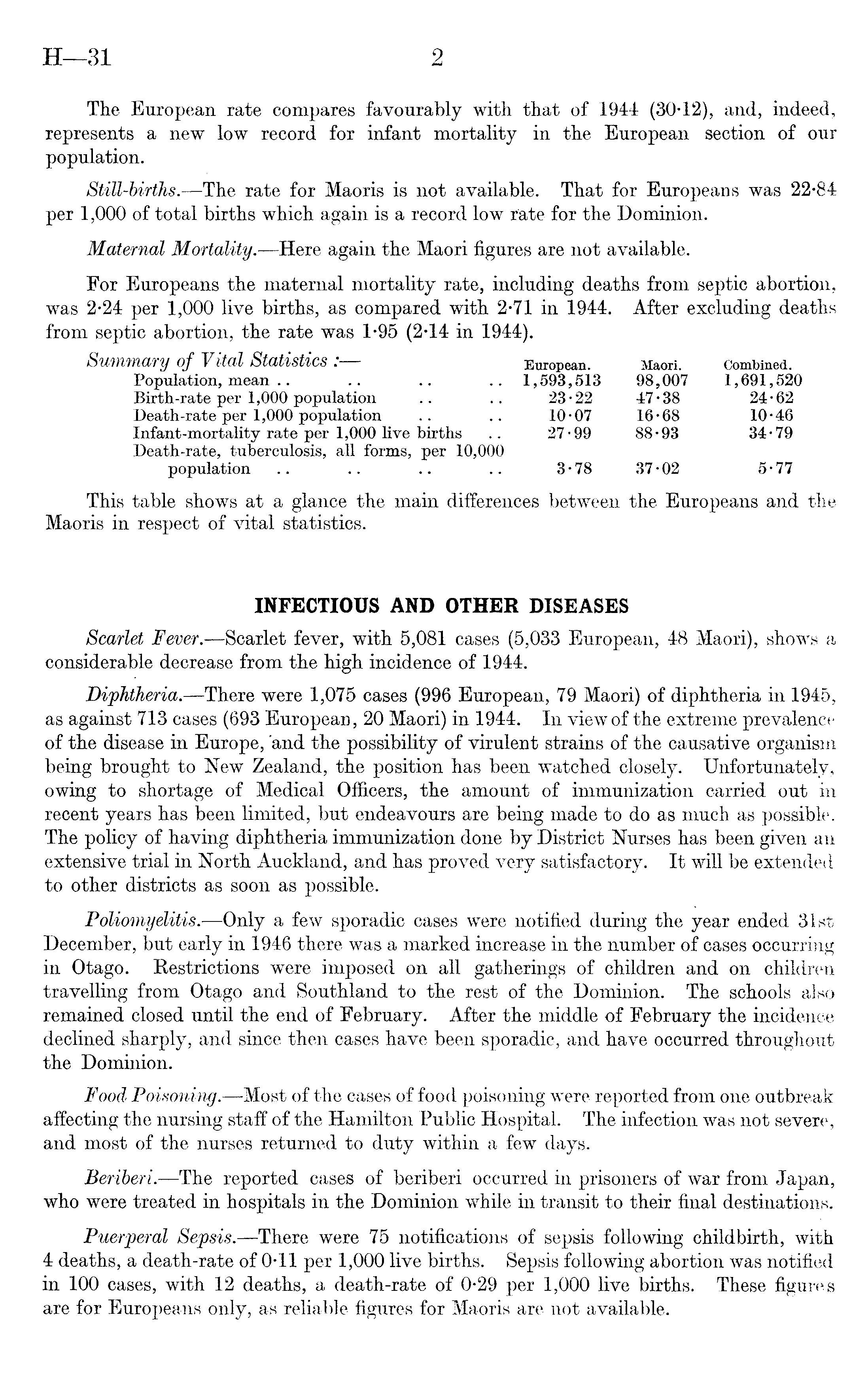 The European rate compares favourably with that of 1944 (30-12), and, indeed, represents a new low record for infant mortality in the European section of our population. Still-births.—The rate for Maoris is not available. That for Europeans was 22-84 per 1,000 of total births which again is a record low r'ate for the Dominion. Maternal Mortality.—Here again the Maori figures are not available. For Europeans the maternal mortality rate, including deaths from septic abortion, was 2-24 per 1,000 live births, as compared with 2-71 in 1944. After excluding deaths from septic abortion, the rate was 1-95 (2-14 in 1944). Summary of Vital Statistics European. Maori. Combined. Population, mean .. .. .. .. 1,593,513 98,007 1,691,520 Birth-rate per 1,000 population .. .. 23*22 47-38 24-62 Death-rate per 1,000 population .. .. 10-07 16-68 10-46 Infant-mortality rate per 1,000 live births .. 27-99 88-93 34-79 Death-rate, tuberculosis, all forms, per 10,000 population .. .. .. .. 3-78 37-02 5-77 This table shows at a glance the main differences between the Europeans and the Maoris in respect of vital statistics. INFECTIOUS AND OTHER DISEASES Scarlet Fever. —Scarlet fever, with 5,081 cases (5,033 European, 48 Maori), shows a considerable decrease from the high incidence of 1944. Diphtheria.—There were 1,075 cases (996 European, 79 Maori) of diphtheria in 1945, as against 713 cases (693 European, 20 Maori) in 1944. In view of the extreme prevalence of the disease in Europe, "and the possibility of virulent strains of the causative organism being brought to New Zealand, the position has been watched closely. Unfortunately, owing to shortage of Medical Officers, the amount of immunization carried out in recent years has been limited, but endeavours are being made to do as much as possible. The policy of having diphtheria immunization done by District Nurses has been given an extensive trial in North Auckland, and has proved very satisfactory. It will be extended to other districts as soon as possible. Poliomyelitis. —Only a few sporadic cases were notified during the year ended 31st December, but early in 1946 there was a marked increase in the number of cases occurring in Otago. Restrictions were imposed on all gatherings of children and on children travelling from Otago and Southland to the rest of the Dominion. The schools also remained closed until the end of February. After the middle of February the incidence declined sharply, and since then cases have been sporadic, and have occurred throughout the Dominion. Food Poisoning. —Most of the cases of food poisoning were reported from one outbreak affecting the nursing staff of the Hamilton Public Hospital. The infection was not severe, and most of the nurses returned to duty within a few days. Beriberi. —The reported cases of beriberi occurred in prisoners of war from Japan, who were treated in hospitals in the Dominion while in transit to their final destinations. Puerperal Sepsis.—There were 75 notifications of sepsis following childbirth, with 4 deaths, a death-rate of 0-11 per 1,000 live births. Sepsis following abortion was notified in 100 cases, with 12 deaths, a death-rate of 0-29 per 1,000 live births. These figures are for Europeans only, as reliable figures for Maoris are not available.