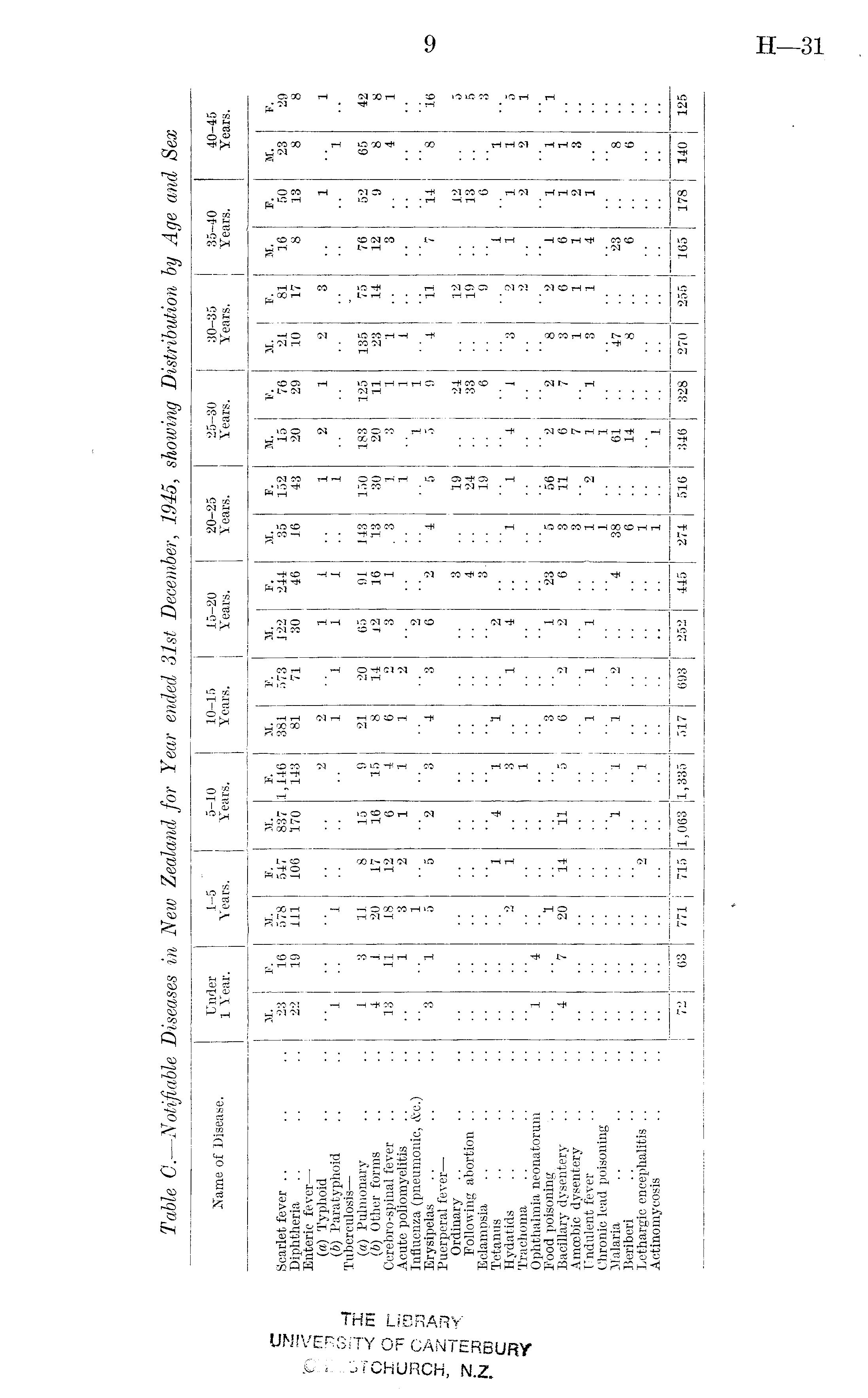 Table C.—Notifiable Diseases in New Zealand for Year ended 31st December, 1945, showing Distribution by Age and Sex