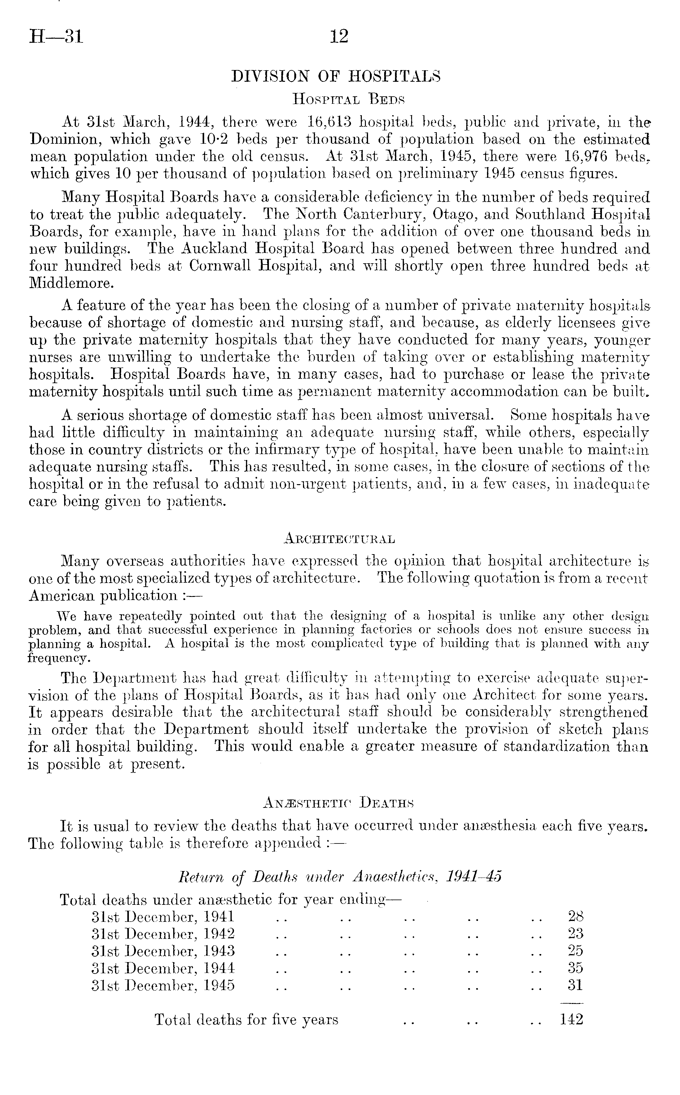 DIVISION OF HOSPITALS Hospital Beds At 31st March, 1944, there were 16,613 hospital beds, public and private, in the Dominion, which gave 10*2 beds per thousand of population based on the estimated mean population under the old census. At 31st March, 1945, there were 16,976 beds, which gives 10 per thousand of population based on preliminary 1945 census figures. Many Hospital Boards have a considerable deficiency in the number of beds required to treat the public adequately. The North Canterbury, Otago, and Southland Hospital Boards, for example, have in hand plans for the addition of over one thousand beds in new buildings. The Auckland Hospital Board has opened between three hundred and four hundred beds at Cornwall Hospital, and will shortly open three hundred beds at Middlemore. A feature of the year has been the closing of a number of private maternity hospitals because of shortage of domestic and nursing staff, and because, as elderly licensees give up the private maternity hospitals that they have conducted for many years, younger nurses are unwilling to undertake the burden of taking over or establishing maternity hospitals. Hospital Boards have, in many cases, had to purchase or lease the private maternity hospitals until such time as permanent maternity accommodation can be built. A serious shortage of domestic staff has been almost universal. Some hospitals have had little difficulty in maintaining an adequate nursing staff, while others, especially those in country districts or the infirmary type of hospital, have been unable to maintain adequate nursing staffs. This has resulted, in some cases, in the closure of sections of the hospital or in the refusal to admit non-urgent patients, and, in a few cases, in inadequate care being given to patients. Architectural Many overseas authorities have expressed the opinion that hospital architecture is one of the most specialized types of architecture. The following quotation is from a recent American publication : We have repeatedly pointed out that the designing of a hospital is unlike any other design problem, and that successful experience in planning factories or schools does not ensure success in planning a hospital. A hospital is the most complicated type of building that is planned with any frequency. The Department has had great difficulty in attempting to exercise adequate supervision of the plans of Hospital Boards, as it has had only one Architect for some years. It appears desirable that the architectural staff should be considerably strengthened in order that the Department should itself undertake the provision of sketch plans for all hospital building. This would enable a greater measure of standardization than is possible at present. Anaesthetic Deaths It is usual to review the deaths that have occurred under anaesthesia each five years. The following table is therefore appended : Return of Deaths under Anaesthetics, 1941-45 Total,deaths under anaesthetic for year ending—31st December, 1941 .. .. .. .. 28 31st December, 1942 .. .. .. .. 23 31st December, 1943 .. .. .. .. 25 31st December, 1944 .. .. .. .. 35 31st December, 1945 .. .. .. .. 31 Total deaths for five years .. .. .. 142