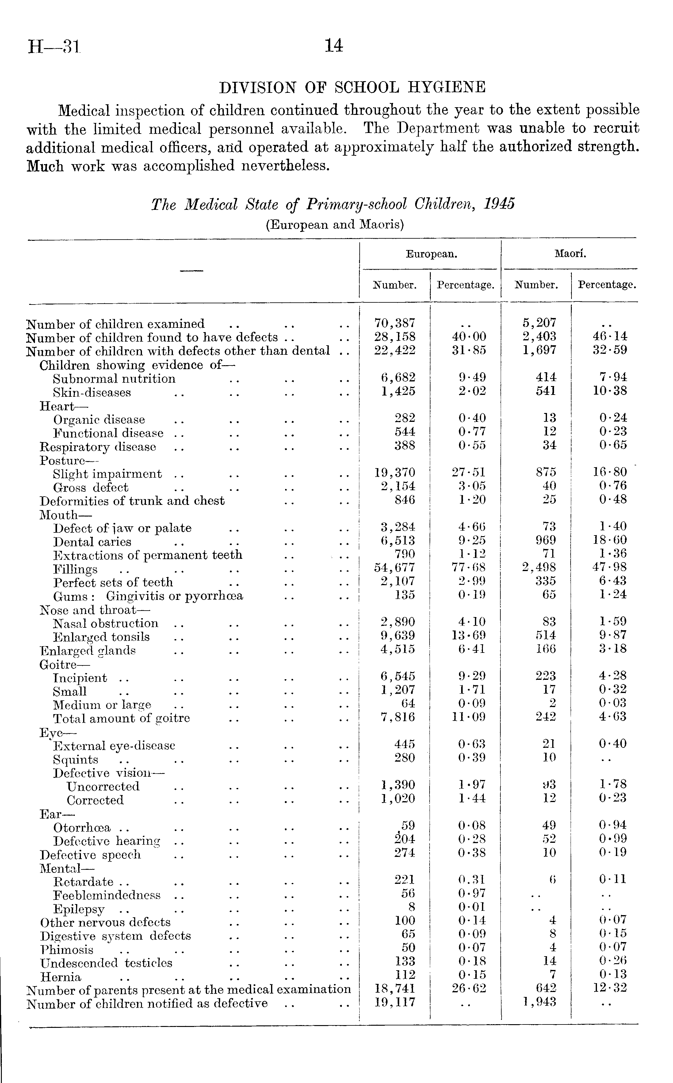 (European and Maoris) European. Maori. Number. Percentage. Number. Percentage. Number of children examined 70,387 5,207 Number of children found to have defects 28,158 40 00 2,403 46-14 Number of children with defects other than dental .. 22,422 31 85 1,697 32-59 Children showing evidence of — Subnormal nutrition 6,682 9 49 414 7-94 Skin-diseases 1,425 2 02 541 10-38 Heart— Organic disease 282 0 40 13 0-24 Functional disease 544 0 77 12 0-23 Respiratory disease 388 0 55 34 0-65 Posture — Slight impairment 19,370 27 51 875 16-80 ' Gross defect 2,154 3 05 40 0-76 Deformities of trunk and chest 846 1 20 25 0-48 Mouth — Defect of] aw or palate 3,284 4 66 73 1-40 Dental caries 6,513 9 25 969 18-60 Extractions of permanent teeth .. ... 790 1 12 71 1-36 Fillings 54,677 77 68 2,498 47-98 Perfect sets of teeth 2,107 2 99 335 6-43 Gums : Gingivitis or pyorrhoea 135 0 19 65 1-24 Nose and throat — Nasal obstruction 2,890 4 10 83 1-59 Enlarged tonsils 9,639 13 69 514 9-87 Enlarged glands 4,515 6 41 166 3-18 Goitre — Incipient 6,545 9 29 223 4-28 Small 1,207 1 71 17 0-32 Medium or large 64 0 09 2 0-03 Total amount of goitre 7,816 11 09 242 4-63 Eye — External eye-disease 445 0 63 21 0-40 Squints 280 0 39 10 Defective vision— Uncorrected 1,390 1 97 y3 1-78 Corrected 1,020 1 44 12 0-23 Ear — Otorrhoea 59 0 08 49 0-94 Defective hearing 204 0 28 52 0-99 Defective speech 274 0 38 10 0-19 Mental— Retardate 221 0 31 6 0-11 Feeblemindedness 56 0 97 Epilepsy 8 0 01 0-07 Other nervous defects 100 0 14 4 Digestive system defects 65 0 09 8 0-15 Phimosis 50 0 07 4 0-07 Undescended testicles 133 0 18 14 0-26 Hernia 112 0 15 7 0-13 Number of parents present at the medical examination 18,741 26 62 642 12-32 Number of children notified as defective 19,117 1,943