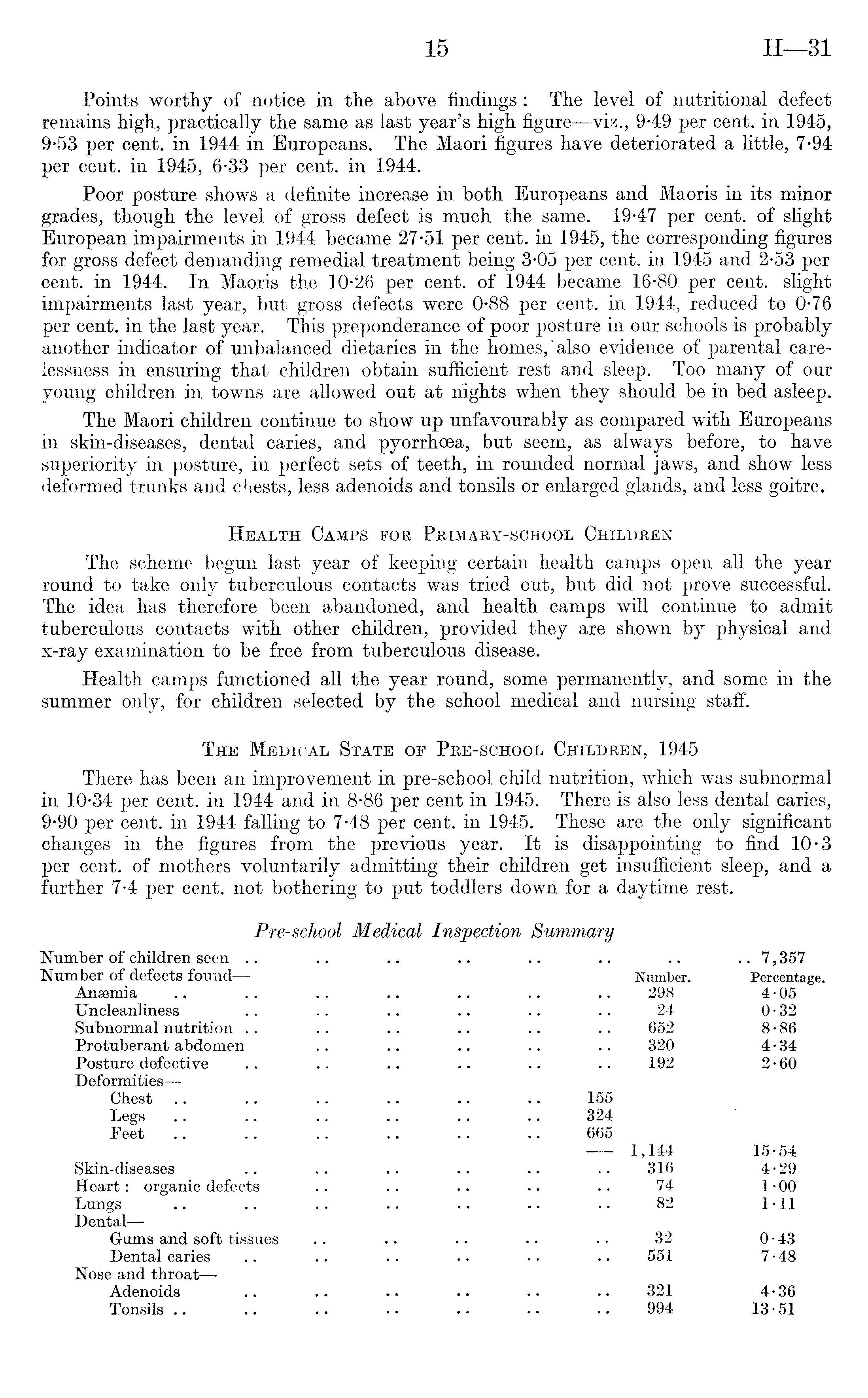 Points worthy of notice in the above findings : The level of nutritional defect remains high, practically the same as last year's high figure—viz., 949 per cent, in 1945, 9-53 per cent, in 1944 in Europeans. The Maori figures have deteriorated a little, 7-94 per cent, in 1945, 6-33 per cent, in 1944. Poor posture shows a definite increase in both Europeans and Maoris in its minor grades, though the level of gross defect is much the same. 19-47 per cent, of slight European impairments in 1944 became 27*51 per cent, in 1945, the corresponding figures for gross defect demanding remedial treatment being 3-05 per cent, in 1945 and 2-53 per cent, in 1944. In Maoris the 10-26 per cent, of 1944 became 16-80 per cent, slight impairments last year, but gross defects were 0-88 per cent, in 1944, reduced to 0-76 per cent, in the last year. This preponderance of poor posture in our schools is probably another indicator of unbalanced dietaries in the homes,"also evidence of parental carelessness in ensuring that children obtain sufficient rest and sleep. Too many of our young children in towns are allowed out at nights when they should be in bed asleep. The Maori children continue to show up unfavourably as compared with Europeans in skin-diseases, dental caries, and pyorrhoea, but seem, as always before, to have superiority in posture, in perfect sets of teeth, in rounded normal jaws, and show less deformed trunks and chests, less adenoids and tonsils or enlarged glands, and less goitre. Health Camps foe Primary-school Children The scheme begun last year of keeping certain health camps open all the year round to take only tuberculous contacts was tried cut, but did not prove successful. The idea has therefore been abandoned, and health camps will continue to admit tuberculous contacts with other children, provided they are shown by physical and x-ray examination to be free from tuberculous disease. Health camps functioned all the year round, some permanently, and some in the summer only, for children selected by the school medical and nursing staff. The Medical State of Pre-school Children, 1945 There has been an improvement in pre-school child nutrition, which was subnormal in 10-34 per cent, in 1944 and in 8-86 per cent in 1945. There is also less dental caries, 9-90 per cent, in 1944 falling to 7-48 per cent, in 1945. These are the only significant changes in the figures from the previous year. It is disappointing to find 10 - 3 per cent, of mothers voluntarily admitting their children get insufficient sleep, and a further 7-4 per cent, not bothering to put toddlers down for a daytime rest. Pre-school Medical Inspection Summary Number of children seen .. .. .. .. .. .. .. .. 7,357 Number of defects found— Number. Percentage. Anaemia .. . . .. .. .. .. .. 298 4 • 05 Uncleanliness .. .. .. .. .. .. 24 0-32 Subnormal nutrition .. .. .. .. .. .. 652 8• 86 Protuberant abdomen .. .. .. .. .. 320 4 • 34 Posture defective .. .. .. .. .. .. 192 2-60 Deformities — Chest .. .. .. .. .. .. 155 Legs .. .. " .. .. .. .. 324 Feet .. .. .. .. .. .. 665 1,144 15-54 Skin-diseases .. .. .. .. .. .. 316 4-29 Heart: organic defects .. .. .. .. .. 74 1-00 Lungs .. .. .. .. .. .. .. 82 1-11 Dental—■ Gums and soft tissues .. .. .. .. .. 32 0-43 Dental caries .. .. .. .. •• .. 551 7-48 Nose and throat— Adenoids .. .. .. .. .. .. 321 4-36 Tonsils .. .. .. .. .. •• .. 994 13-51